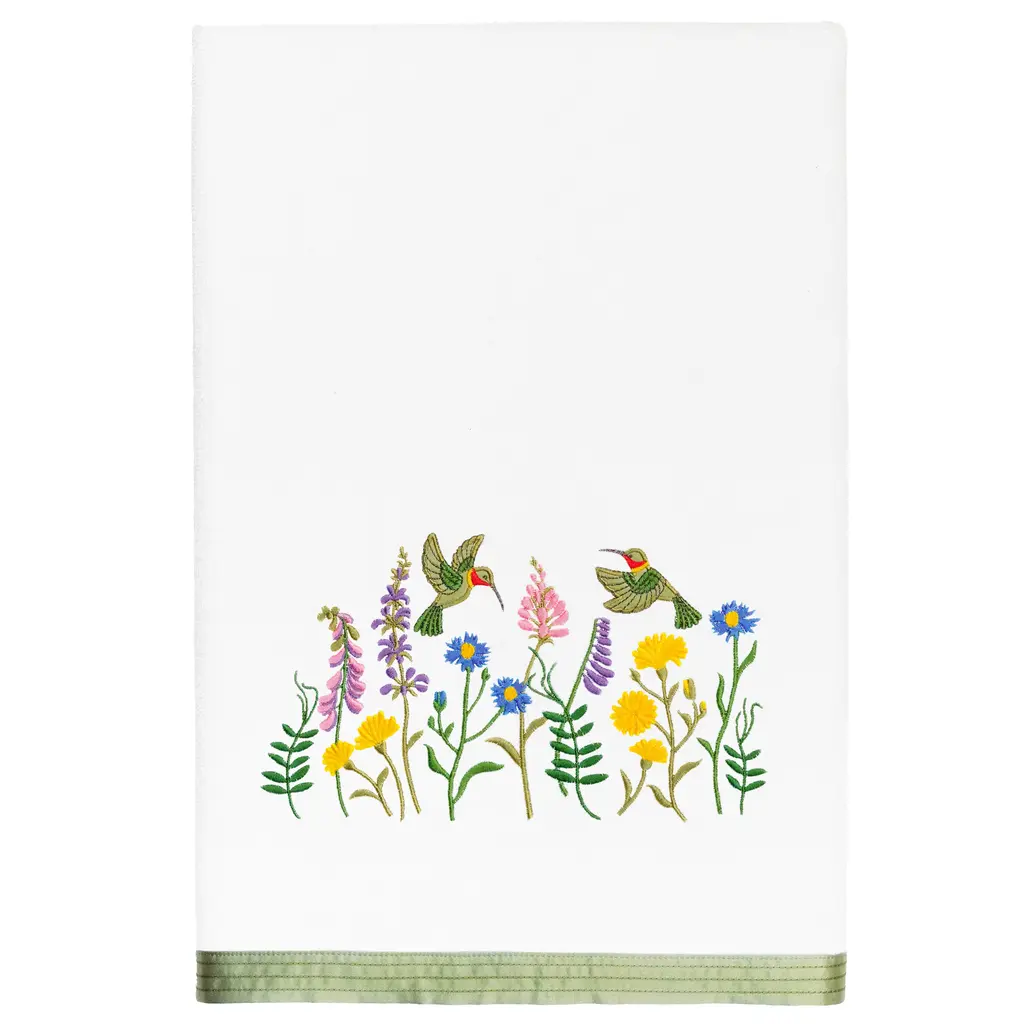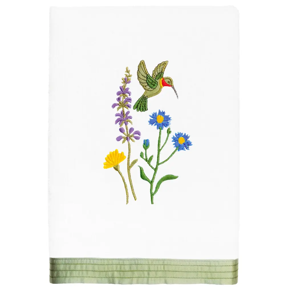 Your bath decor is not complete without a set of luxurius embroidered towels by Authentic Hotel and Spa for the comfort of your family and guests. The Hada towels feature applique hummingbirds, dancing among wild flowers and are trimmed with a lustrous taffeta border. Cloud soft and super absorbent, these luxurious, durable towels keep their plush appearance after washing. This collection is available in 8 elegant colors: White, Beige, Blush, Aqua, Silver, Cocoa, Charcoal and Marine. The Hada Towel Collection brings cheerful spirit and richness to your home decor and makes a great gift. Note: Due to variations in computer screen resolutions, slight color differences may exist between images provided and actual product.Embroidered Hummingbird and Flower design100% Premium Turkish CottonSuperbly absorbent and quick dryingAvailable in 8 elegant colorsMachine wash cold, No bleach, line dry or dry cleanSet includes 1 bath towel (27" x 54") / 1 hand towel (16" x 30") / 1 fingertip towel (11" x 18")Made in TurkeyProudly Embellished in USA