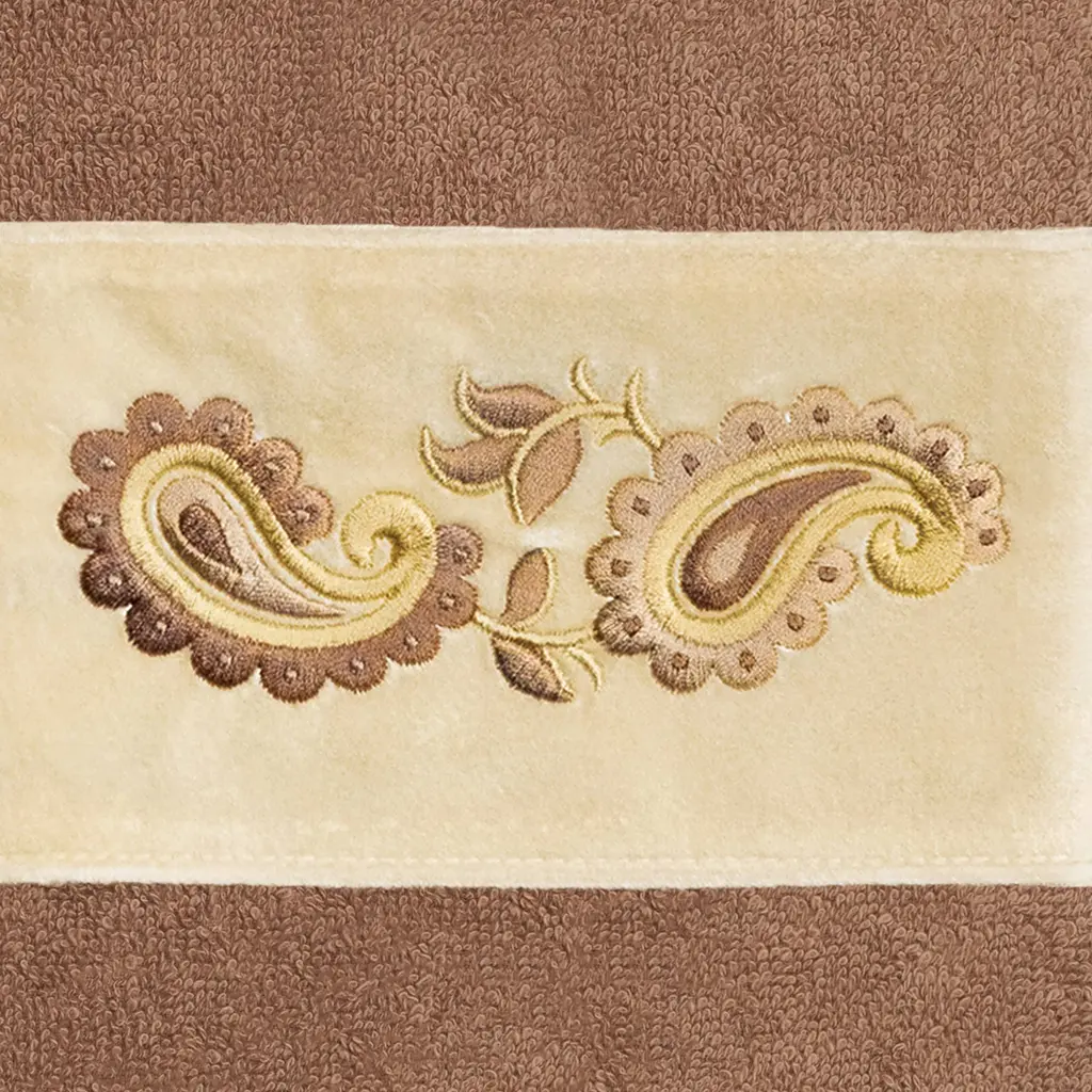 Your decorations are not complete without elegant embroidered towels by Authentic Hotel and Spa for the comfort of your family and guests. The Mackenzie towels feature intricate paisley embroidery on a soft velvet border. Cloud soft and super absorbent, these luxurious, durable towels keep their plush appearance after washing. This collection is available in 8 elegant colors: White, Cream, Latte, Tea Rose, Teal, Navy, Light Gray and Dark Gray. The Mackenzie Towel Collection brings a romantic spirit and richness to your home decor and makes a great gift. Note: Due to variations in computer screen resolutions, slight color differences may exist between images provided and actual product.Embroidered Paisley design100% Premium Turkish CottonSuperbly absorbent and quick dryingAvailable in 8 elegant colorsMachine wash cold, No bleach, line dry or dry cleanSet includes 2 hand towels (16" x 30")Made in TurkeyProudly Embellished in USA