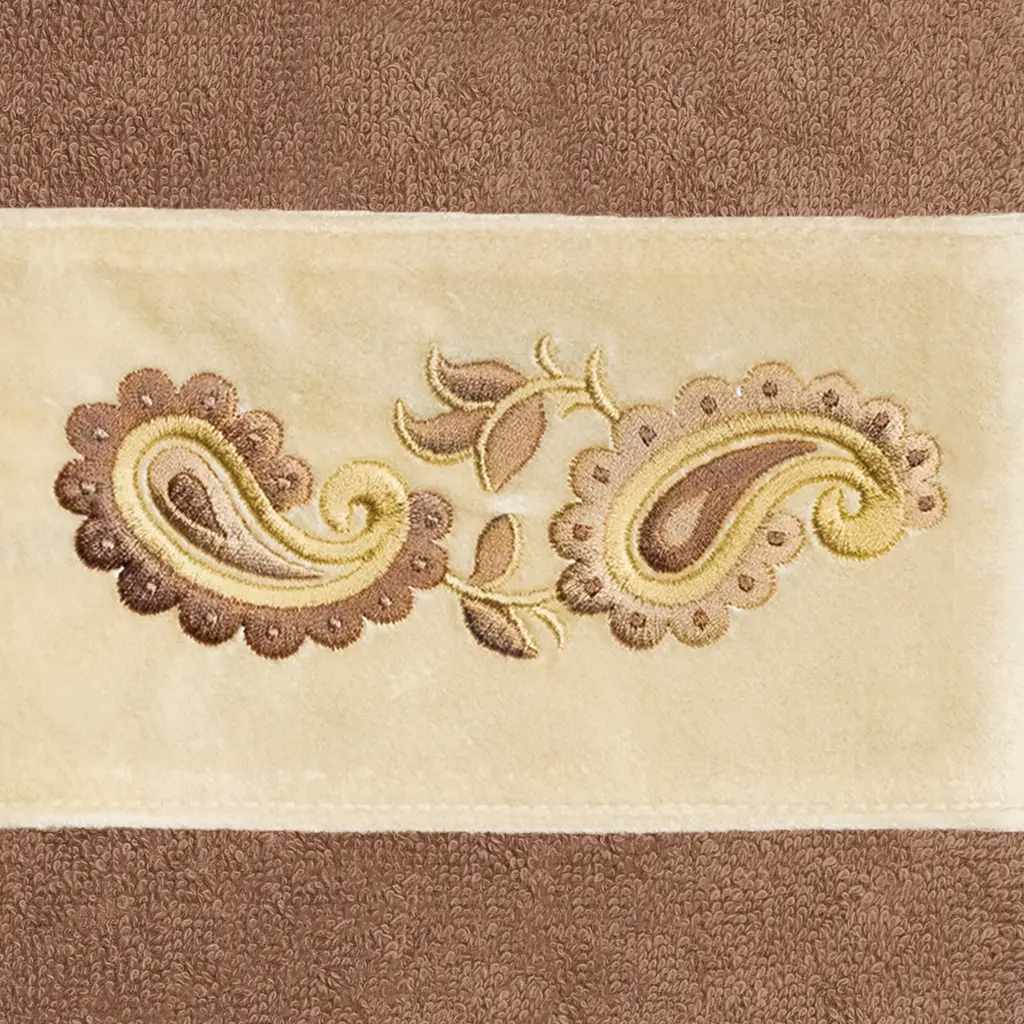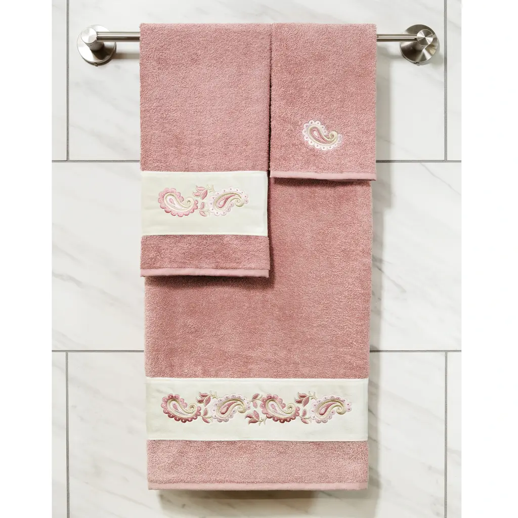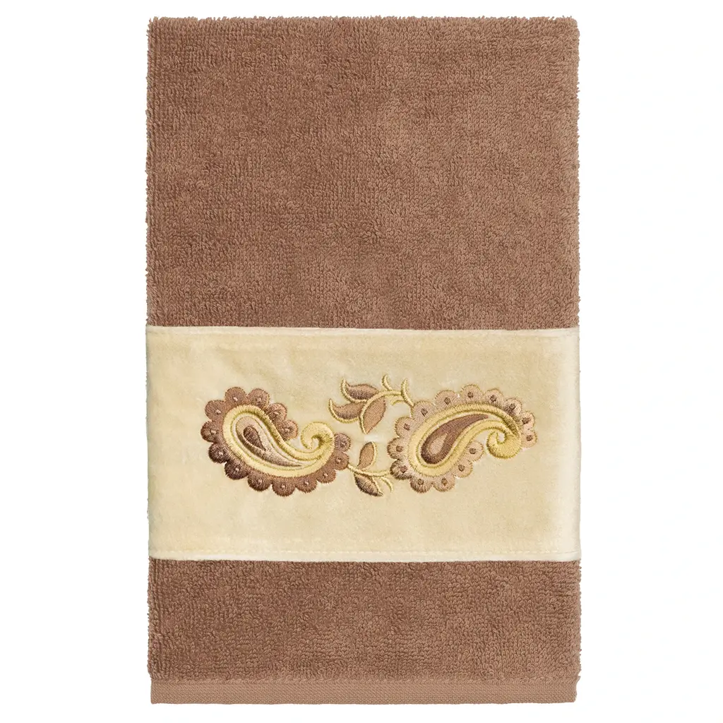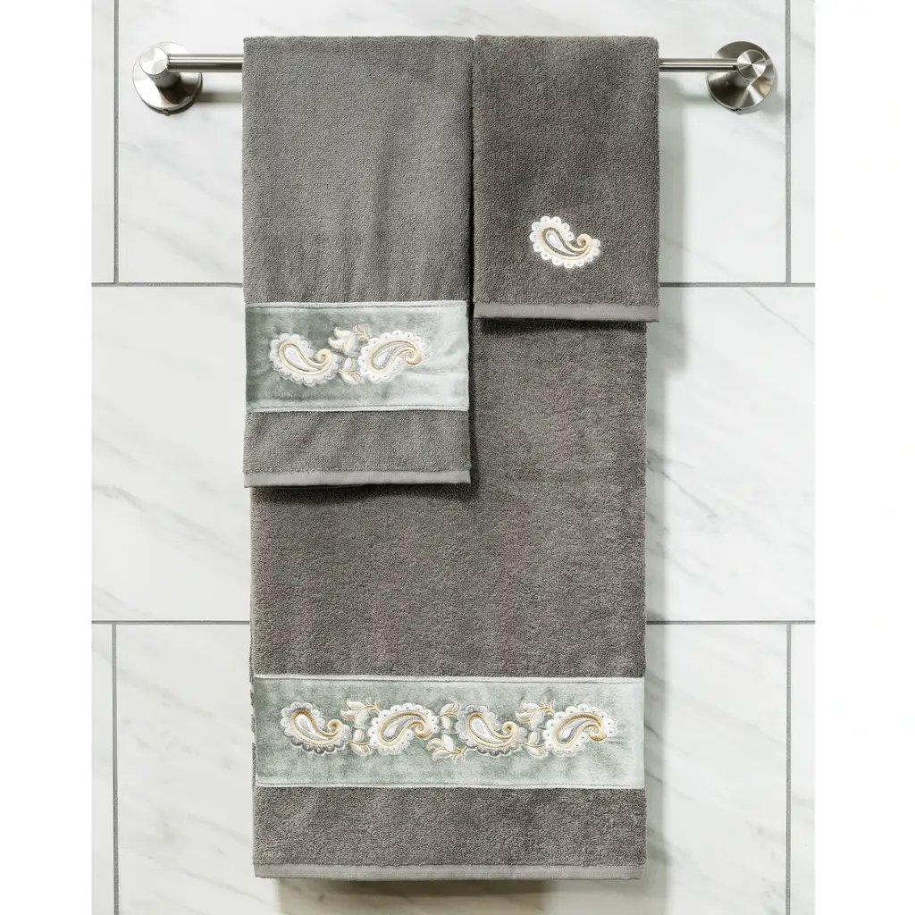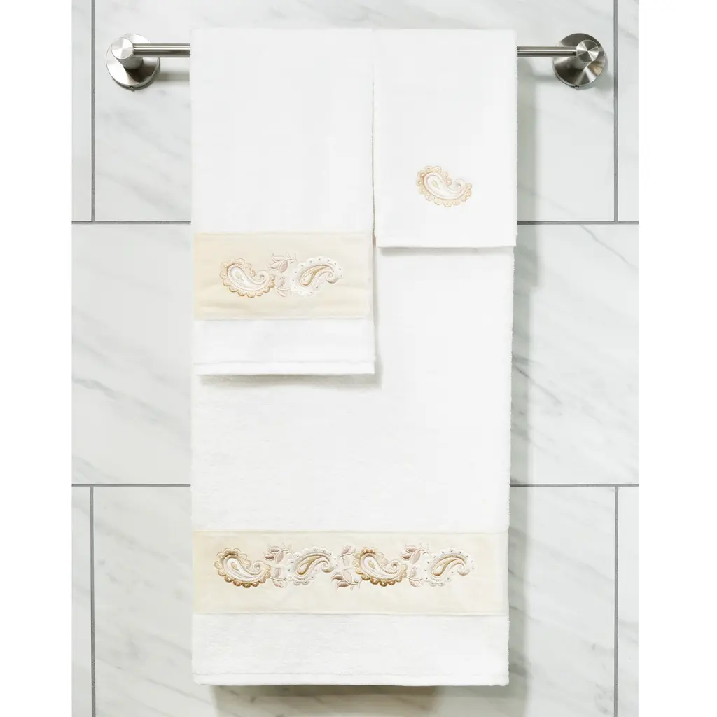 Your decorations are not complete without elegant embroidered towels by Authentic Hotel and Spa for the comfort of your family and guests. The Mackenzie towels feature intricate paisley embroidery on a soft velvet border. Cloud soft and super absorbent, these luxurious, durable towels keep their plush appearance after washing. This collection is available in 8 elegant colors: White, Cream, Latte, Tea Rose, Teal, Navy, Light Gray and Dark Gray. The Mackenzie Towel Collection brings a romantic spirit and richness to your home decor and makes a great gift. Note: Due to variations in computer screen resolutions, slight color differences may exist between images provided and actual product.Embroidered Paisley design100% Premium Turkish CottonSuperbly absorbent and quick dryingAvailable in 8 elegant colorsMachine wash cold, No bleach, line dry or dry cleanSet includes 2 hand towels (16" x 30")Made in TurkeyProudly Embellished in USA