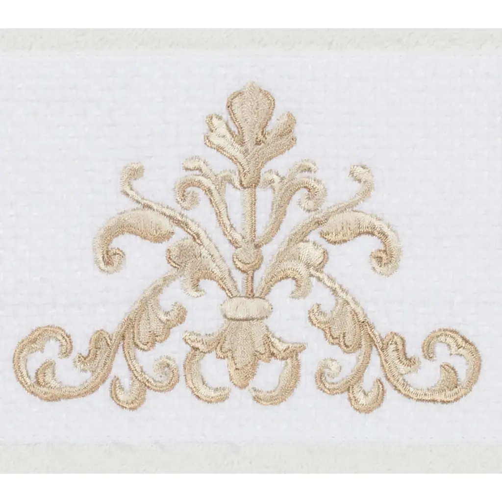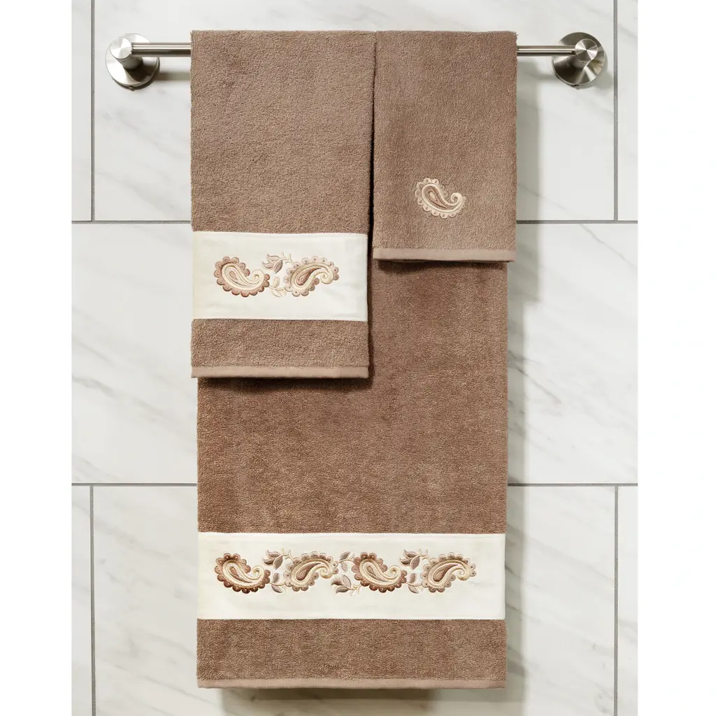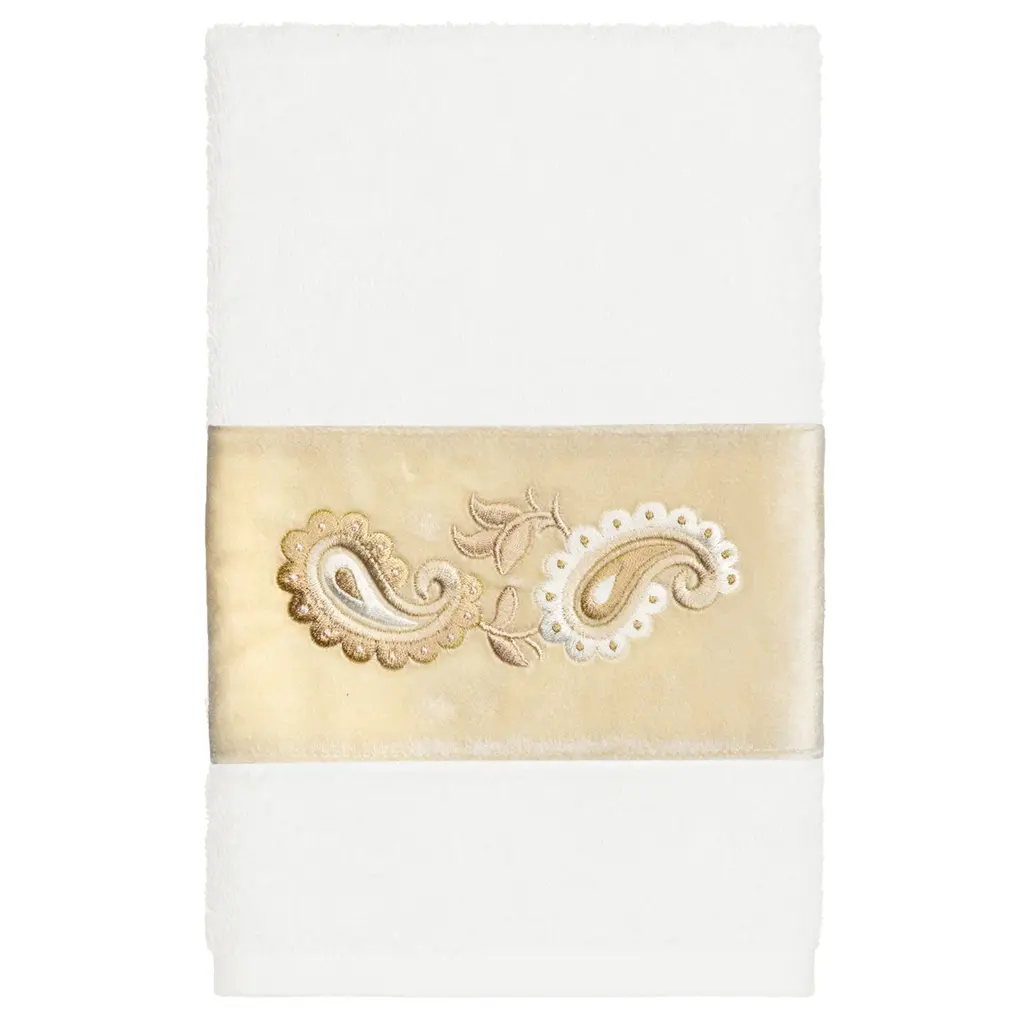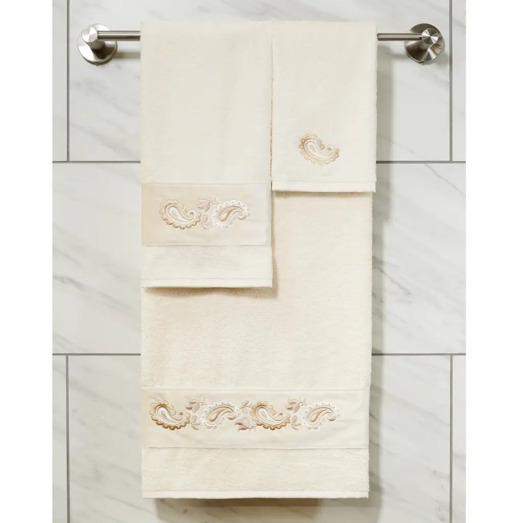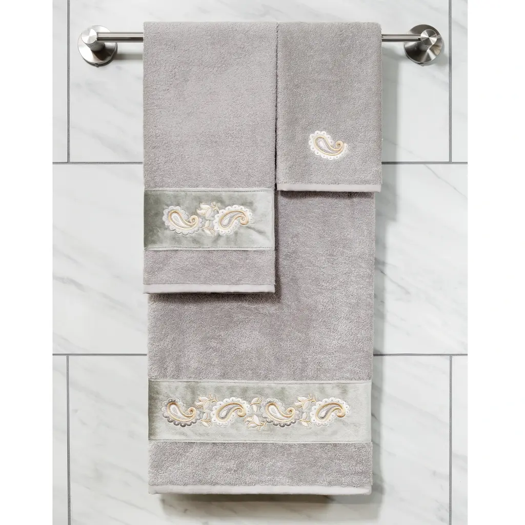 Your decorations are not complete without elegant embroidered towels by Authentic Hotel and Spa for the comfort of your family and guests. The Mackenzie towels feature intricate paisley embroidery on a soft velvet border. Cloud soft and super absorbent, these luxurious, durable towels keep their plush appearance after washing. This collection is available in 8 elegant colors: White, Cream, Latte, Tea Rose, Teal, Navy, Light Gray and Dark Gray. The Mackenzie Towel Collection brings a romantic spirit and richness to your home decor and makes a great gift. Note: Due to variations in computer screen resolutions, slight color differences may exist between images provided and actual product.Embroidered Paisley design100% Premium Turkish CottonSuperbly absorbent and quick dryingAvailable in 8 elegant colorsMachine wash cold, No bleach, line dry or dry cleanSet includes 2 hand towels (16" x 30")Made in TurkeyProudly Embellished in USA