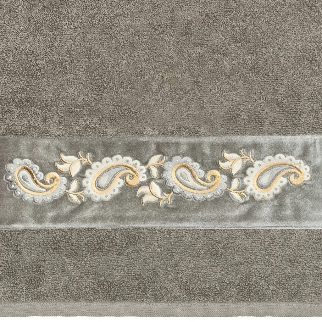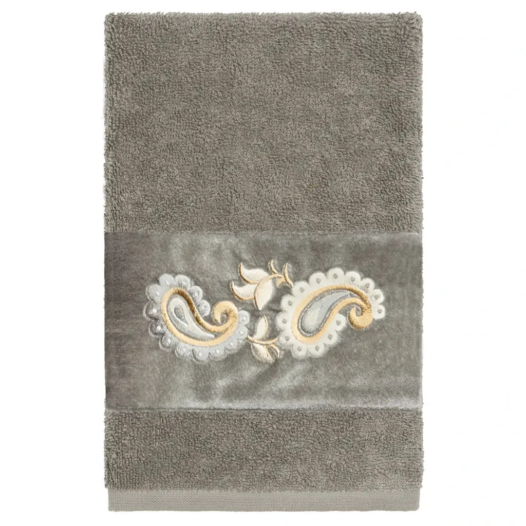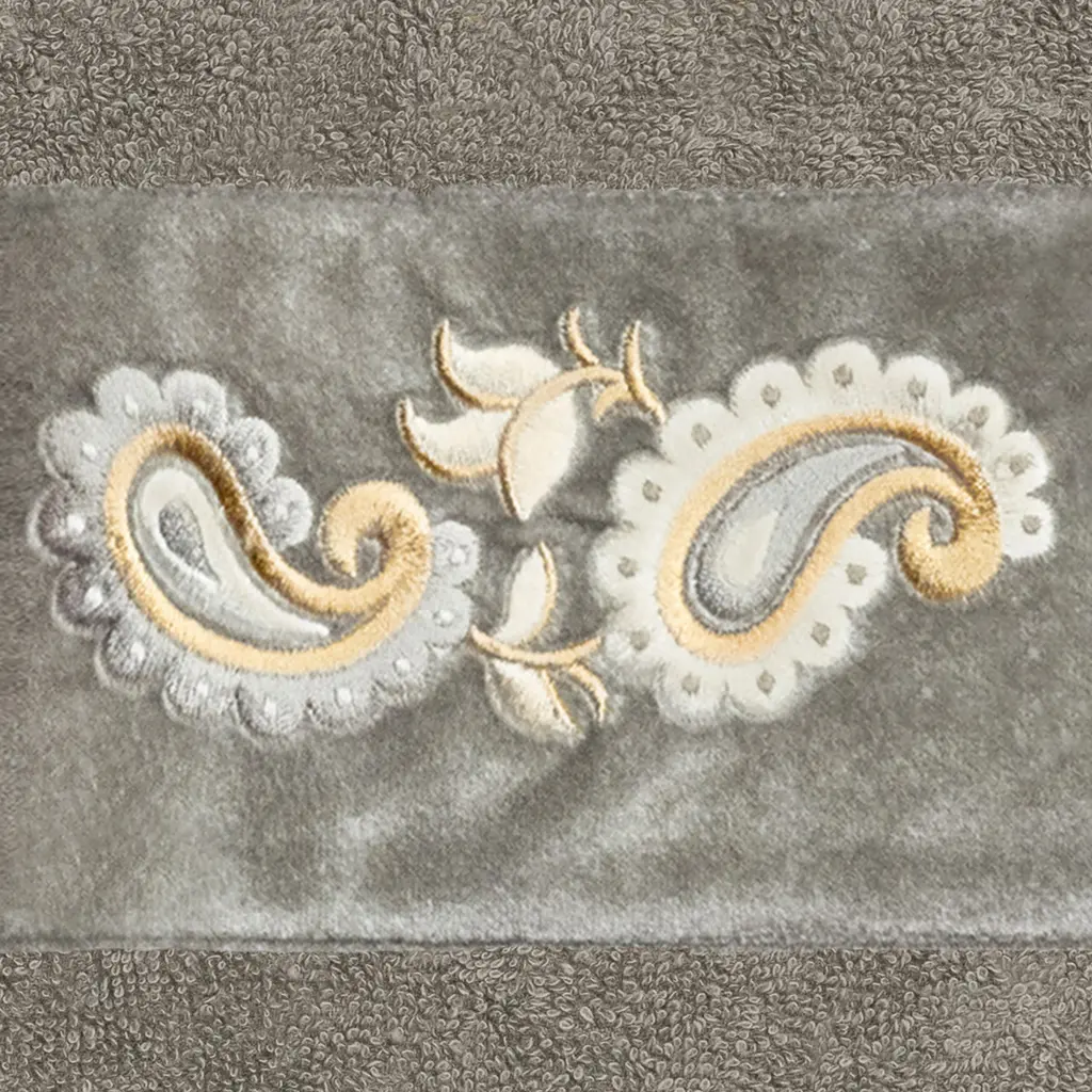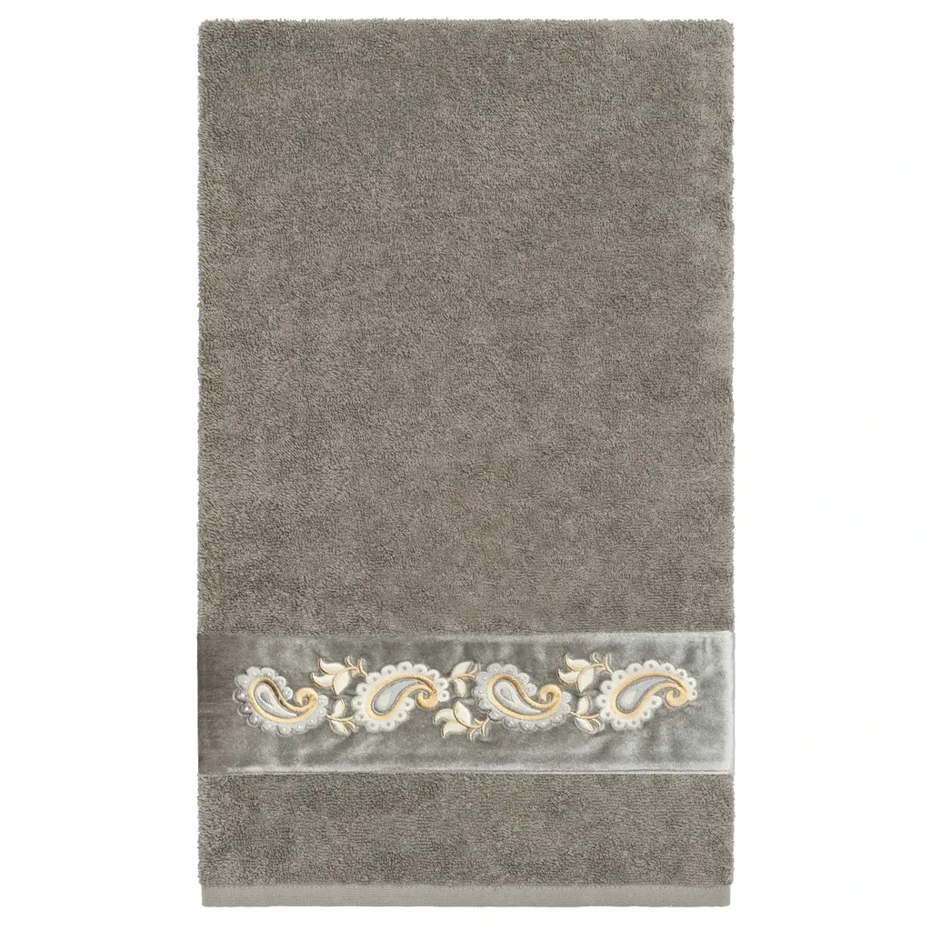 Your decorations are not complete without elegant embroidered towels by Authentic Hotel and Spa for the comfort of your family and guests. The Mackenzie towels feature intricate paisley embroidery on a soft velvet border. Cloud soft and super absorbent, these luxurious, durable towels keep their plush appearance after washing. This collection is available in 8 elegant colors: White, Cream, Latte, Tea Rose, Teal, Navy, Light Gray and Dark Gray. The Mackenzie Towel Collection brings a romantic spirit and richness to your home decor and makes a great gift. Note: Due to variations in computer screen resolutions, slight color differences may exist between images provided and actual product.Embroidered Paisley design100% Premium Turkish CottonSuperbly absorbent and quick dryingAvailable in 8 elegant colorsMachine wash cold, No bleach, line dry or dry cleanSet includes 1 bath towel (27" x 54") / 2 hand towels (16" x 30")Made in TurkeyProudly Embellished in USA