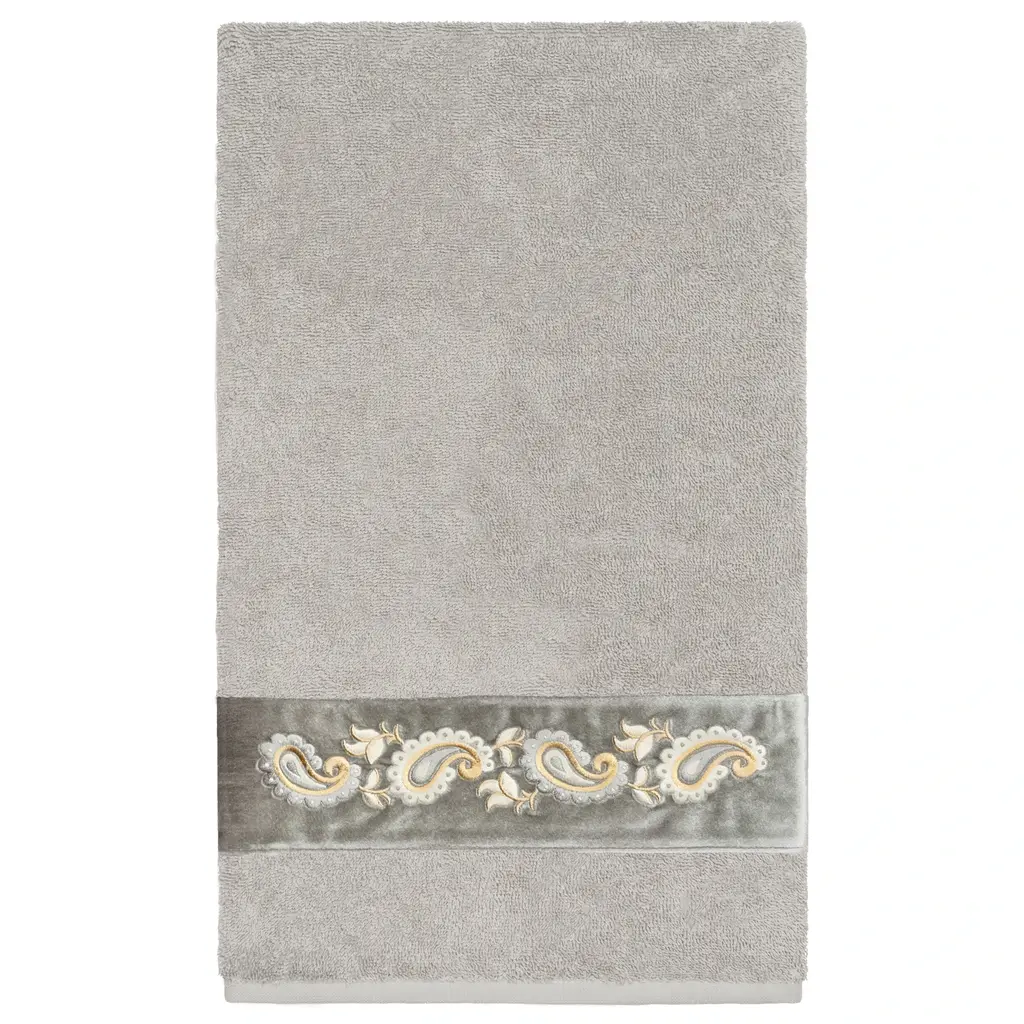 Your decorations are not complete without elegant embroidered towels by Authentic Hotel and Spa for the comfort of your family and guests. The Mackenzie towels feature intricate paisley embroidery on a soft velvet border. Cloud soft and super absorbent, these luxurious, durable towels keep their plush appearance after washing. This collection is available in 8 elegant colors: White, Cream, Latte, Tea Rose, Teal, Navy, Light Gray and Dark Gray. The Mackenzie Towel Collection brings a romantic spirit and richness to your home decor and makes a great gift. Note: Due to variations in computer screen resolutions, slight color differences may exist between images provided and actual product.Embroidered Paisley design100% Premium Turkish CottonSuperbly absorbent and quick dryingAvailable in 8 elegant colorsMachine wash cold, No bleach, line dry or dry cleanSet includes 1 bath towel (27" x 54") / 2 hand towels (16" x 30")Made in TurkeyProudly Embellished in USA