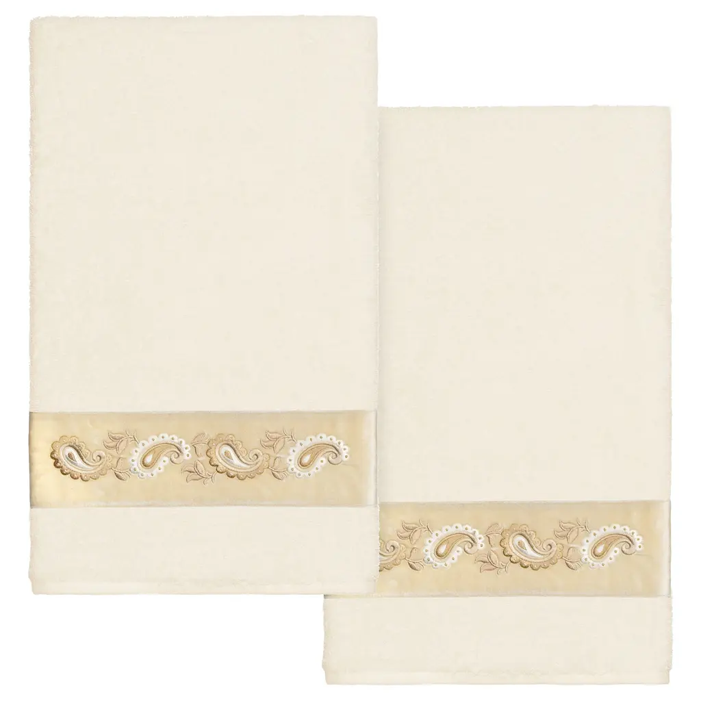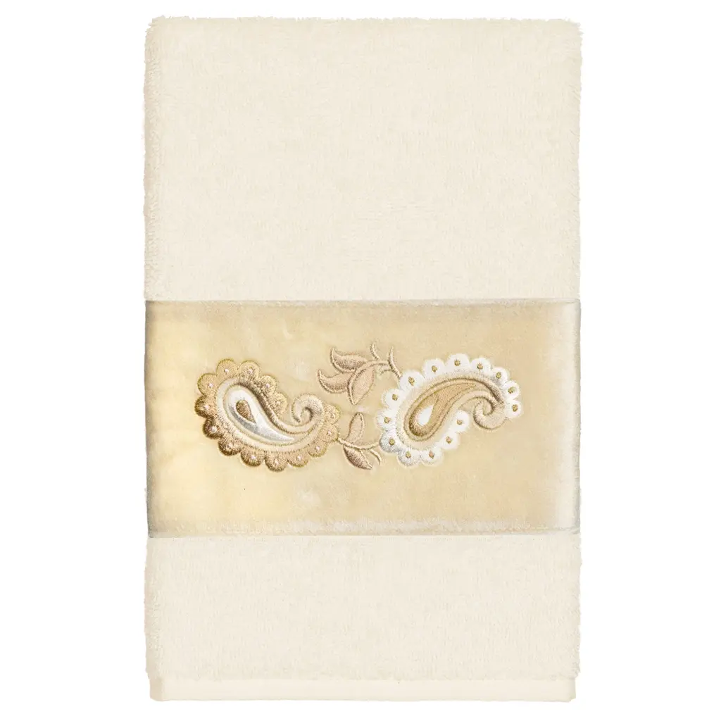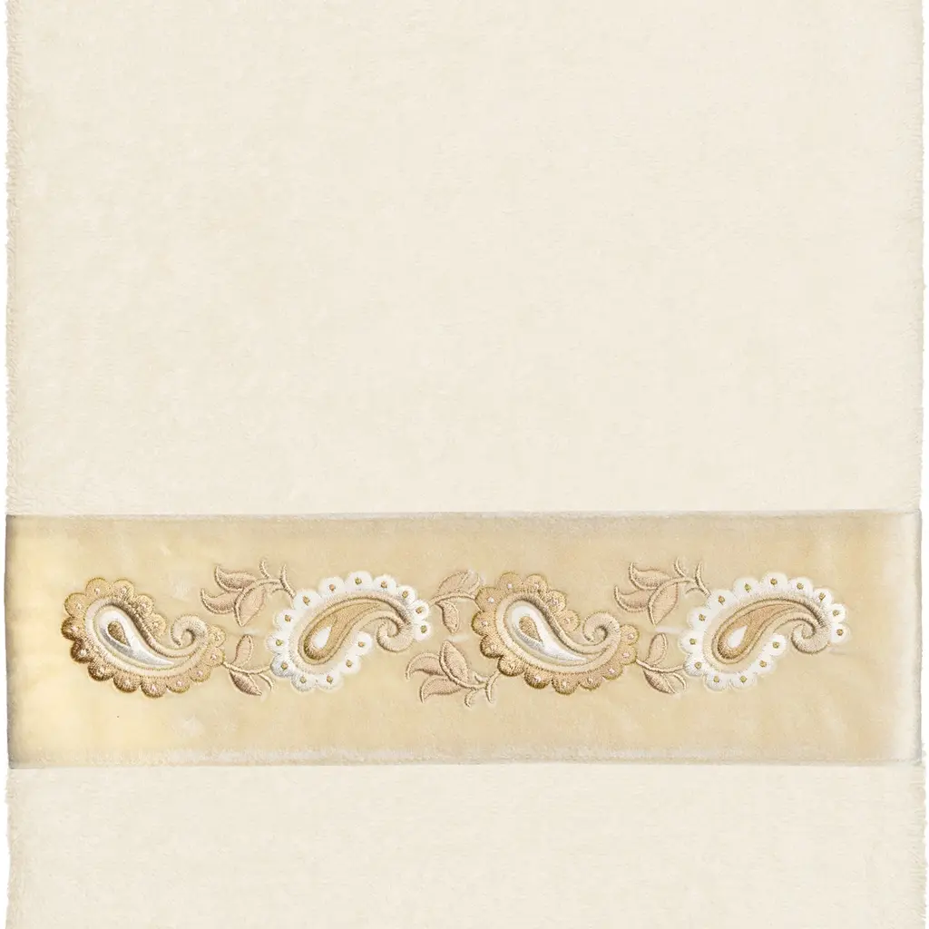 Your decorations are not complete without elegant embroidered towels by Authentic Hotel and Spa for the comfort of your family and guests. The Mackenzie towels feature intricate paisley embroidery on a soft velvet border. Cloud soft and super absorbent, these luxurious, durable towels keep their plush appearance after washing. This collection is available in 8 elegant colors: White, Cream, Latte, Tea Rose, Teal, Navy, Light Gray and Dark Gray. The Mackenzie Towel Collection brings a romantic spirit and richness to your home decor and makes a great gift. Note: Due to variations in computer screen resolutions, slight color differences may exist between images provided and actual product.Embroidered Paisley design100% Premium Turkish CottonSuperbly absorbent and quick dryingAvailable in 8 elegant colorsMachine wash cold, No bleach, line dry or dry cleanSet includes 2 bath towels (27" x 54") / 2 hand towels (16" x 30")Made in TurkeyProudly Embellished in USA