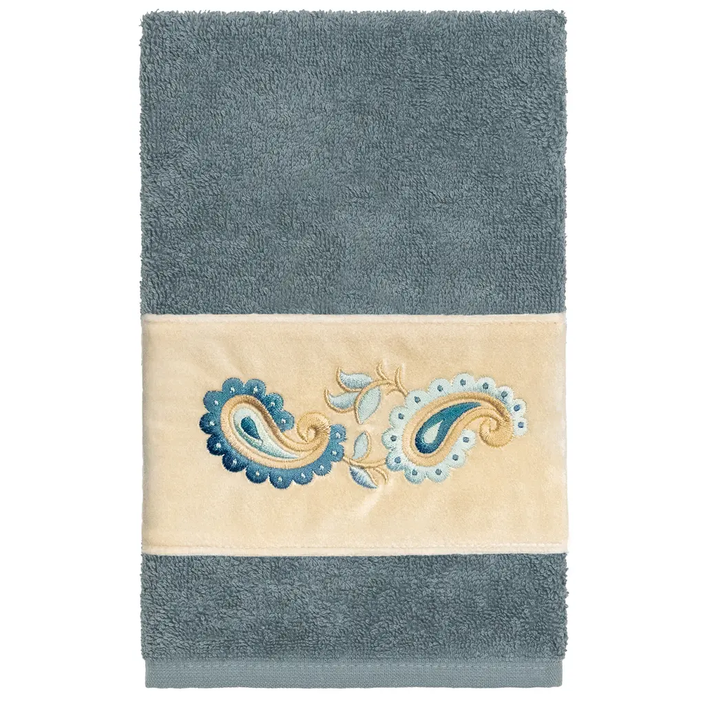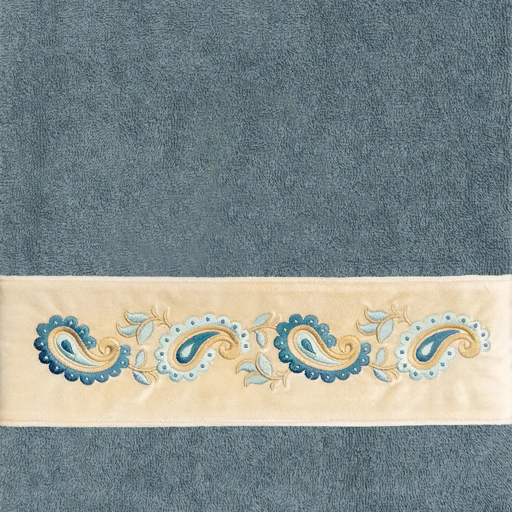 Your decorations are not complete without elegant embroidered towels by Authentic Hotel and Spa for the comfort of your family and guests. The Mackenzie towels feature intricate paisley embroidery on a soft velvet border. Cloud soft and super absorbent, these luxurious, durable towels keep their plush appearance after washing. This collection is available in 8 elegant colors: White, Cream, Latte, Tea Rose, Teal, Navy, Light Gray and Dark Gray. The Mackenzie Towel Collection brings a romantic spirit and richness to your home decor and makes a great gift. Note: Due to variations in computer screen resolutions, slight color differences may exist between images provided and actual product.Embroidered Paisley design100% Premium Turkish CottonSuperbly absorbent and quick dryingAvailable in 8 elegant colorsMachine wash cold, No bleach, line dry or dry cleanSet includes 2 bath towels (27" x 54") / 2 hand towels (16" x 30")Made in TurkeyProudly Embellished in USA