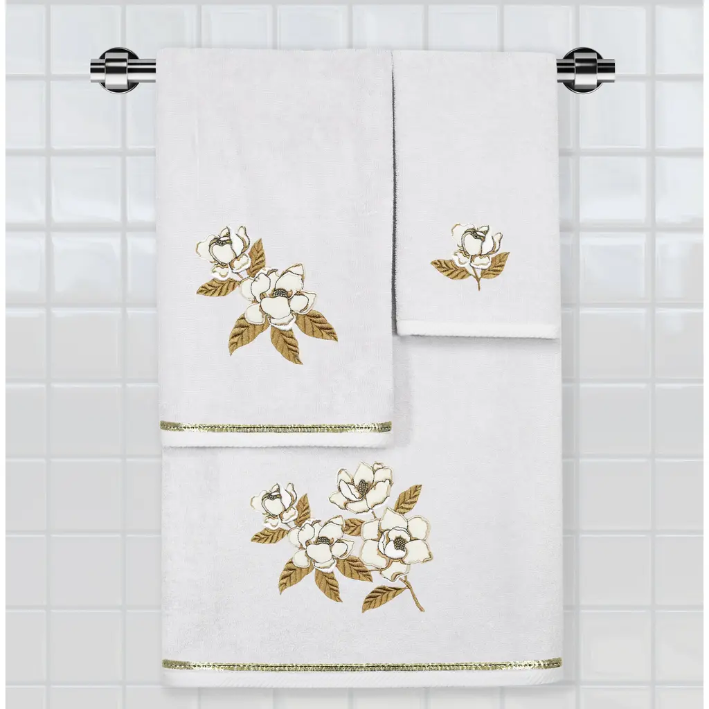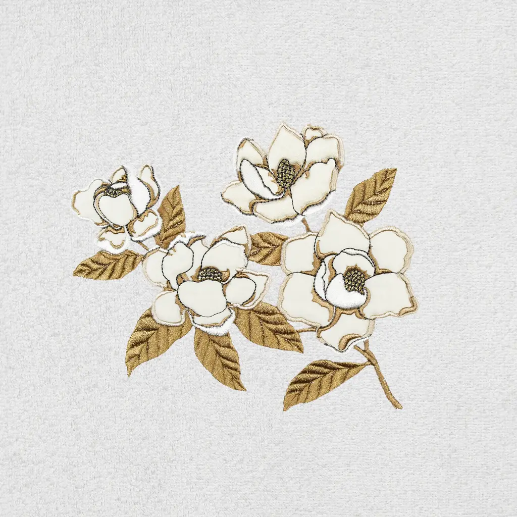 Your decorations are not complete without exquisite embroidered towels for the comfort of your family and guests. The MAGGIE towels feature a branch of lustrous applique magnolia blossoms and are trimmed with a metallic lame cord. Cloud soft and super absorbent, these luxurious, durable towels keep their plush appearance after washing. This collection is available in 8 elegant colors: White, Beige, Blush, Aqua, Silver, Cocoa, Charcoal and Marine. The MAGGIE Towel Collection brings classic spirit and richness to your home decor and makes a great gift!