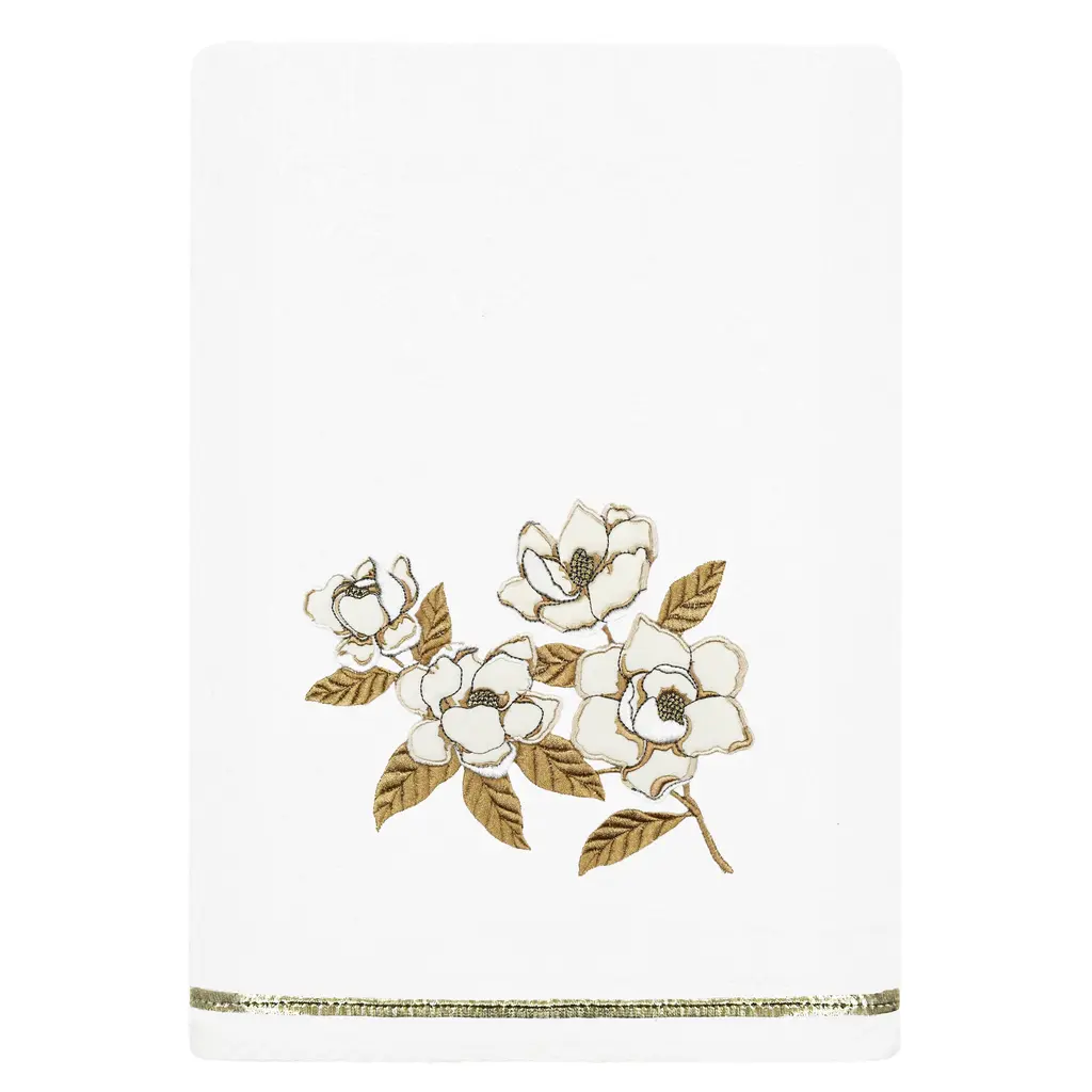 Your decorations are not complete without exquisite embroidered towels for the comfort of your family and guests. The MAGGIE towels feature a branch of lustrous applique magnolia blossoms and are trimmed with a metallic lame cord. Cloud soft and super absorbent, these luxurious, durable towels keep their plush appearance after washing. This collection is available in 8 elegant colors: White, Beige, Blush, Aqua, Silver, Cocoa, Charcoal and Marine. The MAGGIE Towel Collection brings classic spirit and richness to your home decor and makes a great gift!