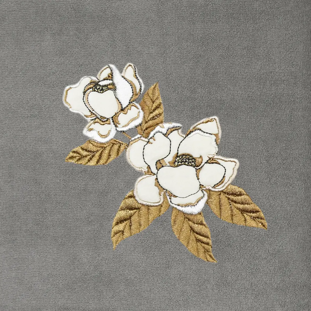 Your decorations are not complete without exquisite embroidered towels for the comfort of your family and guests. The MAGGIE towels feature a branch of lustrous applique magnolia blossoms and are trimmed with a metallic lame cord. Cloud soft and super absorbent, these luxurious, durable towels keep their plush appearance after washing. This collection is available in 8 elegant colors: White, Beige, Blush, Aqua, Silver, Cocoa, Charcoal and Marine. The MAGGIE Towel Collection brings classic spirit and richness to your home decor and makes a great gift!