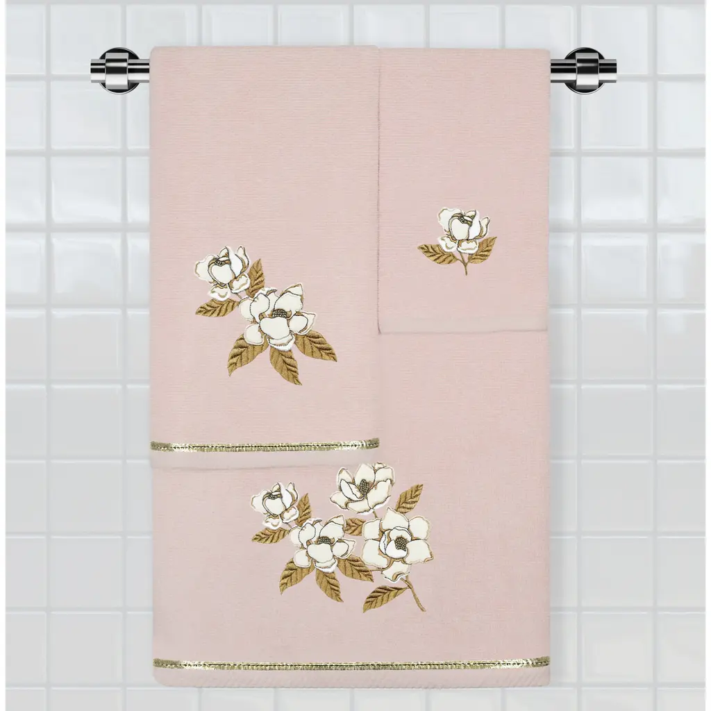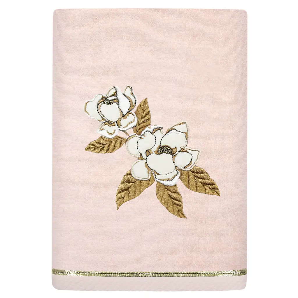 Your decorations are not complete without exquisite embroidered towels for the comfort of your family and guests. The MAGGIE towels feature a branch of lustrous applique magnolia blossoms and are trimmed with a metallic lame cord. Cloud soft and super absorbent, these luxurious, durable towels keep their plush appearance after washing. This collection is available in 8 elegant colors: White, Beige, Blush, Aqua, Silver, Cocoa, Charcoal and Marine. The MAGGIE Towel Collection brings classic spirit and richness to your home decor and makes a great gift!