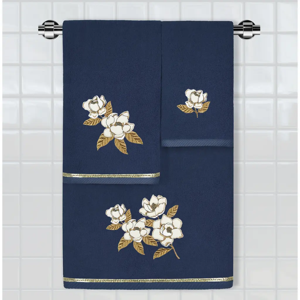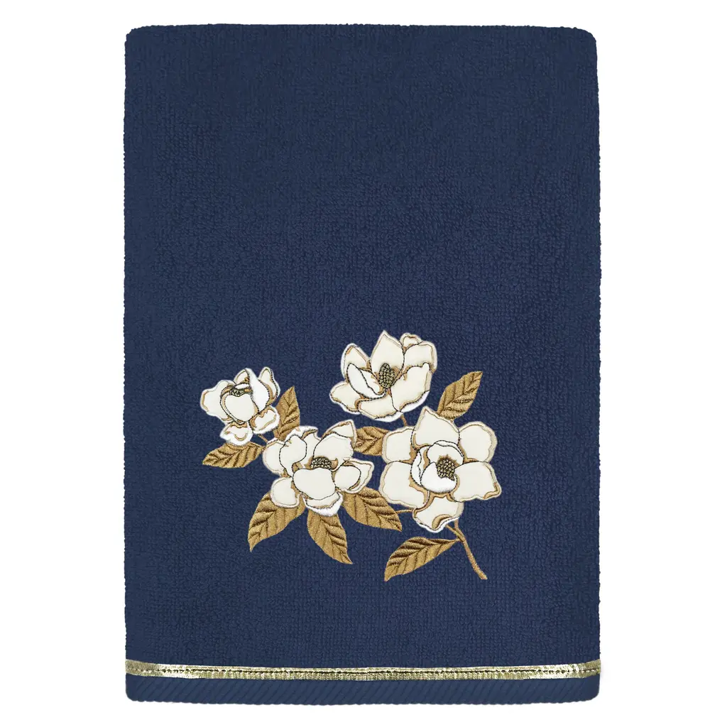 Your decorations are not complete without exquisite embroidered towels for the comfort of your family and guests. The MAGGIE towels feature a branch of lustrous applique magnolia blossoms and are trimmed with a metallic lame cord. Cloud soft and super absorbent, these luxurious, durable towels keep their plush appearance after washing. This collection is available in 8 elegant colors: White, Beige, Blush, Aqua, Silver, Cocoa, Charcoal and Marine. The MAGGIE Towel Collection brings classic spirit and richness to your home decor and makes a great gift!
