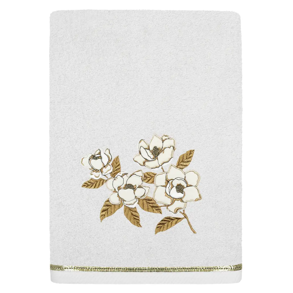 Your decorations are not complete without exquisite embroidered towels for the comfort of your family and guests. The MAGGIE towels feature a branch of lustrous applique magnolia blossoms and are trimmed with a metallic lame cord. Cloud soft and super absorbent, these luxurious, durable towels keep their plush appearance after washing. This collection is available in 8 elegant colors: White, Beige, Blush, Aqua, Silver, Cocoa, Charcoal and Marine. The MAGGIE Towel Collection brings classic spirit and richness to your home decor and makes a great gift!