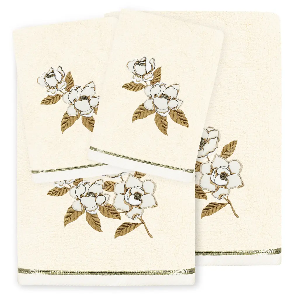 Your decorations are not complete without exquisite embroidered towels for the comfort of your family and guests. The MAGGIE towels feature a branch of lustrous applique magnolia blossoms and are trimmed with a metallic lame cord. Cloud soft and super absorbent, these luxurious, durable towels keep their plush appearance after washing. This collection is available in 8 elegant colors: White, Beige, Blush, Aqua, Silver, Cocoa, Charcoal and Marine. The MAGGIE Towel Collection brings classic spirit and richness to your home decor and makes a great gift!