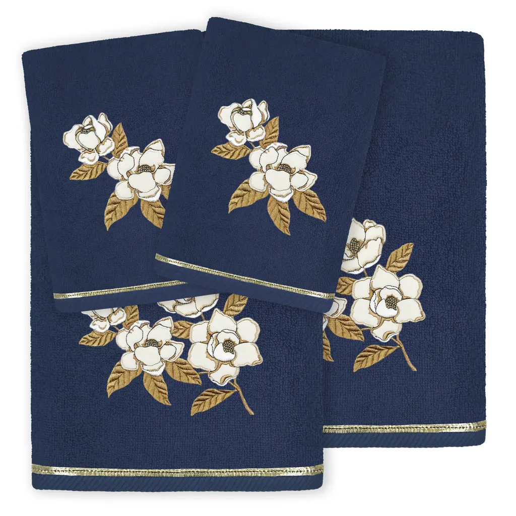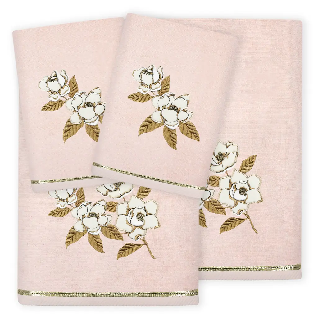 Your decorations are not complete without exquisite embroidered towels for the comfort of your family and guests. The MAGGIE towels feature a branch of lustrous applique magnolia blossoms and are trimmed with a metallic lame cord. Cloud soft and super absorbent, these luxurious, durable towels keep their plush appearance after washing. This collection is available in 8 elegant colors: White, Beige, Blush, Aqua, Silver, Cocoa, Charcoal and Marine. The MAGGIE Towel Collection brings classic spirit and richness to your home decor and makes a great gift!