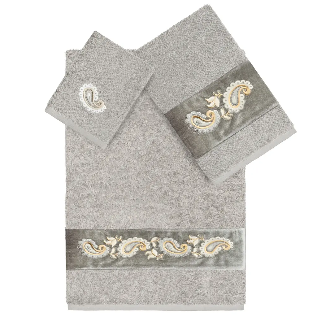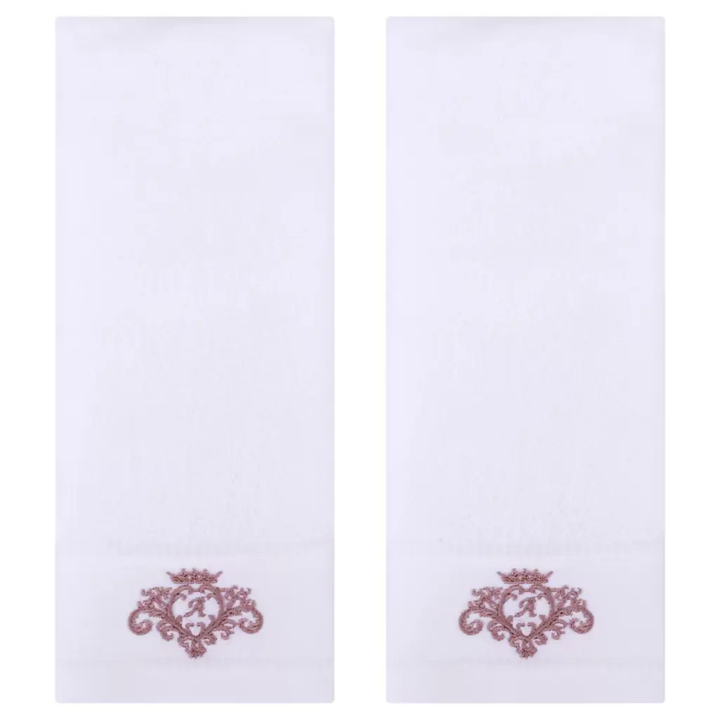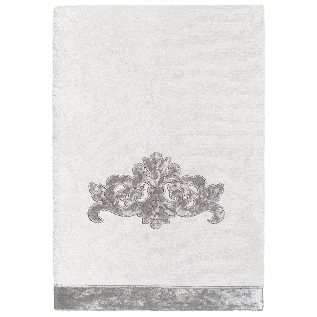 Your decorations are not complete without elegant embroidered towels by Authentic Hotel and Spa for the comfort of your family and guests. The May towels feature a classic velvet crest applique and are trimmed with the same lustrous velvet border. Cloud soft and super absorbent, these luxurious, durable towels keep their plush appearance after washing. This collection is available in 8 elegant colors: White, Beige, Blush, Aqua, Silver, Cocoa, Charcoal and Marine. The May Towel Collection brings a refined spirit and richness to your home decor and makes a great gift. Note: Due to variations in computer screen resolutions, slight color differences may exist between images provided and actual product.Embroidered Velvet Crest design100% Premium Turkish CottonSuperbly absorbent and quick dryingAvailable in 8 elegant colorsMachine wash cold, No bleach, line dry or dry cleanSet includes 2 bath towels (27" x 54")Made in TurkeyProudly Embellished in USA