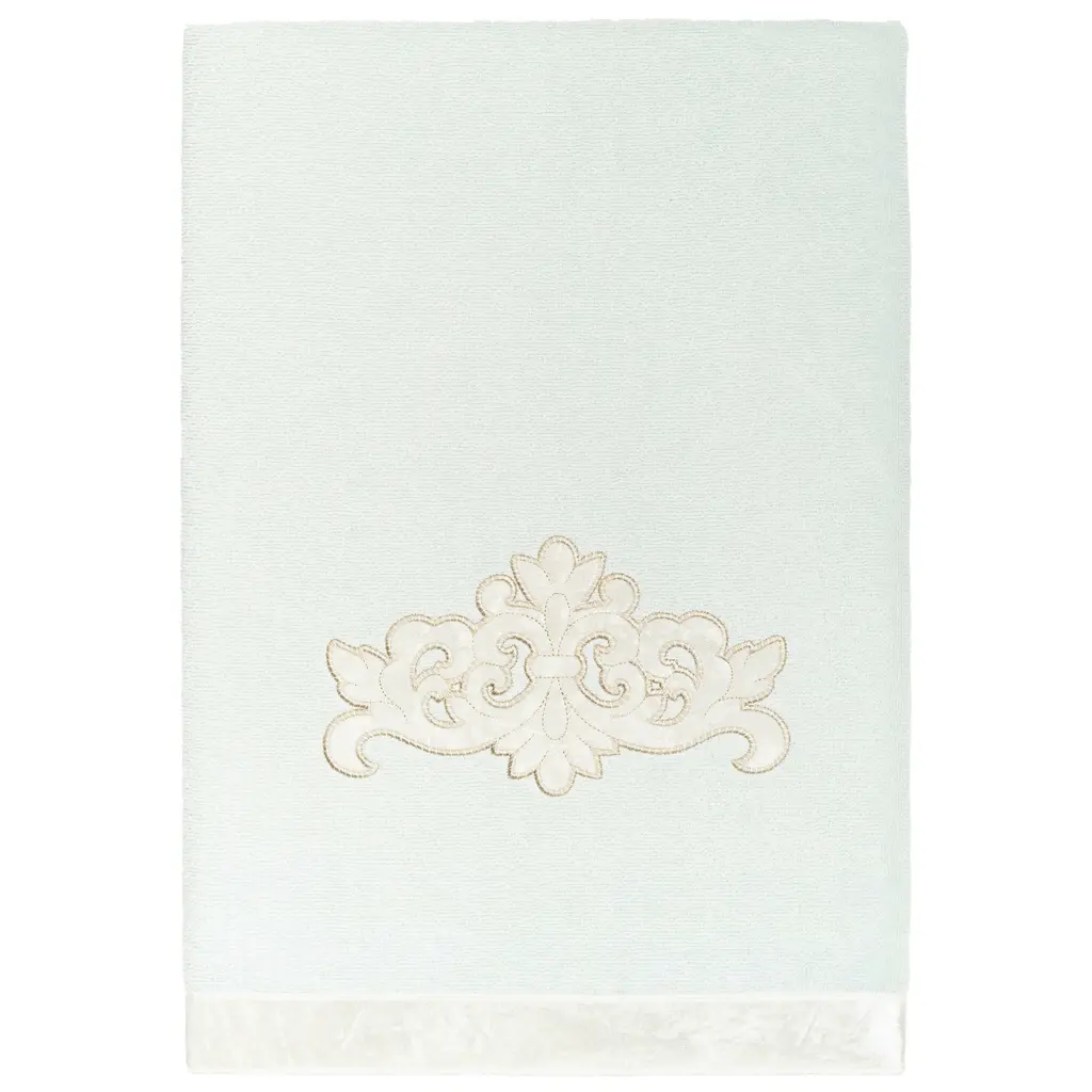 Your decorations are not complete without elegant embroidered towels by Authentic Hotel and Spa for the comfort of your family and guests. The May towels feature a classic velvet crest applique and are trimmed with the same lustrous velvet border. Cloud soft and super absorbent, these luxurious, durable towels keep their plush appearance after washing. This collection is available in 8 elegant colors: White, Beige, Blush, Aqua, Silver, Cocoa, Charcoal and Marine. The May Towel Collection brings a refined spirit and richness to your home decor and makes a great gift. Note: Due to variations in computer screen resolutions, slight color differences may exist between images provided and actual product.Embroidered Velvet Crest design100% Premium Turkish CottonSuperbly absorbent and quick dryingAvailable in 8 elegant colorsMachine wash cold, No bleach, line dry or dry cleanSet includes 1 bath towel (27" x 54") / 2 hand towels (16" x 30")Made in TurkeyProudly Embellished in USA