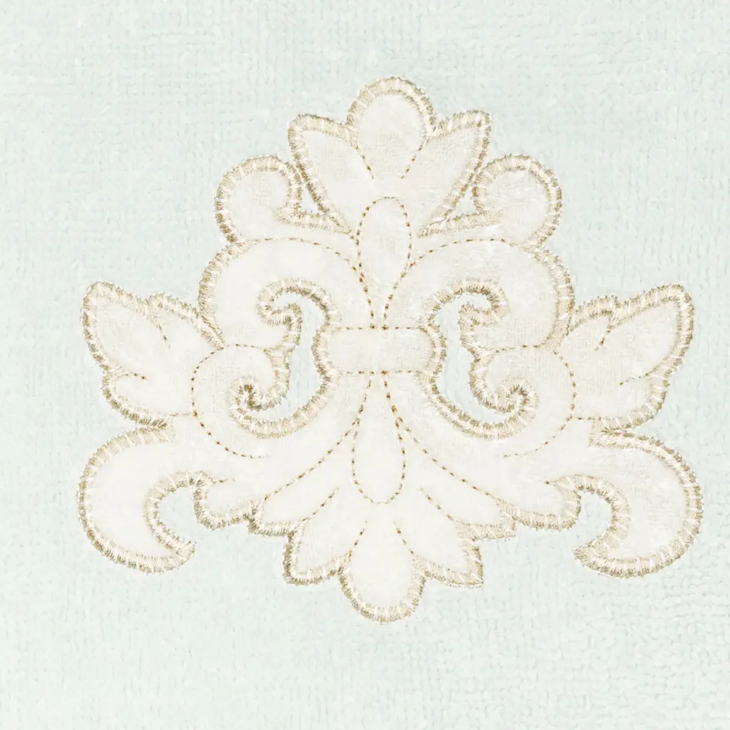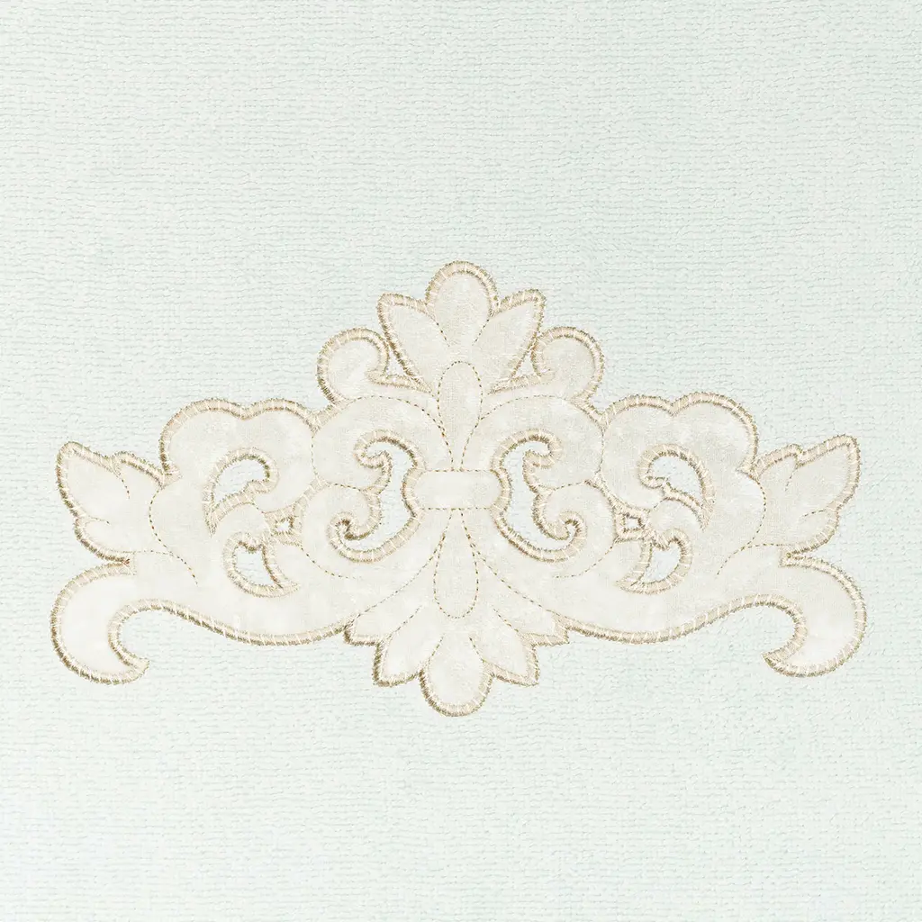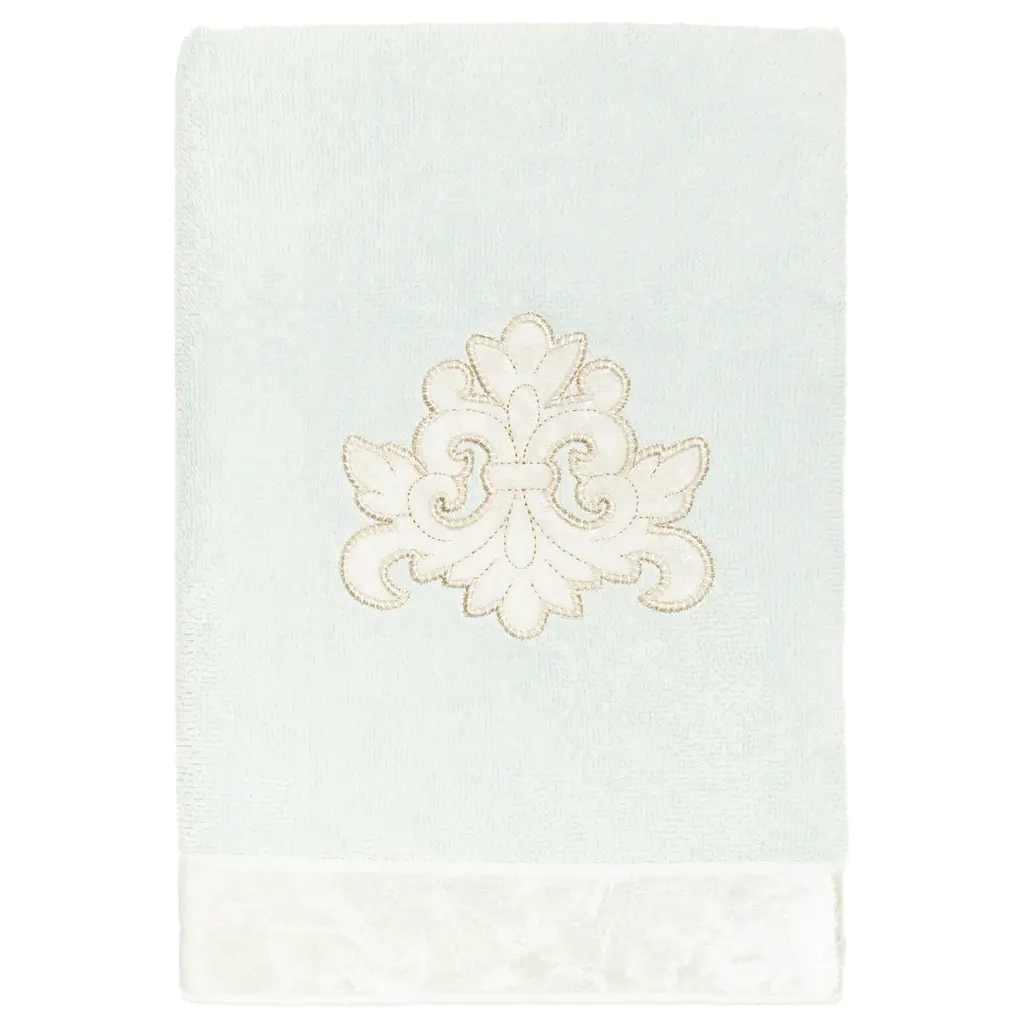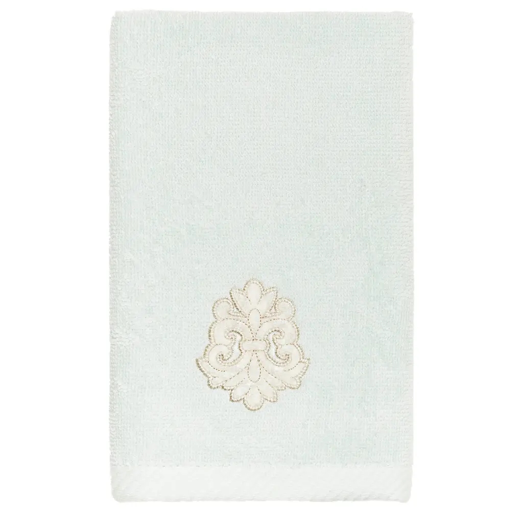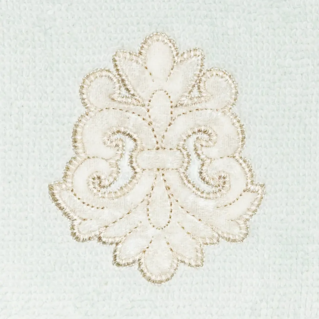 Your decorations are not complete without elegant embroidered towels by Authentic Hotel and Spa for the comfort of your family and guests. The May towels feature a classic velvet crest applique and are trimmed with the same lustrous velvet border. Cloud soft and super absorbent, these luxurious, durable towels keep their plush appearance after washing. This collection is available in 8 elegant colors: White, Beige, Blush, Aqua, Silver, Cocoa, Charcoal and Marine. The May Towel Collection brings a refined spirit and richness to your home decor and makes a great gift. Note: Due to variations in computer screen resolutions, slight color differences may exist between images provided and actual product.Embroidered Velvet Crest design100% Premium Turkish CottonSuperbly absorbent and quick dryingAvailable in 8 elegant colorsMachine wash cold, No bleach, line dry or dry cleanSet includes 1 bath towel (27" x 54") / 1 hand towel (16" x 30") / 1 fingertip towel (11" x 18")Made in TurkeyProudly Embellished in USA