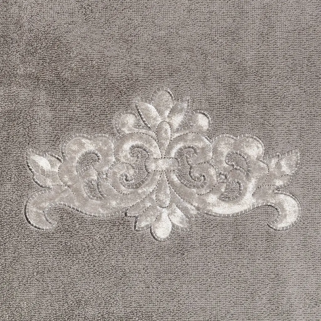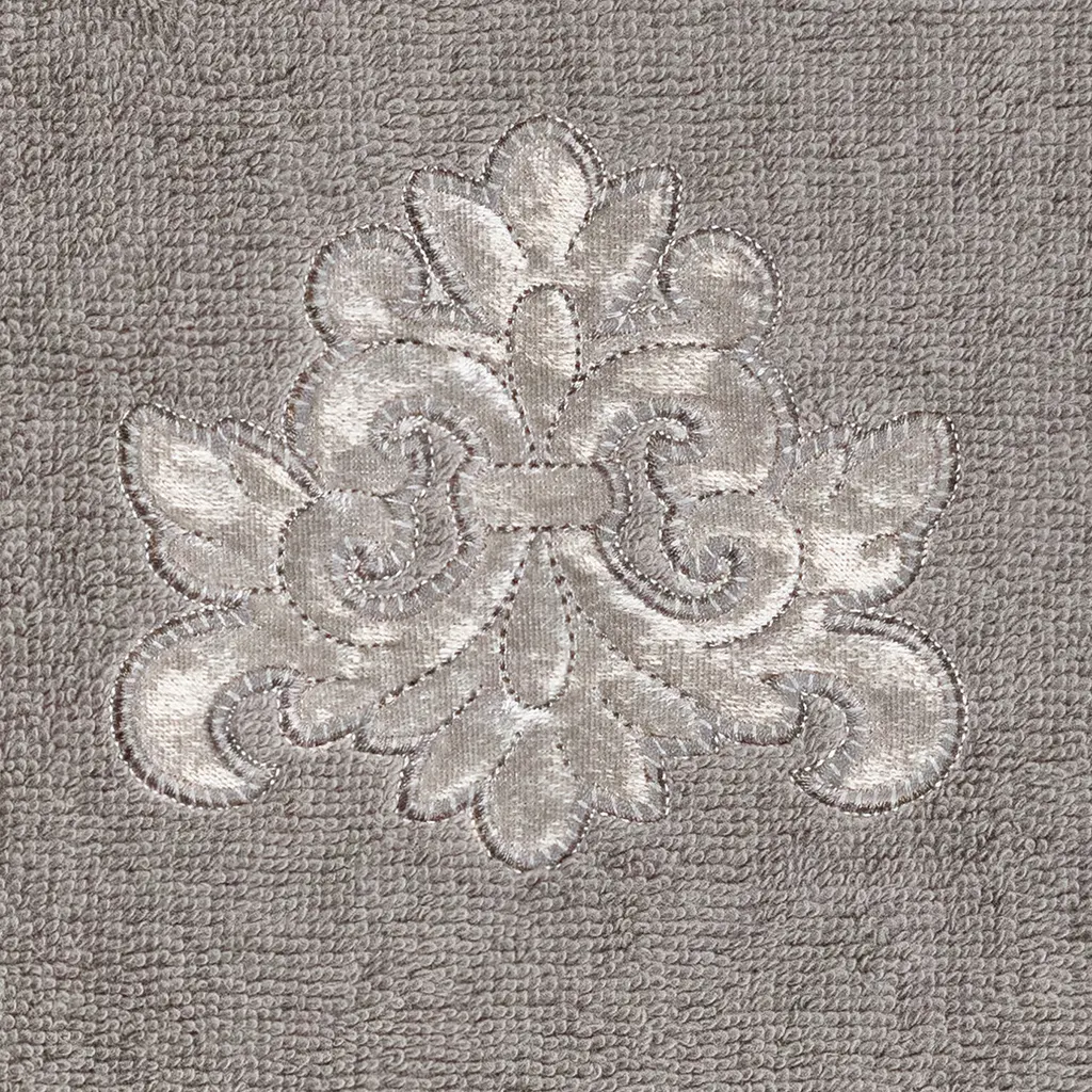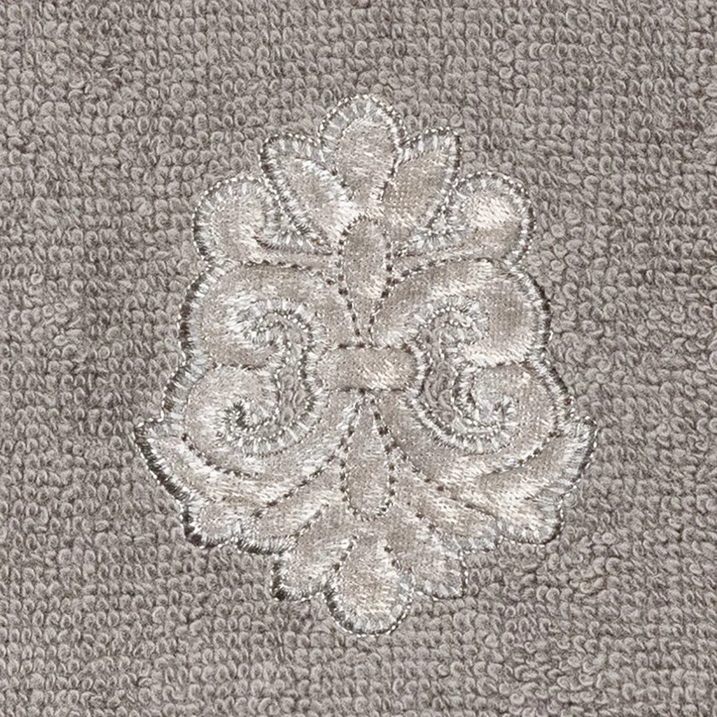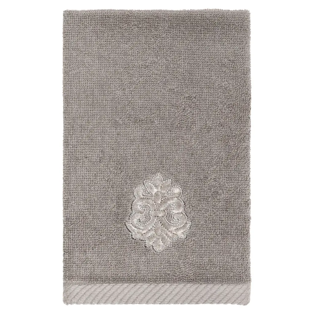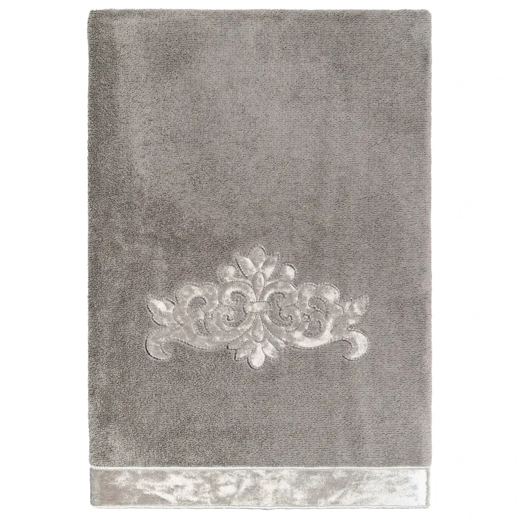 Your decorations are not complete without elegant embroidered towels by Authentic Hotel and Spa for the comfort of your family and guests. The May towels feature a classic velvet crest applique and are trimmed with the same lustrous velvet border. Cloud soft and super absorbent, these luxurious, durable towels keep their plush appearance after washing. This collection is available in 8 elegant colors: White, Beige, Blush, Aqua, Silver, Cocoa, Charcoal and Marine. The May Towel Collection brings a refined spirit and richness to your home decor and makes a great gift. Note: Due to variations in computer screen resolutions, slight color differences may exist between images provided and actual product.Embroidered Velvet Crest design100% Premium Turkish CottonSuperbly absorbent and quick dryingAvailable in 8 elegant colorsMachine wash cold, No bleach, line dry or dry cleanSet includes 1 bath towel (27" x 54") / 1 hand towel (16" x 30") / 1 fingertip towel (11" x 18")Made in TurkeyProudly Embellished in USA