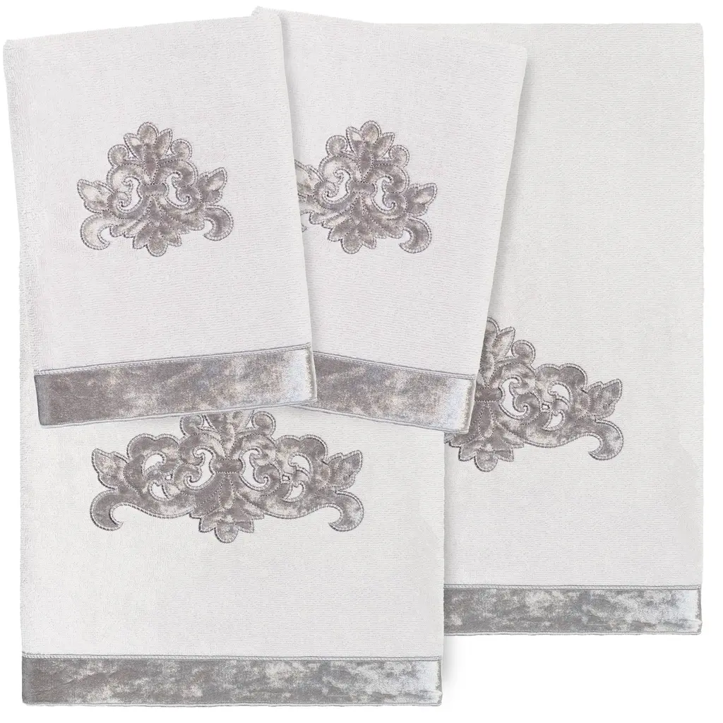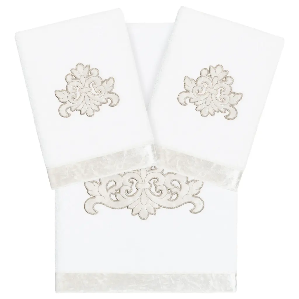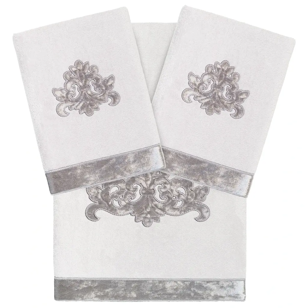 Your decorations are not complete without elegant embroidered towels by Authentic Hotel and Spa for the comfort of your family and guests. The May towels feature a classic velvet crest applique and are trimmed with the same lustrous velvet border. Cloud soft and super absorbent, these luxurious, durable towels keep their plush appearance after washing. This collection is available in 8 elegant colors: White, Beige, Blush, Aqua, Silver, Cocoa, Charcoal and Marine. The May Towel Collection brings a refined spirit and richness to your home decor and makes a great gift. Note: Due to variations in computer screen resolutions, slight color differences may exist between images provided and actual product.Embroidered Velvet Crest design100% Premium Turkish CottonSuperbly absorbent and quick dryingAvailable in 8 elegant colorsMachine wash cold, No bleach, line dry or dry cleanSet includes 1 bath towel (27" x 54") / 1 hand towel (16" x 30") / 1 fingertip towel (11" x 18")Made in TurkeyProudly Embellished in USA