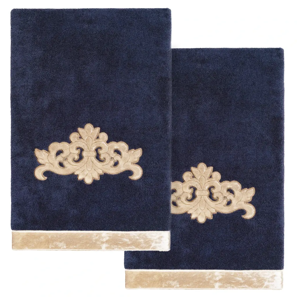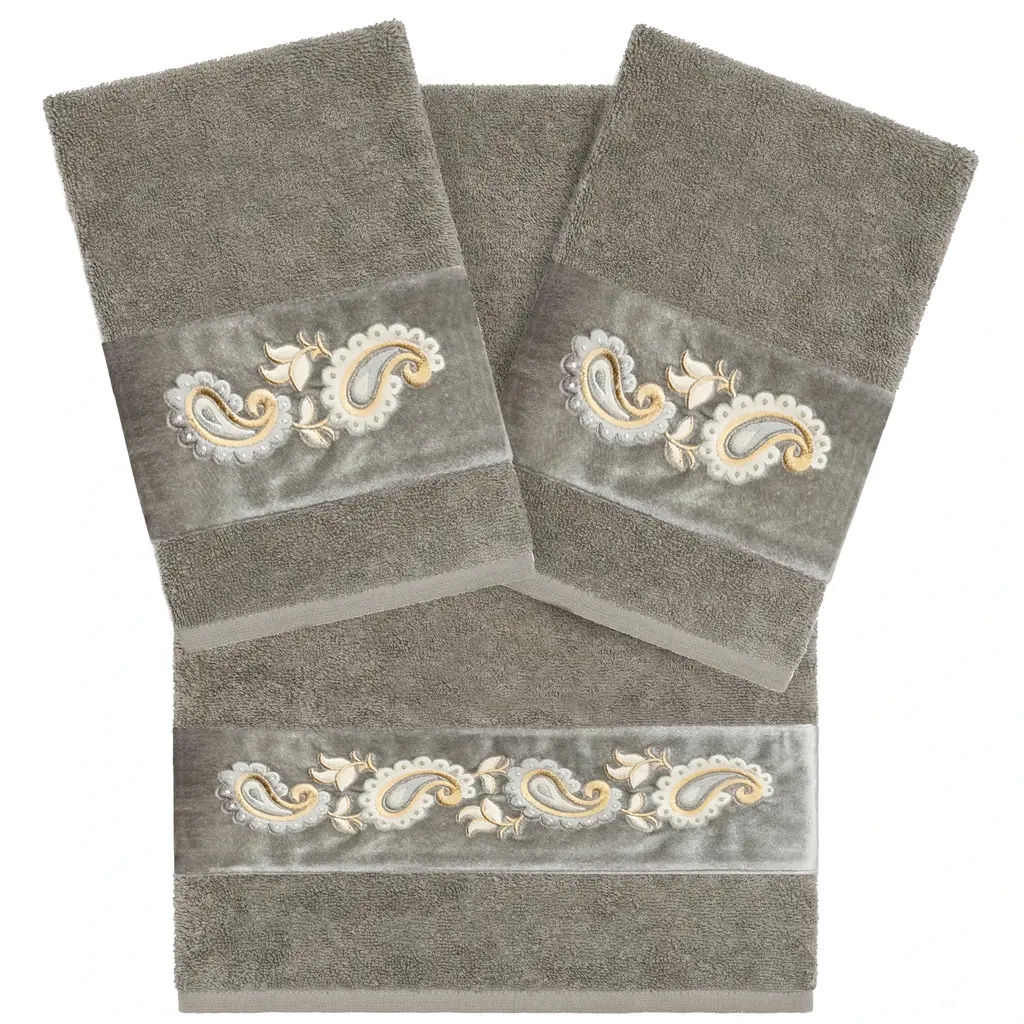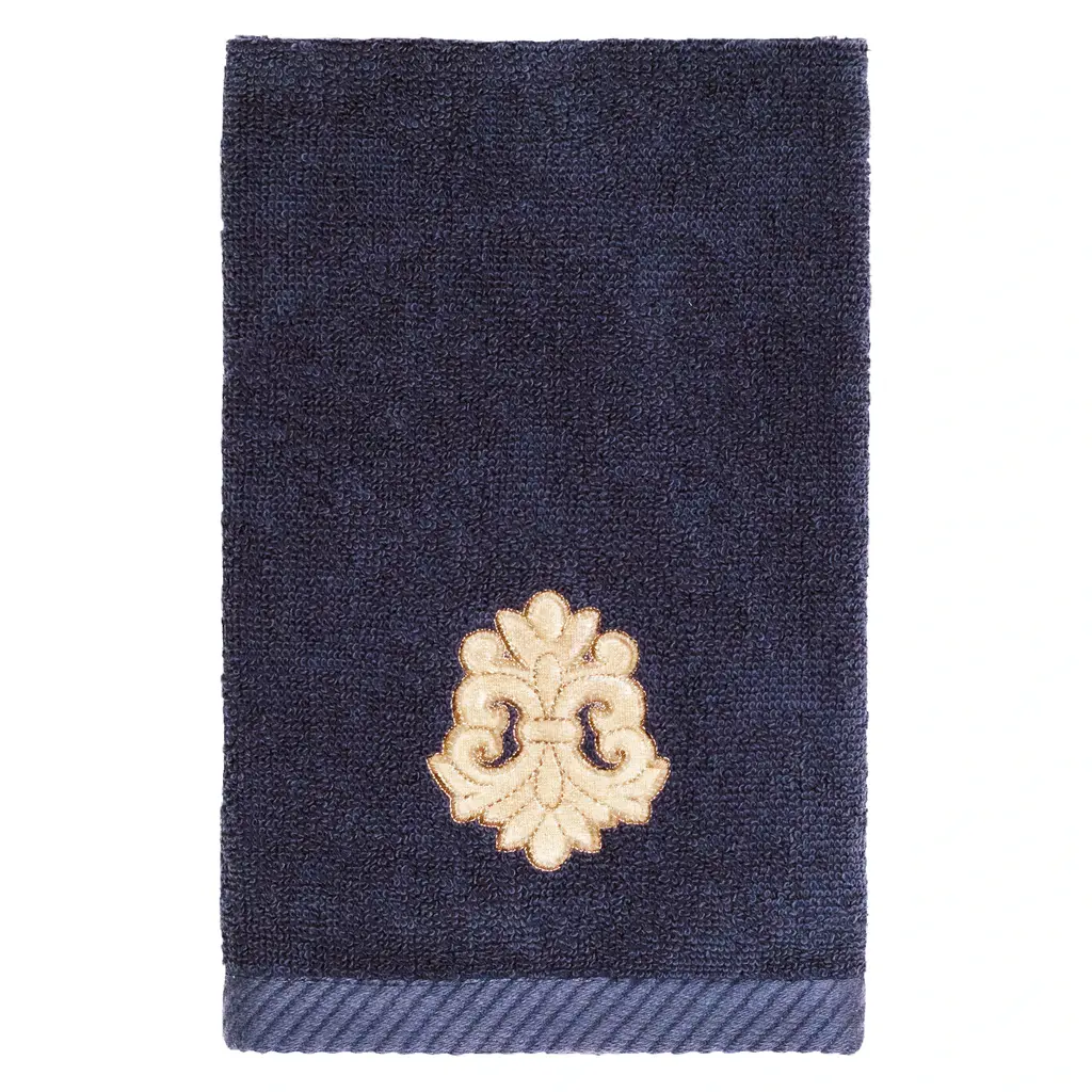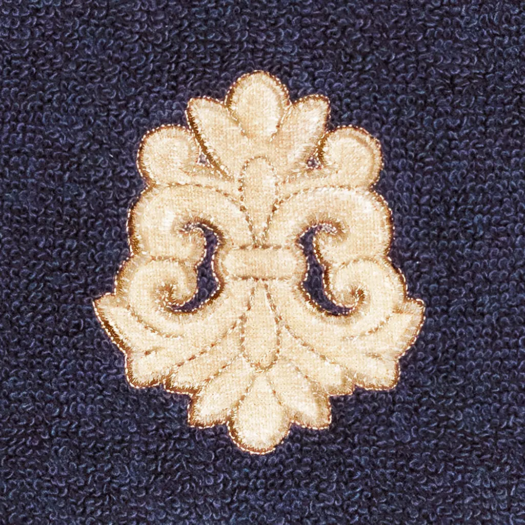 Your decorations are not complete without elegant embroidered towels by Authentic Hotel and Spa for the comfort of your family and guests. The May towels feature a classic velvet crest applique and are trimmed with the same lustrous velvet border. Cloud soft and super absorbent, these luxurious, durable towels keep their plush appearance after washing. This collection is available in 8 elegant colors: White, Beige, Blush, Aqua, Silver, Cocoa, Charcoal and Marine. The May Towel Collection brings a refined spirit and richness to your home decor and makes a great gift. Note: Due to variations in computer screen resolutions, slight color differences may exist between images provided and actual product.Embroidered Velvet Crest design100% Premium Turkish CottonSuperbly absorbent and quick dryingAvailable in 8 elegant colorsMachine wash cold, No bleach, line dry or dry cleanSet includes 1 bath towel (27" x 54") / 1 hand towel (16" x 30") / 1 fingertip towel (11" x 18")Made in TurkeyProudly Embellished in USA