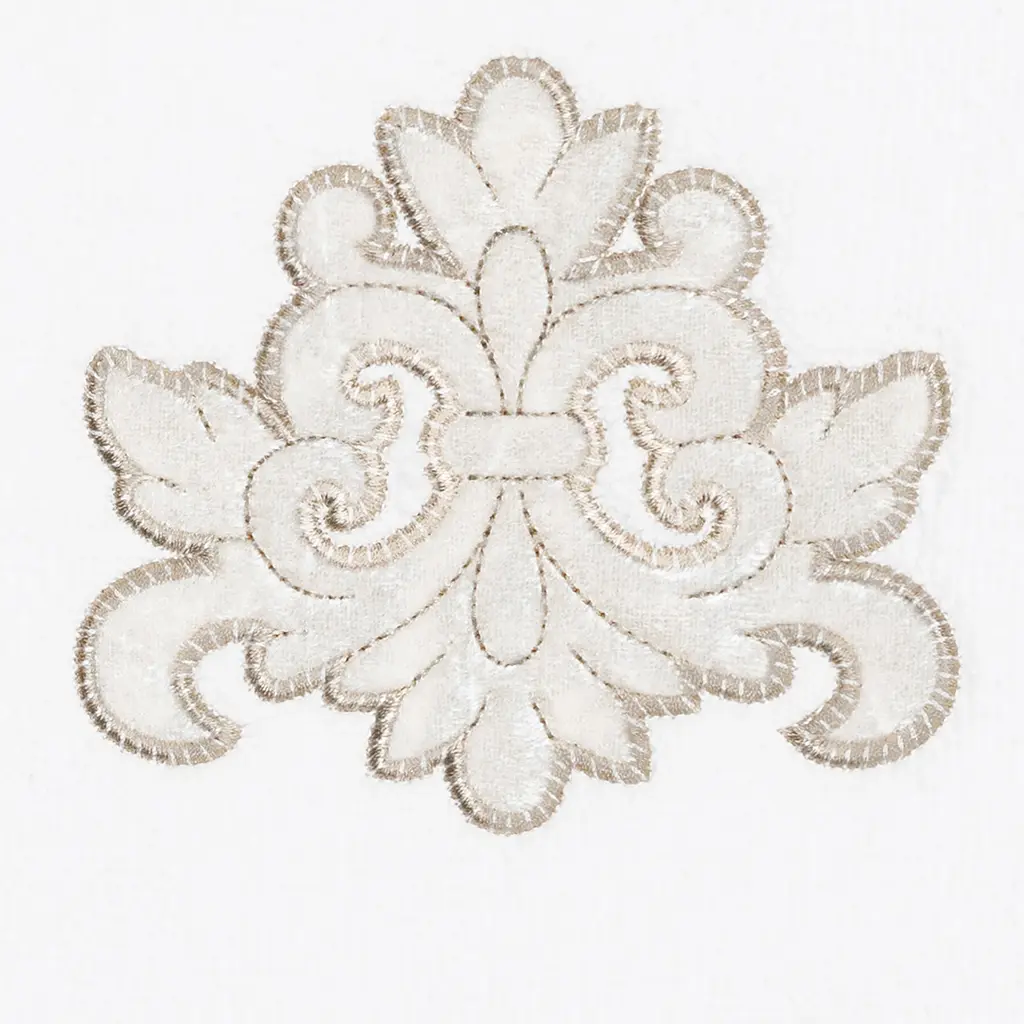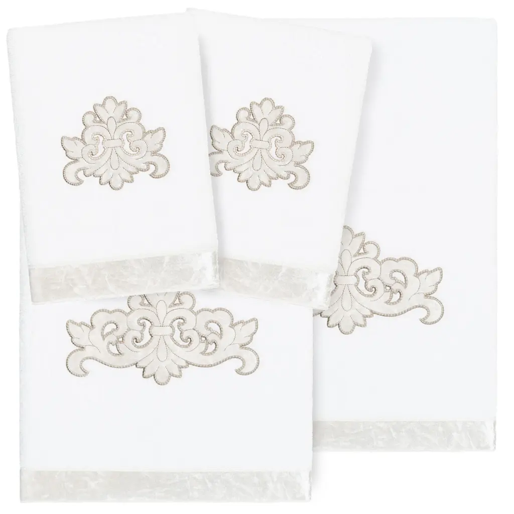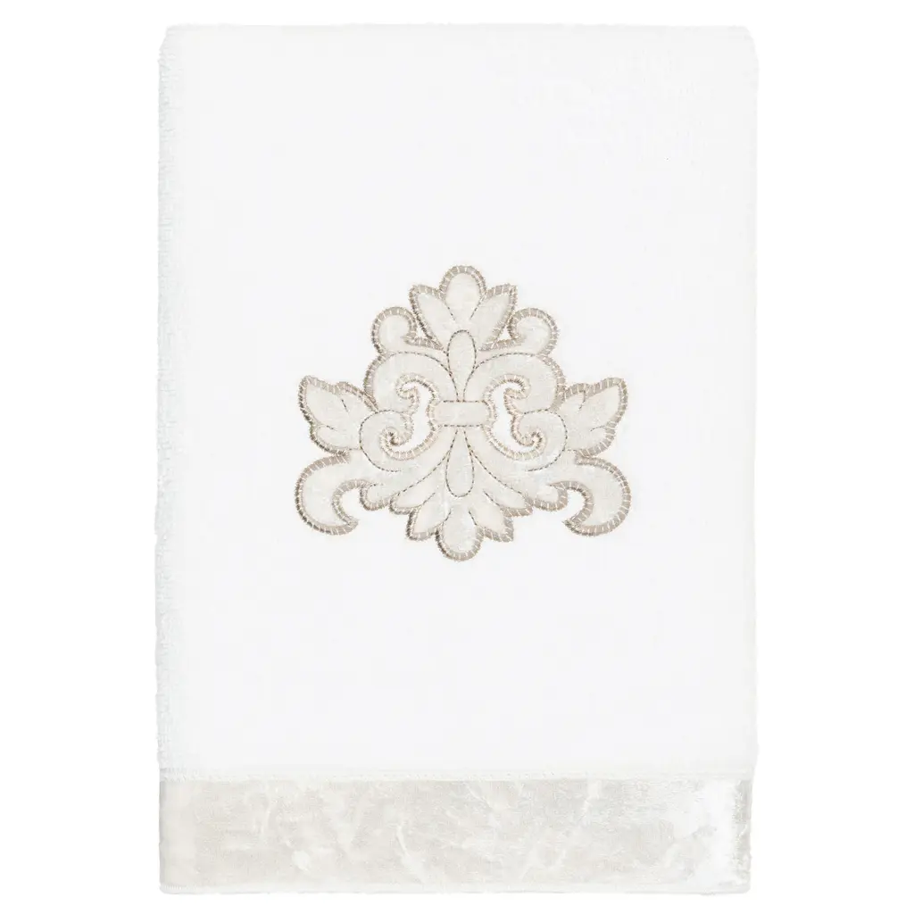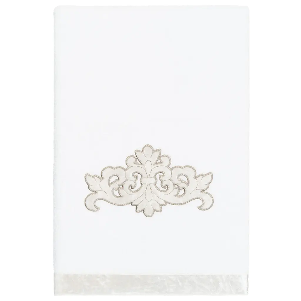 Your decorations are not complete without elegant embroidered towels by Authentic Hotel and Spa for the comfort of your family and guests. The May towels feature a classic velvet crest applique and are trimmed with the same lustrous velvet border. Cloud soft and super absorbent, these luxurious, durable towels keep their plush appearance after washing. This collection is available in 8 elegant colors: White, Beige, Blush, Aqua, Silver, Cocoa, Charcoal and Marine. The May Towel Collection brings a refined spirit and richness to your home decor and makes a great gift. Note: Due to variations in computer screen resolutions, slight color differences may exist between images provided and actual product.Embroidered Velvet Crest design100% Premium Turkish CottonSuperbly absorbent and quick dryingAvailable in 8 elegant colorsMachine wash cold, No bleach, line dry or dry cleanSet includes 1 bath towel (27" x 54") / 2 hand towels (16" x 30")Made in TurkeyProudly Embellished in USA