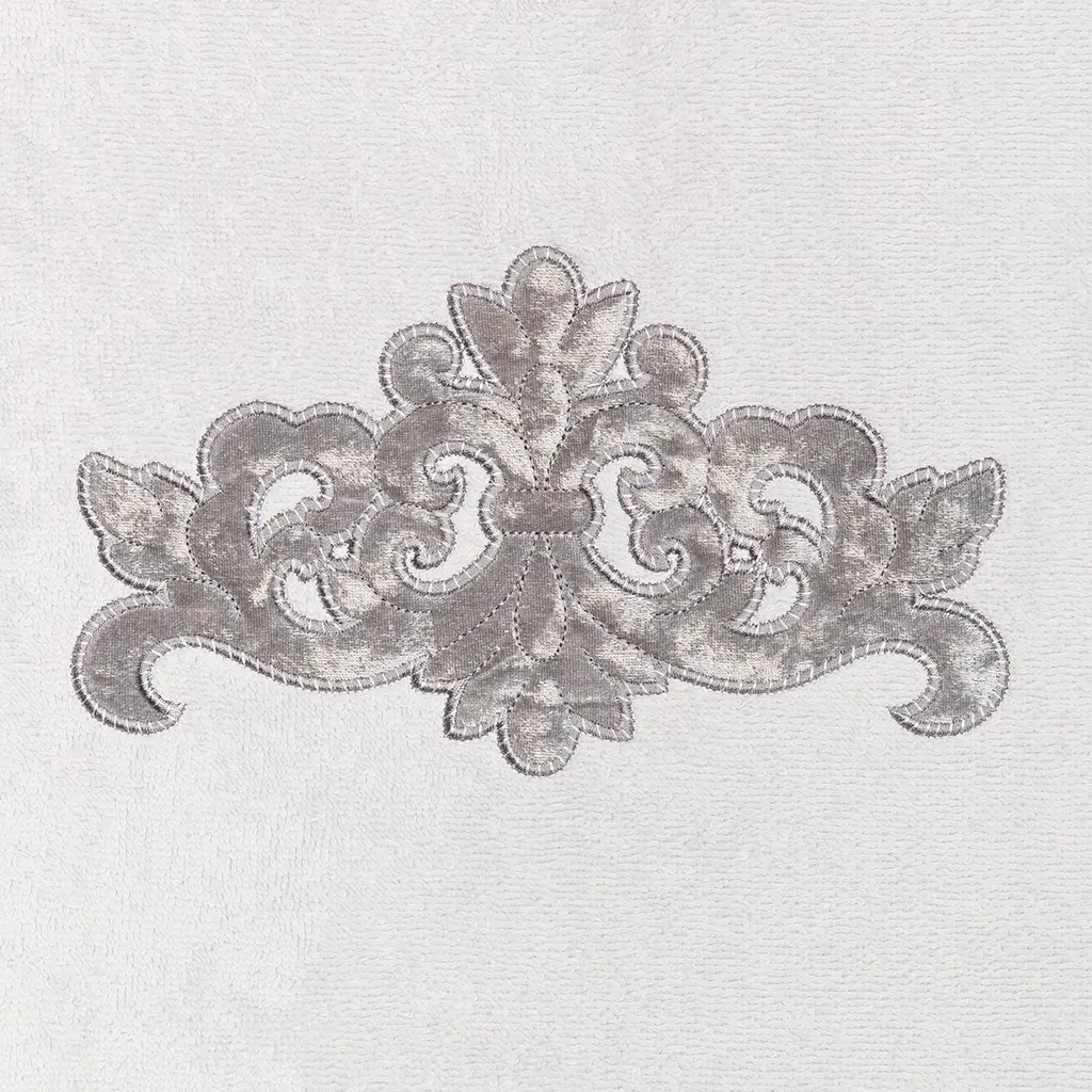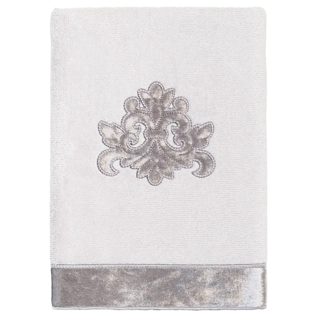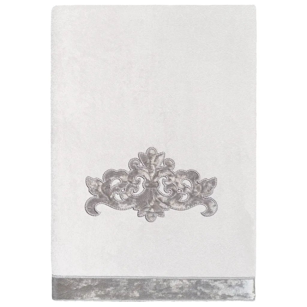 Your decorations are not complete without elegant embroidered towels by Authentic Hotel and Spa for the comfort of your family and guests. The May towels feature a classic velvet crest applique and are trimmed with the same lustrous velvet border. Cloud soft and super absorbent, these luxurious, durable towels keep their plush appearance after washing. This collection is available in 8 elegant colors: White, Beige, Blush, Aqua, Silver, Cocoa, Charcoal and Marine. The May Towel Collection brings a refined spirit and richness to your home decor and makes a great gift. Note: Due to variations in computer screen resolutions, slight color differences may exist between images provided and actual product.Embroidered Velvet Crest design100% Premium Turkish CottonSuperbly absorbent and quick dryingAvailable in 8 elegant colorsMachine wash cold, No bleach, line dry or dry cleanSet includes 2 bath towels (27" x 54") / 2 hand towels (16" x 30")Made in TurkeyProudly Embellished in USA