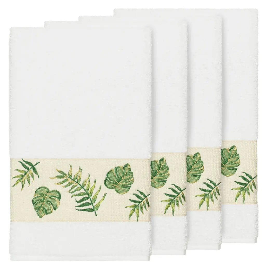These authentic hotel and spa set of 4 bath towels are made from plush, high end Turkish cotton for supreme absorbency and durability. The beautiful white towels are embellished with a tropical palm frond embroidery design with a textured woven border to add that special touch to your bathroom.Includes: Four (4) bath towel100-percent soft and absorbent Turkish cottonEmbellished with an embroidered designThese luxurious towel are produced in a state of the art green factory in Turkey which runs on 100-percent solar energyCare instructions: Machine wash and dryMade in TurkeyDimensions: Bath towel - 27 inches wide x 54 inches long