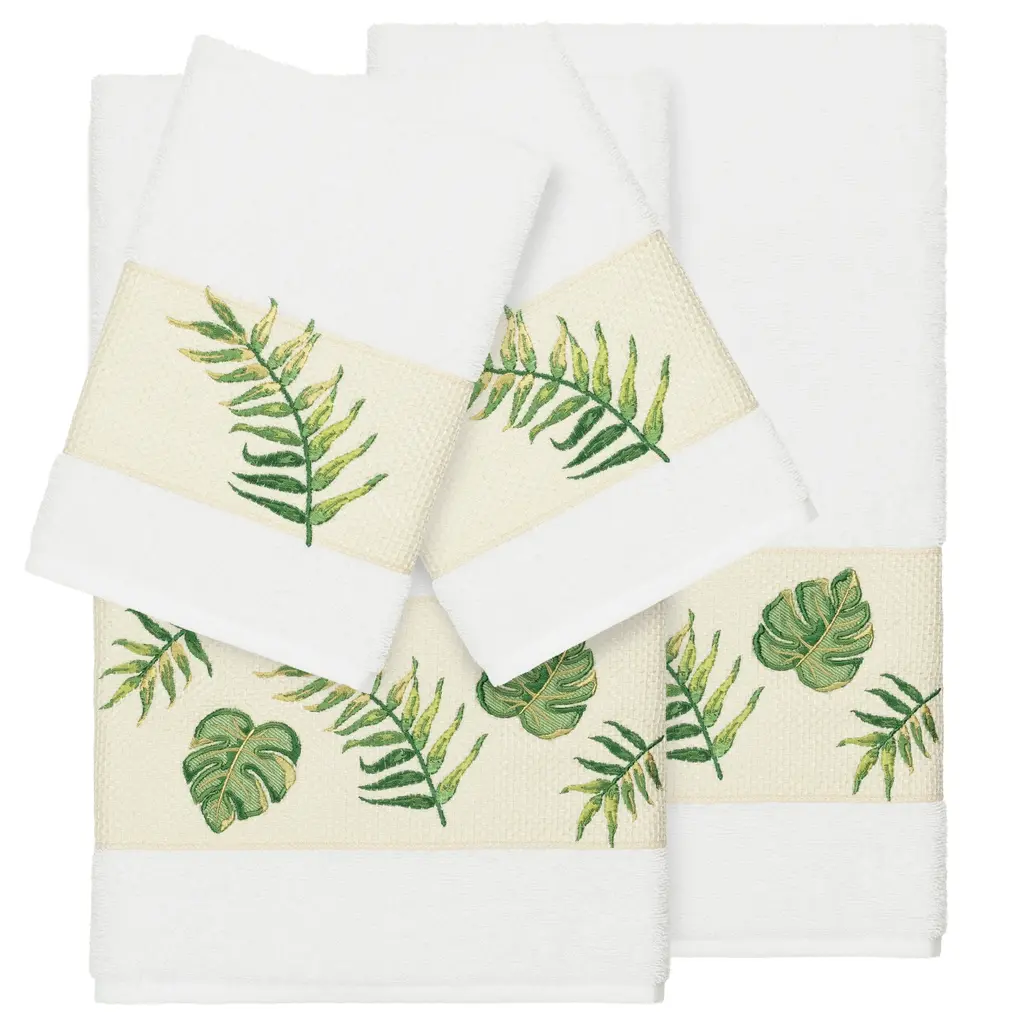 This authentic hotel and spa 4-piece towel set is made from plush, high end Turkish cotton for supreme absorbency and durability. The beautiful white towels are embellished with a variety of tropical palm fronds embroidery design with a textured woven border to add that special touch to your bathroom.Includes: Two (2) bath towels and two (2) hand towels100-percent soft and absorbent Turkish cottonEmbellished with an embroidered designThese luxurious towel are produced in a state of the art green factory in Turkey which runs on 100-percent solar energyCare instructions: Machine wash and dryMade in TurkeyDimensions: Bath towel - 27 inches wide x 54 inches long; Hand towel - 16 inches wide x 30 inches long