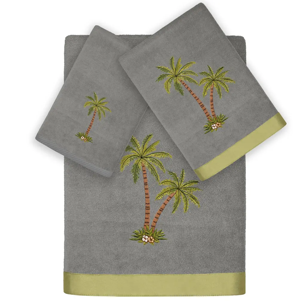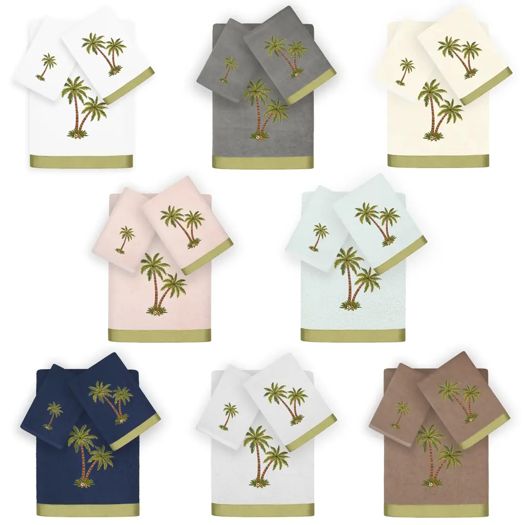Your decorations are not complete without island style embroidered towels for the comfort of your family and guests. The PALMERA Towels feature swaying palm trees and are trimmed with a matching lustrous border. Cloud soft and super absorbent, these luxurious, durable towels keep their plush appearance after washing. This collection is available in 8 elegant colors: White, Beige, Blush, Aqua, Silver, Cocoa, Charcoal, and Marine. The PALMERA Towel Collection brings a tropical spirit and richness to your home decor and makes a great gift!