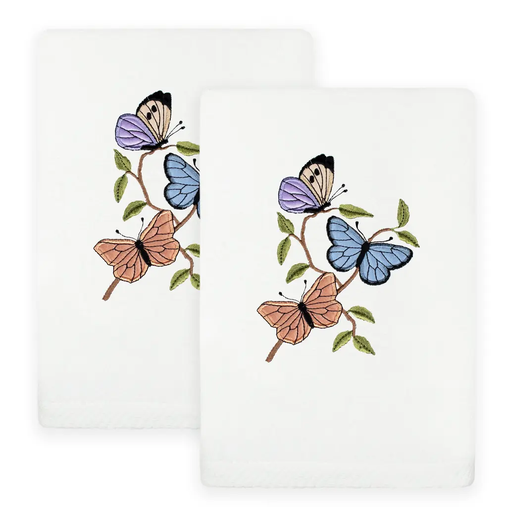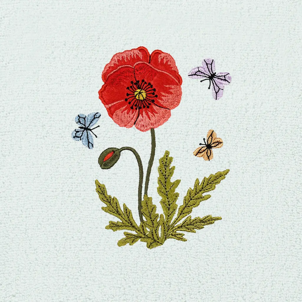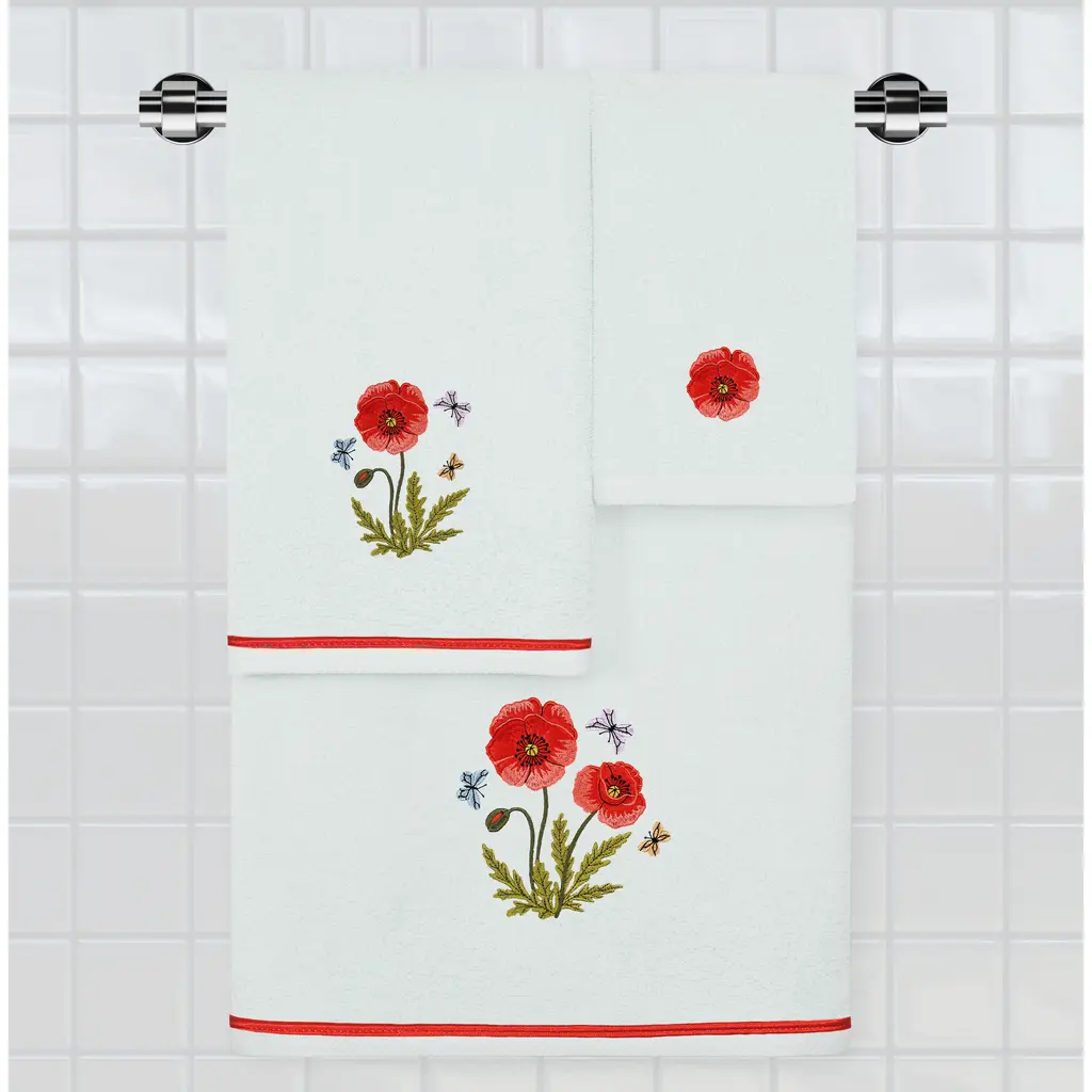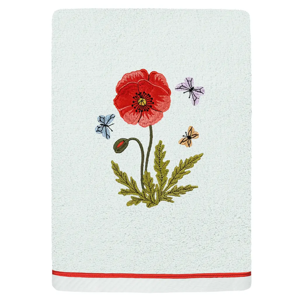 Create a mood of cottage charm in your bath with the POLLY Embellished Towel Collection. These towels feature an applique embroidered bouquet of vibrant poppies and foliage, highlighted by floating butterflies. Cloud soft and super absorbent, these luxurious, durable towels keep their plush appearance after washing. This collection is available in 8 elegant colors: White, Beige, Blush, Aqua, Silver, Cocoa, Charcoal and Marine. The POLLY Towel Collection brings a natural spirit and richness to your home decor and makes a great gift!
