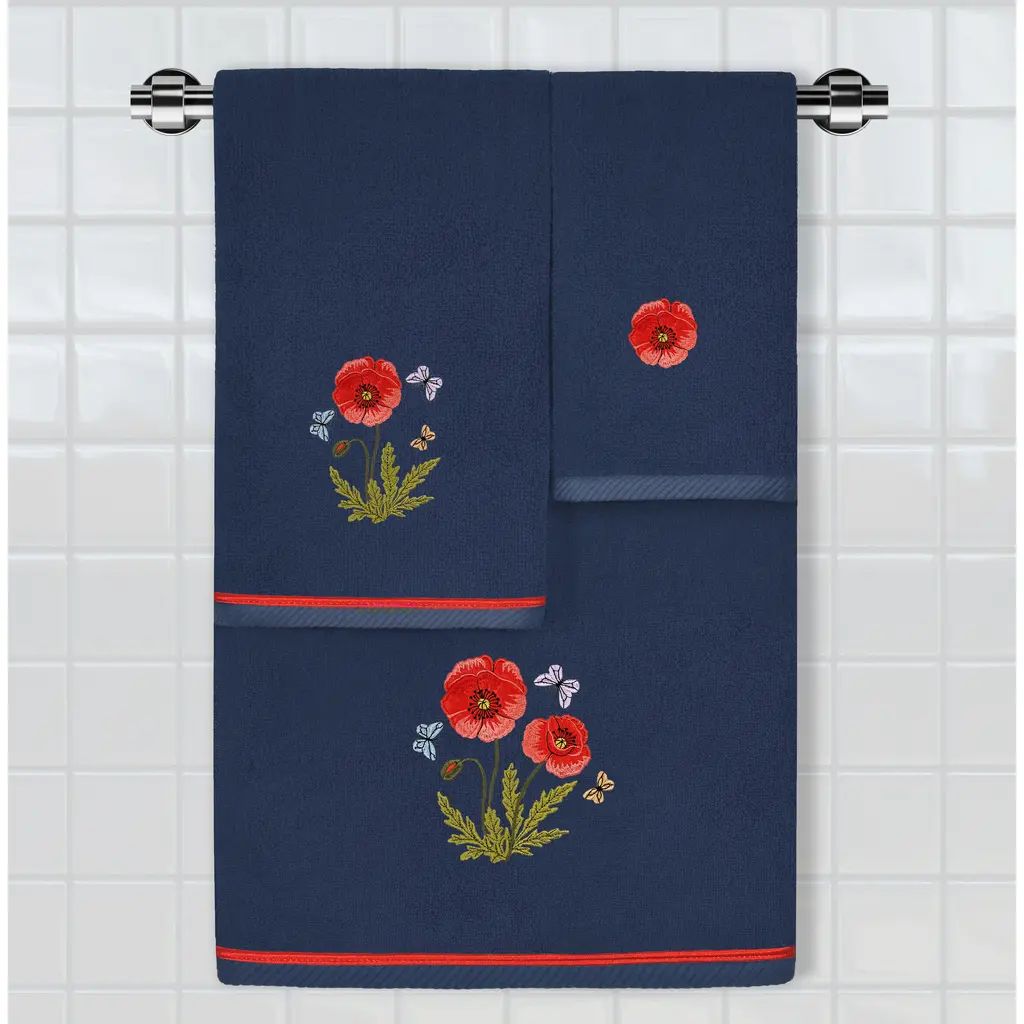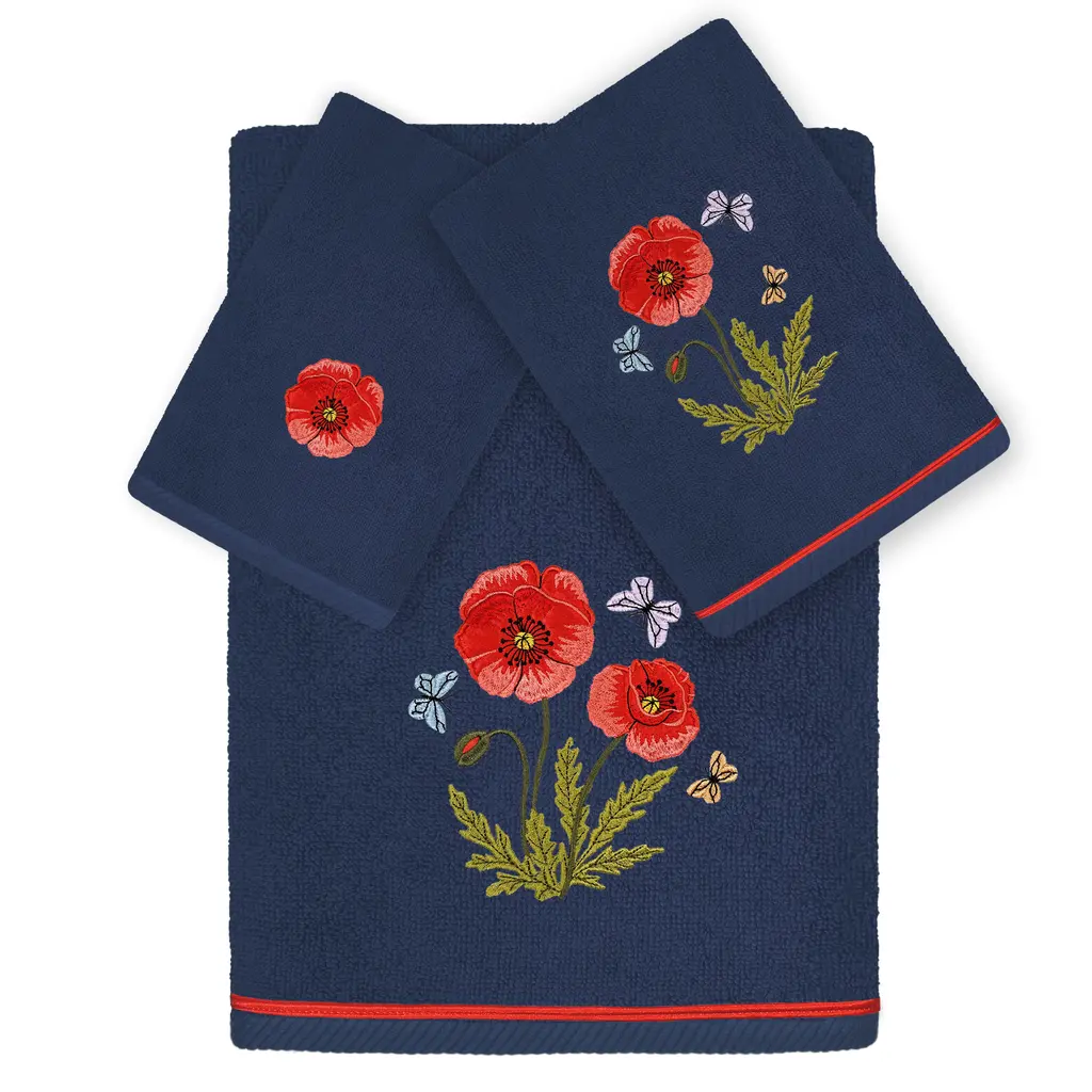 Create a mood of cottage charm in your bath with the POLLY Embellished Towel Collection. These towels feature an applique embroidered bouquet of vibrant poppies and foliage, highlighted by floating butterflies. Cloud soft and super absorbent, these luxurious, durable towels keep their plush appearance after washing. This collection is available in 8 elegant colors: White, Beige, Blush, Aqua, Silver, Cocoa, Charcoal and Marine. The POLLY Towel Collection brings a natural spirit and richness to your home decor and makes a great gift! Note: Due to variations in computer screen resolutions, slight color differences may exist between images provided and actual product.