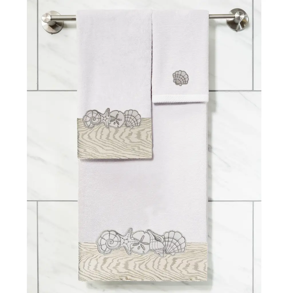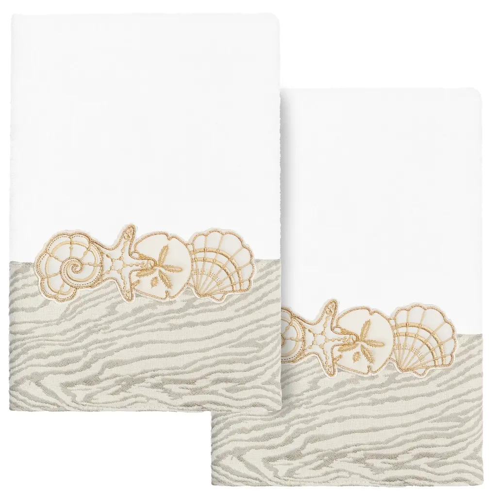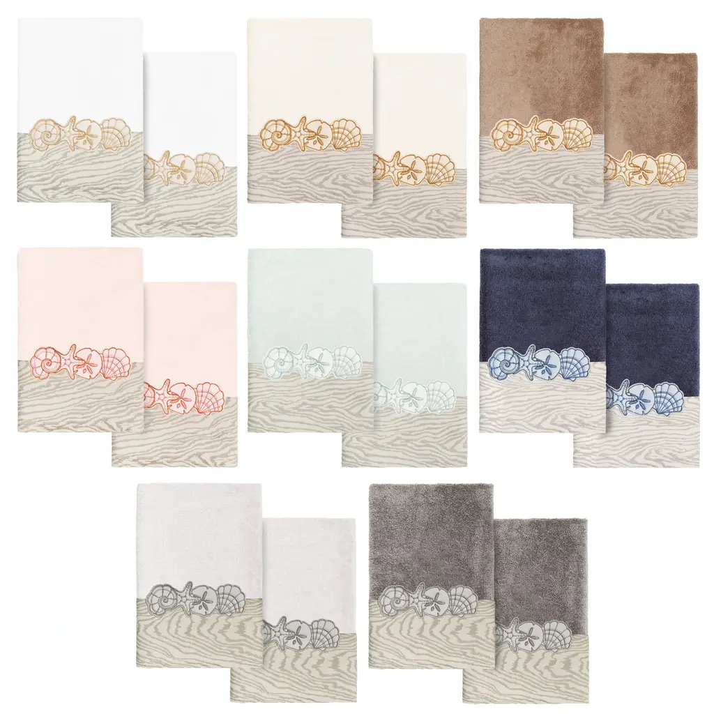 Your bath decor is not complete without lovely embroidered towels by Authentic Hotel and Spa for the comfort of your family and guests. The Shell Row towels feature sparkling applique seashells on a weathered woodgrain pattern jacquard border. Cloud soft and super absorbent, these luxurious, durable towels keep their plush appearance after washing. This collection is available in 8 elegant colors: White, Beige, Blush, Aqua, Silver, Cocoa, Charcoal and Marine. The Shell Row Towel Collection brings seaside spirit and richness to your home decor and makes a great gift. Note: Due to variations in computer screen resolutions, slight color differences may exist between images provided and actual product.Embroidered Seashell design100% Premium Turkish CottonSuperbly absorbent and quick dryingAvailable in 8 elegant colorsMachine wash cold, No bleach, line dry or dry cleanSet includes 2 hand towels (16" x 30")Made in TurkeyProudly Embellished in USA