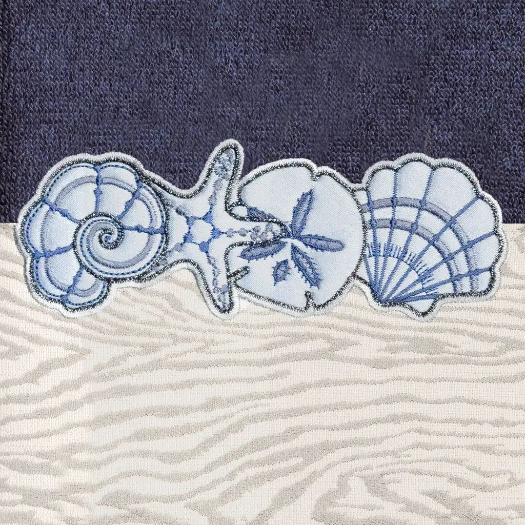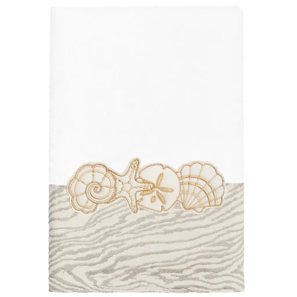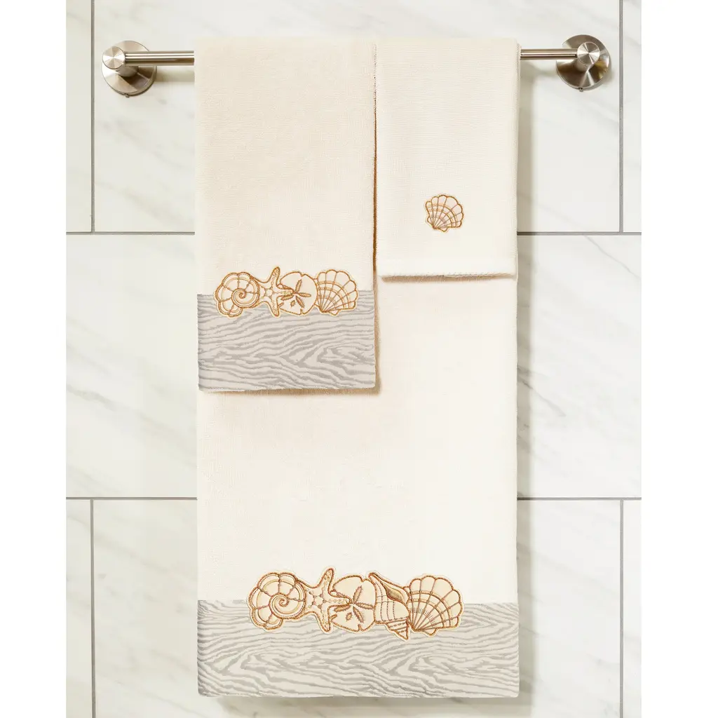 Your bath decor is not complete without lovely embroidered towels by Authentic Hotel and Spa for the comfort of your family and guests. The Shell Row towels feature sparkling applique seashells on a weathered woodgrain pattern jacquard border. Cloud soft and super absorbent, these luxurious, durable towels keep their plush appearance after washing. This collection is available in 8 elegant colors: White, Beige, Blush, Aqua, Silver, Cocoa, Charcoal and Marine. The Shell Row Towel Collection brings seaside spirit and richness to your home decor and makes a great gift. Note: Due to variations in computer screen resolutions, slight color differences may exist between images provided and actual product.Embroidered Seashell design100% Premium Turkish CottonSuperbly absorbent and quick dryingAvailable in 8 elegant colorsMachine wash cold, No bleach, line dry or dry cleanSet includes 2 hand towels (16" x 30")Made in TurkeyProudly Embellished in USA