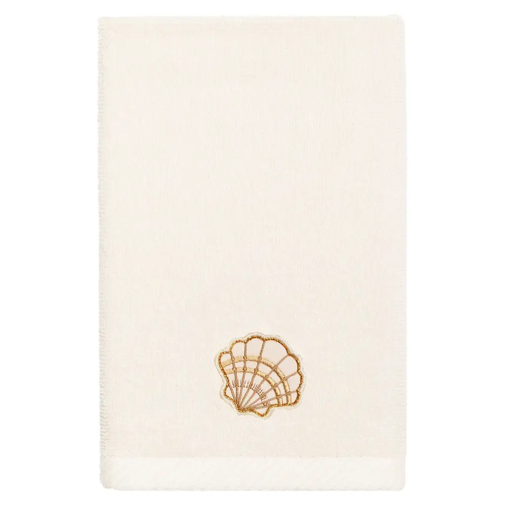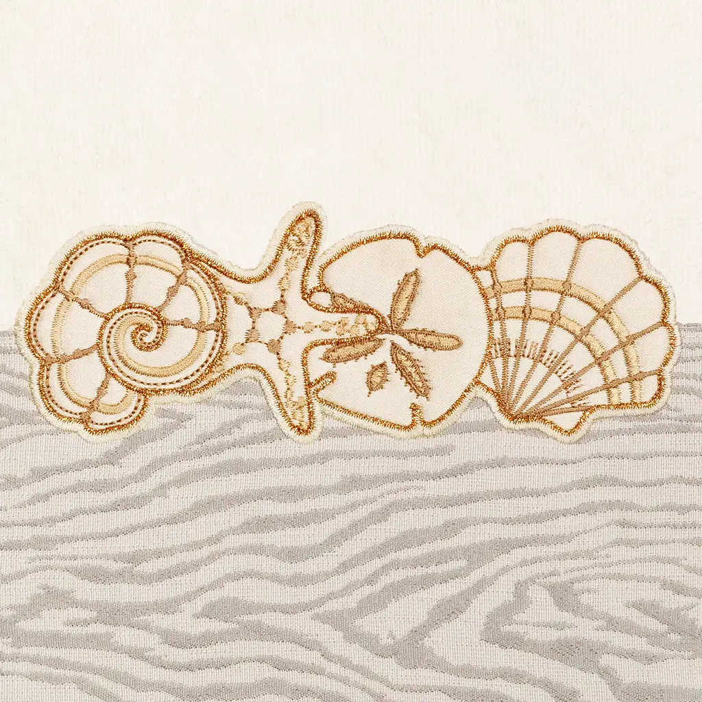 Your bath decor is not complete without lovely embroidered towels by Authentic Hotel and Spa for the comfort of your family and guests. The Shell Row towels feature sparkling applique seashells on a weathered woodgrain pattern jacquard border. Cloud soft and super absorbent, these luxurious, durable towels keep their plush appearance after washing. This collection is available in 8 elegant colors: White, Beige, Blush, Aqua, Silver, Cocoa, Charcoal and Marine. The Shell Row Towel Collection brings seaside spirit and richness to your home decor and makes a great gift. Note: Due to variations in computer screen resolutions, slight color differences may exist between images provided and actual product.Embroidered Seashell design100% Premium Turkish CottonSuperbly absorbent and quick dryingAvailable in 8 elegant colorsMachine wash cold, No bleach, line dry or dry cleanSet includes 1 bath towel (27" x 54") / 1 hand towel (16" x 30") / 1 fingertip towel (11" x 18")Made in TurkeyProudly Embellished in USA