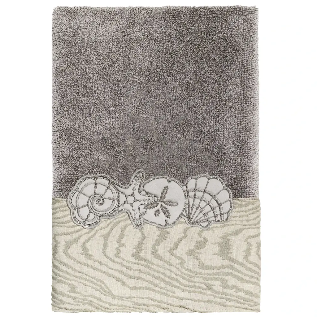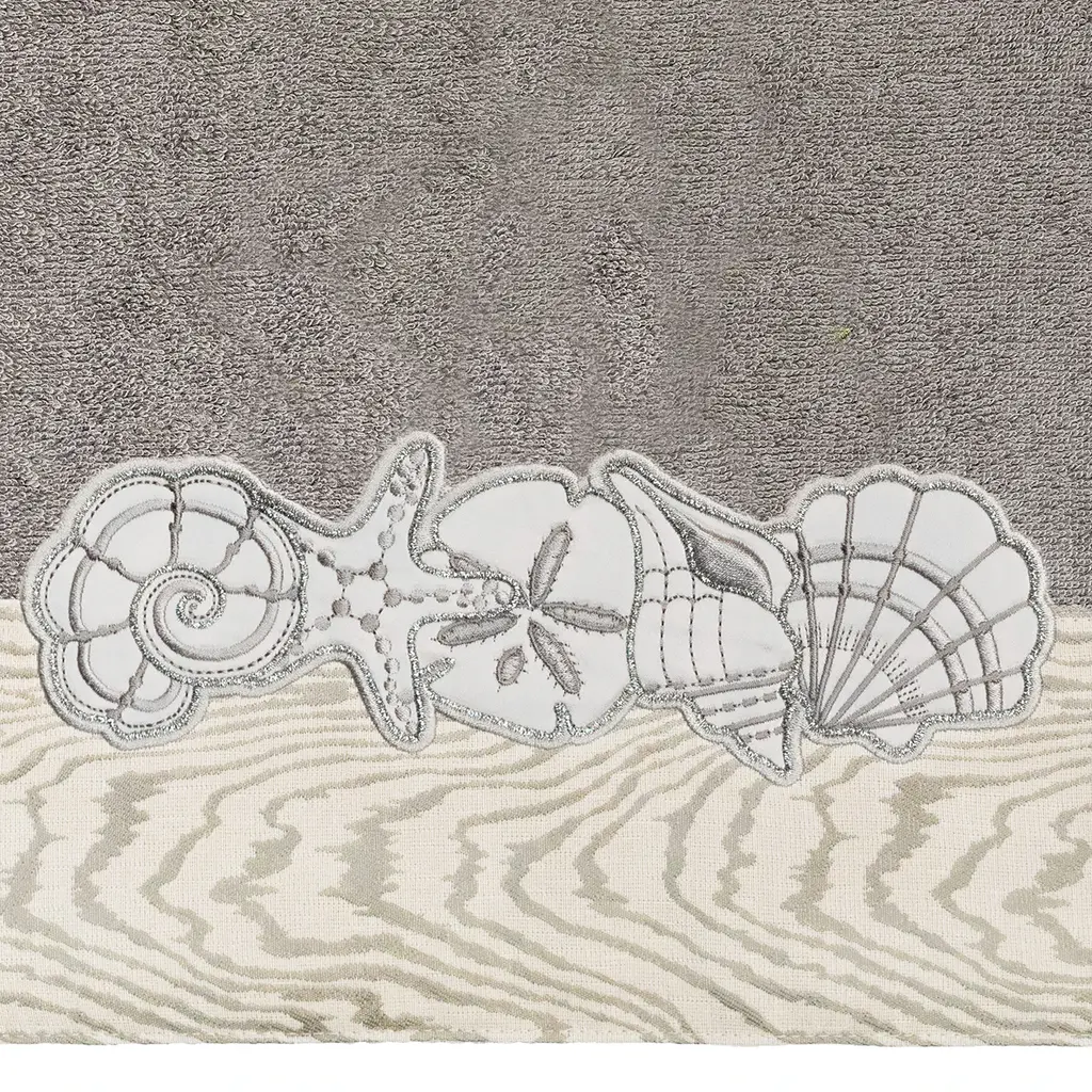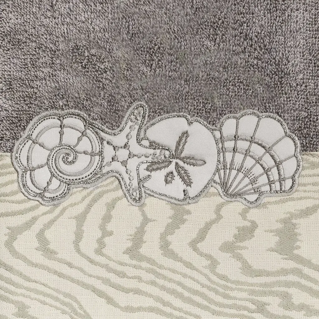 Your bath decor is not complete without beautiful embroidered towels by Authentic Hotel and Spa for the comfort of your family and guests. The Shell Row towels feature sparkling applique seashells on a weathered woodgrain pattern jacquard border. Cloud soft and super absorbent, these luxurious, durable towels keep their plush appearance after washing. This collection is available in 8 elegant colors: White, Beige, Blush, Aqua, Silver, Cocoa, Charcoal and Marine. The Shell Row Towel Collection brings seaside spirit and richness to your home decor and makes a great gift. Note: Due to variations in computer screen resolutions, slight color differences may exist between images provided and actual product.Embroidered Seashell design100% Premium Turkish CottonSuperbly absorbent and quick dryingAvailable in 8 elegant colorsMachine wash cold, No bleach, line dry or dry cleanSet includes 1 bath towel (27" x 54") / 2 hand towels (16" x 30")Made in TurkeyProudly Embellished in USA