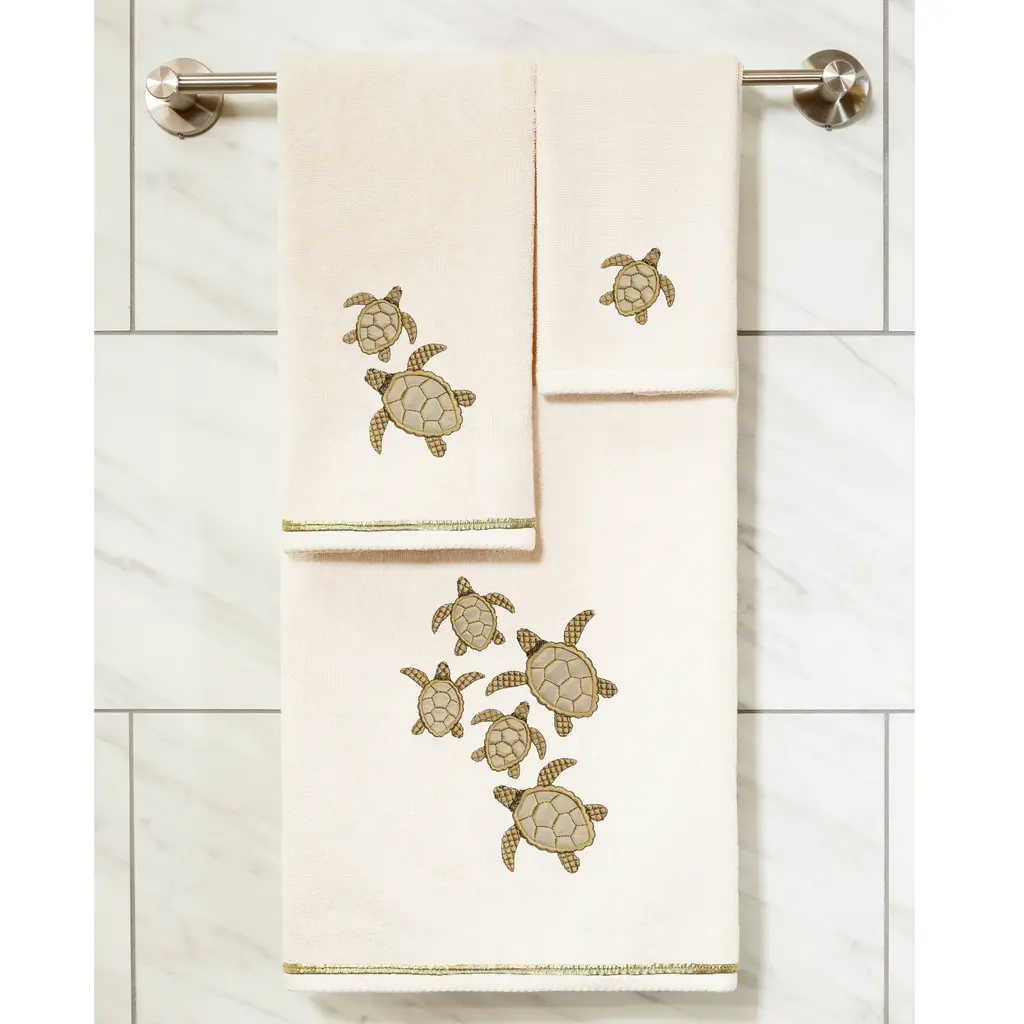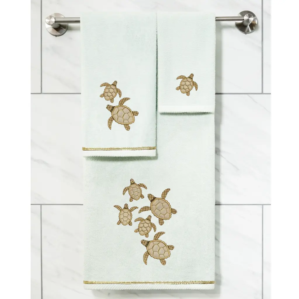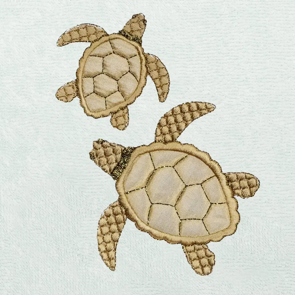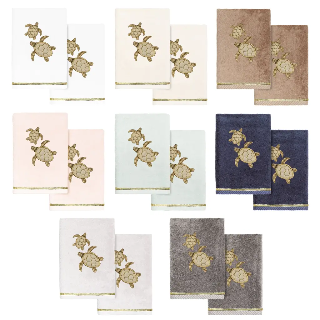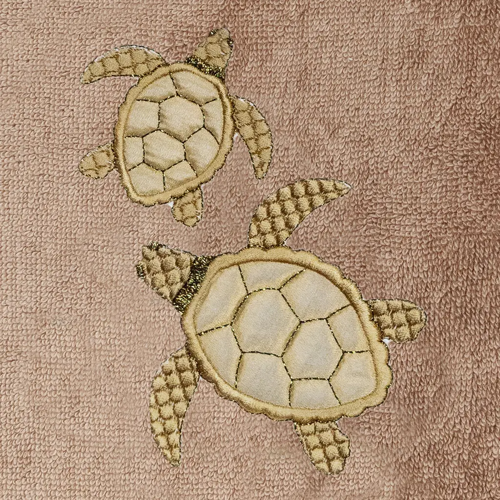 Your decorations are not complete without light hearted embroidered towels by Authentic Hotel and Spa for the comfort of your family and guests. The Tortuga towels feature sparkling applique turtles and are trimmed with a matching metallic cord. Cloud soft and super absorbent, these luxurious, durable towels keep their plush appearance after washing. This collection is available in 8 elegant colors: White, Beige, Blush, Aqua, Silver, Cocoa, Charcoal and Marine. The Tortuga Towel Collection brings a seaside spirit and richness to your home decor and makes a great gift. Note: Due to variations in computer screen resolutions, slight color differences may exist between images provided and actual product.Embroidered Turtle design100% Premium Turkish CottonSuperbly absorbent and quick dryingAvailable in 8 elegant colorsMachine wash cold, No bleach, line dry or dry cleanSet includes 2 hand towels (16" x 30")Made in TurkeyProudly Embellished in USA