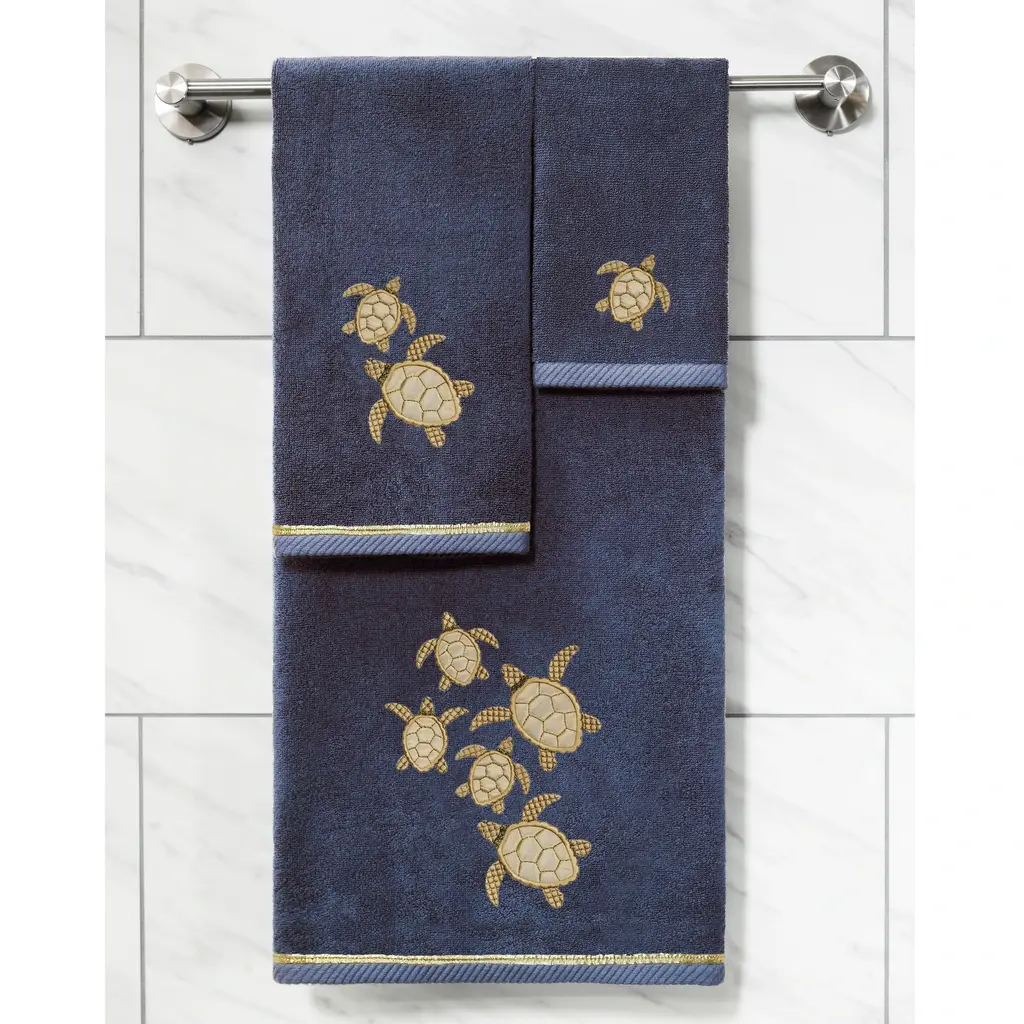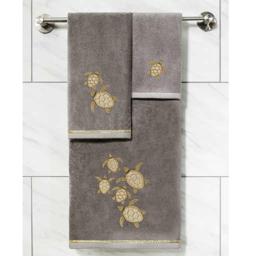Your decorations are not complete without light hearted embroidered towels by Authentic Hotel and Spa for the comfort of your family and guests. The Tortuga towels feature sparkling applique turtles and are trimmed with a matching metallic cord. Cloud soft and super absorbent, these luxurious, durable towels keep their plush appearance after washing. This collection is available in 8 elegant colors: White, Beige, Blush, Aqua, Silver, Cocoa, Charcoal and Marine. The Tortuga Towel Collection brings a seaside spirit and richness to your home decor and makes a great gift. Note: Due to variations in computer screen resolutions, slight color differences may exist between images provided and actual product.Embroidered Turtle design100% Premium Turkish CottonSuperbly absorbent and quick dryingAvailable in 8 elegant colorsMachine wash cold, No bleach, line dry or dry cleanSet includes 2 hand towels (16" x 30")Made in TurkeyProudly Embellished in USA