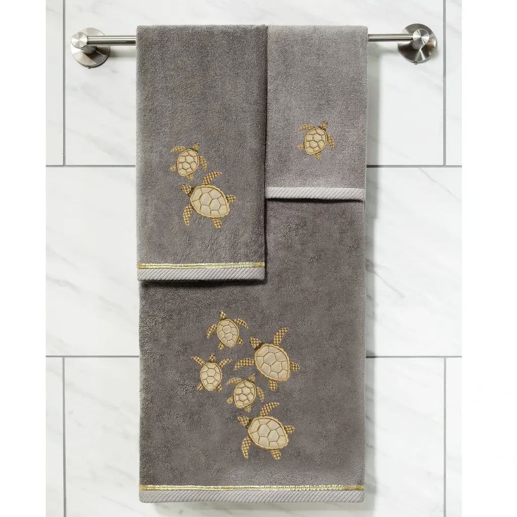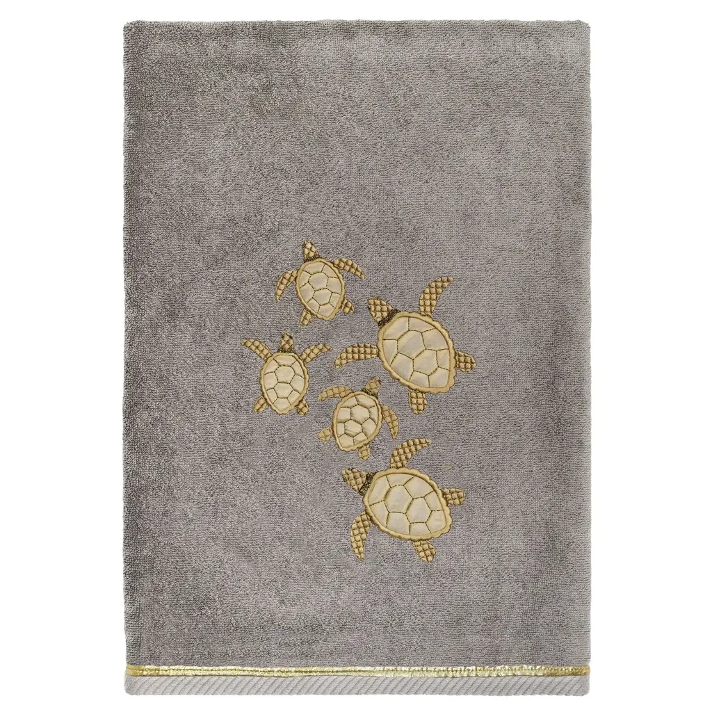 Your decorations are not complete without light hearted embroidered towels by Authentic Hotel and Spa for the comfort of your family and guests. The Tortuga towels feature sparkling applique turtles and are trimmed with a matching metallic cord. Cloud soft and super absorbent, these luxurious, durable towels keep their plush appearance after washing. This collection is available in 8 elegant colors: White, Beige, Blush, Aqua, Silver, Cocoa, Charcoal and Marine. The Tortuga Towel Collection brings a seaside spirit and richness to your home decor and makes a great gift. Note: Due to variations in computer screen resolutions, slight color differences may exist between images provided and actual product.Embroidered Turtle design100% Premium Turkish CottonSuperbly absorbent and quick dryingAvailable in 8 elegant colorsMachine wash cold, No bleach, line dry or dry cleanSet includes 1 bath towel (27" x 54") / 2 hand towels (16" x 30")Made in TurkeyProudly Embellished in USA