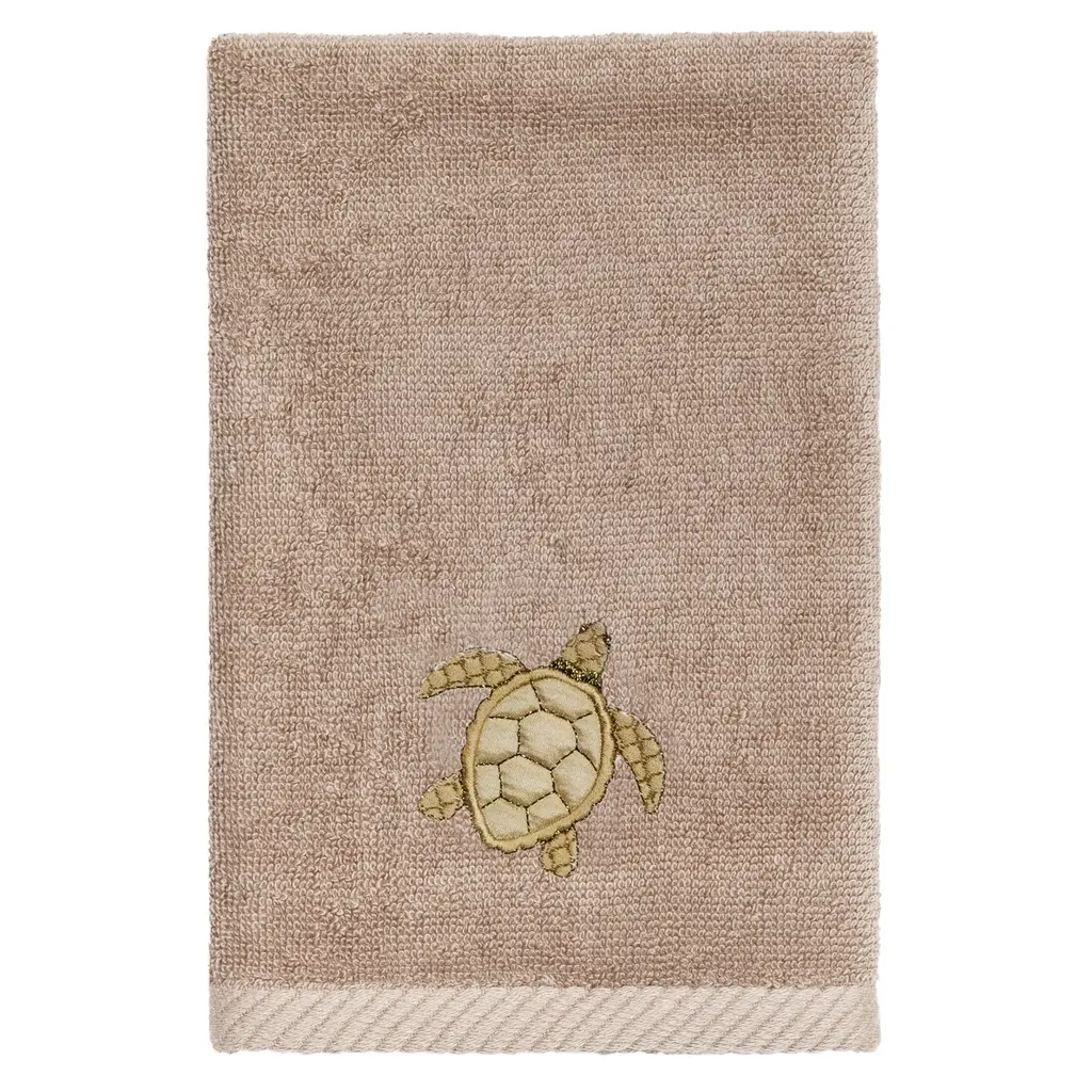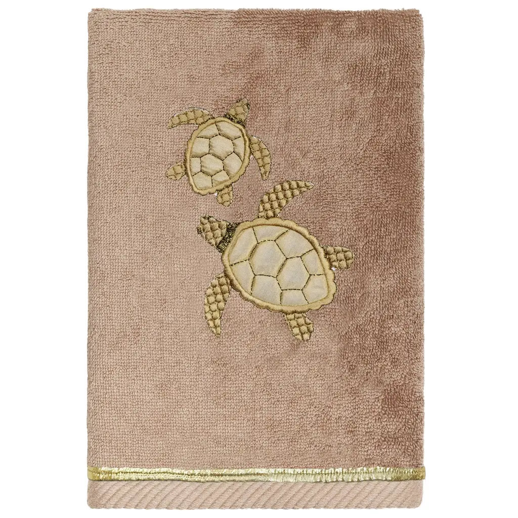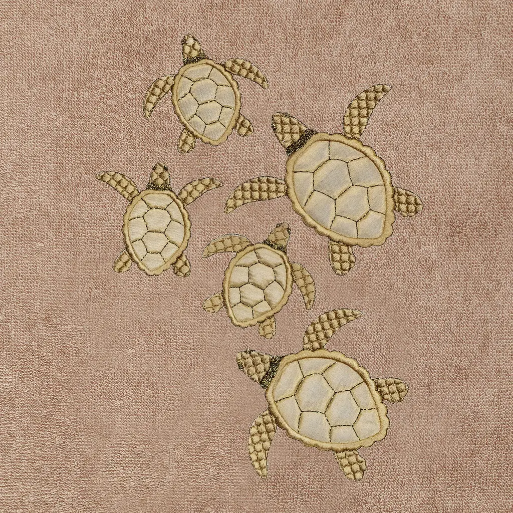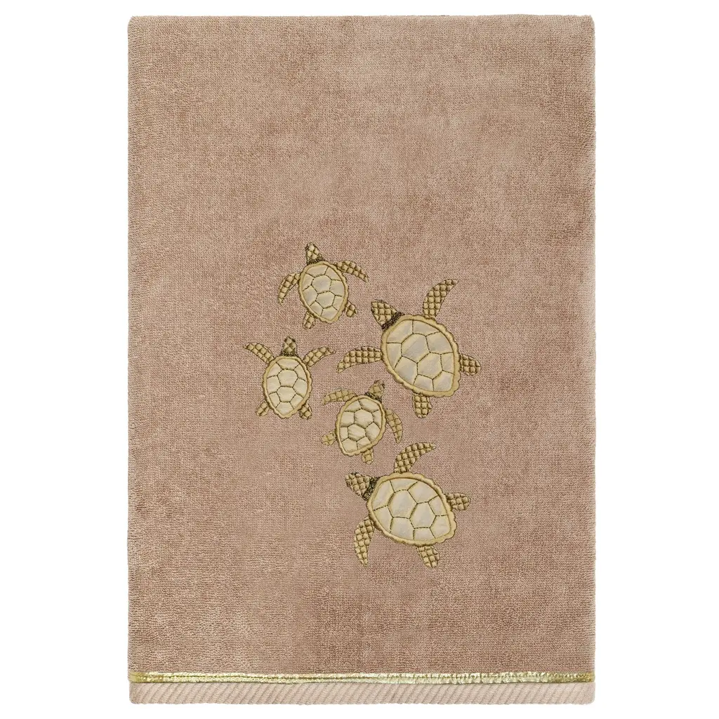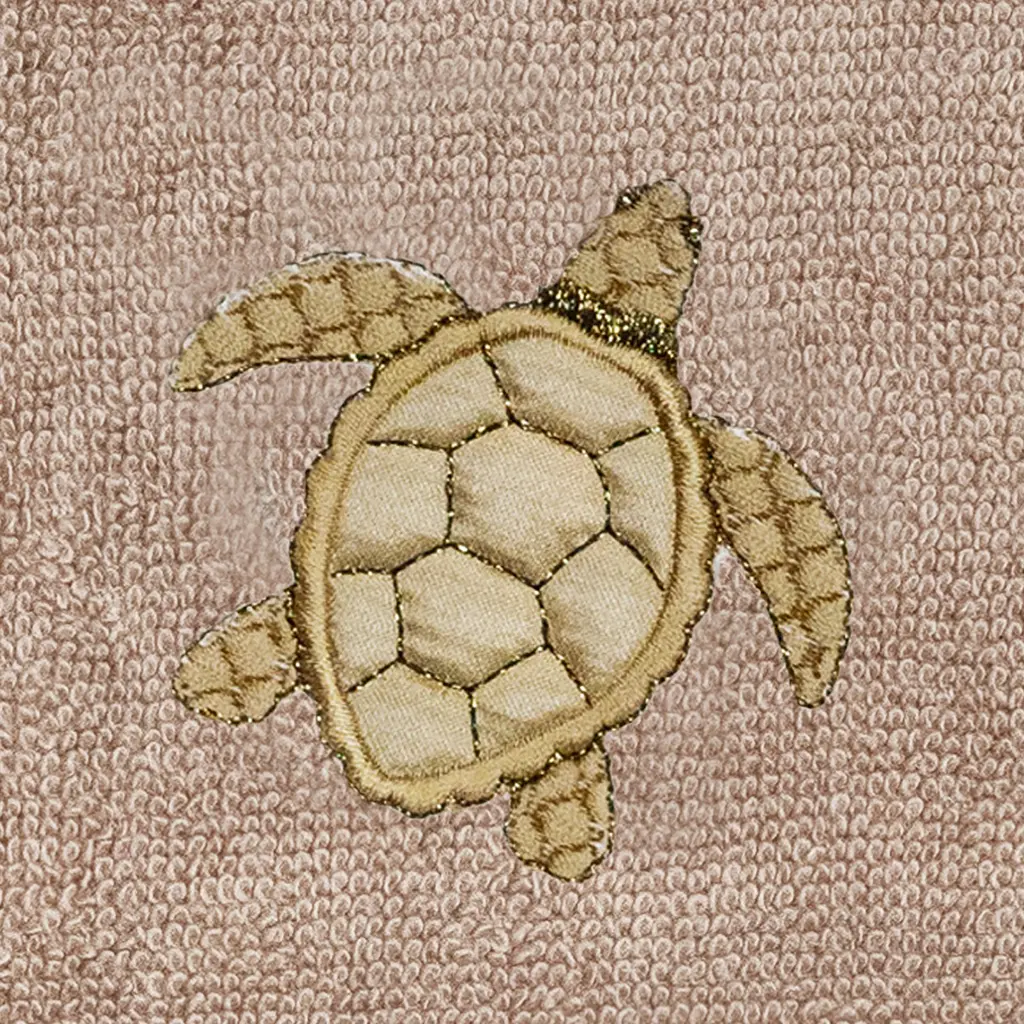 Your decorations are not complete without light hearted embroidered towels by Authentic Hotel and Spa for the comfort of your family and guests. The Tortuga towels feature sparkling applique turtles and are trimmed with a matching metallic cord. Cloud soft and super absorbent, these luxurious, durable towels keep their plush appearance after washing. This collection is available in 8 elegant colors: White, Beige, Blush, Aqua, Silver, Cocoa, Charcoal and Marine. The Tortuga Towel Collection brings a seaside spirit and richness to your home decor and makes a great gift. Note: Due to variations in computer screen resolutions, slight color differences may exist between images provided and actual product.Embroidered Turtle design100% Premium Turkish CottonSuperbly absorbent and quick dryingAvailable in 8 elegant colorsMachine wash cold, No bleach, line dry or dry cleanSet includes 1 bath towel (27" x 54") / 1 hand towel (16" x 30") / 1 fingertip towel (11" x 18")Made in TurkeyProudly Embellished in USA