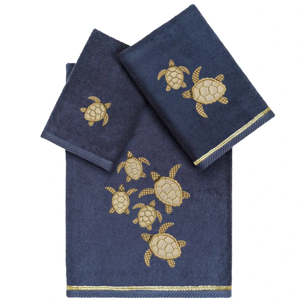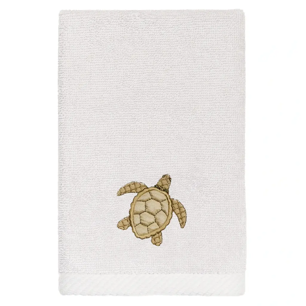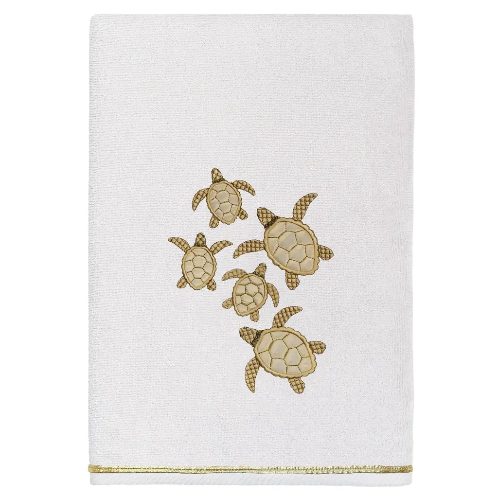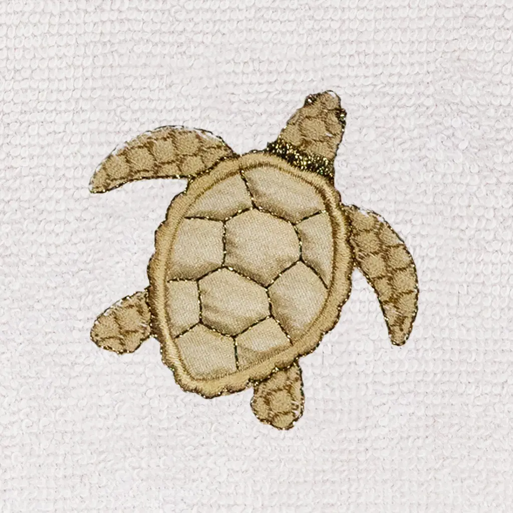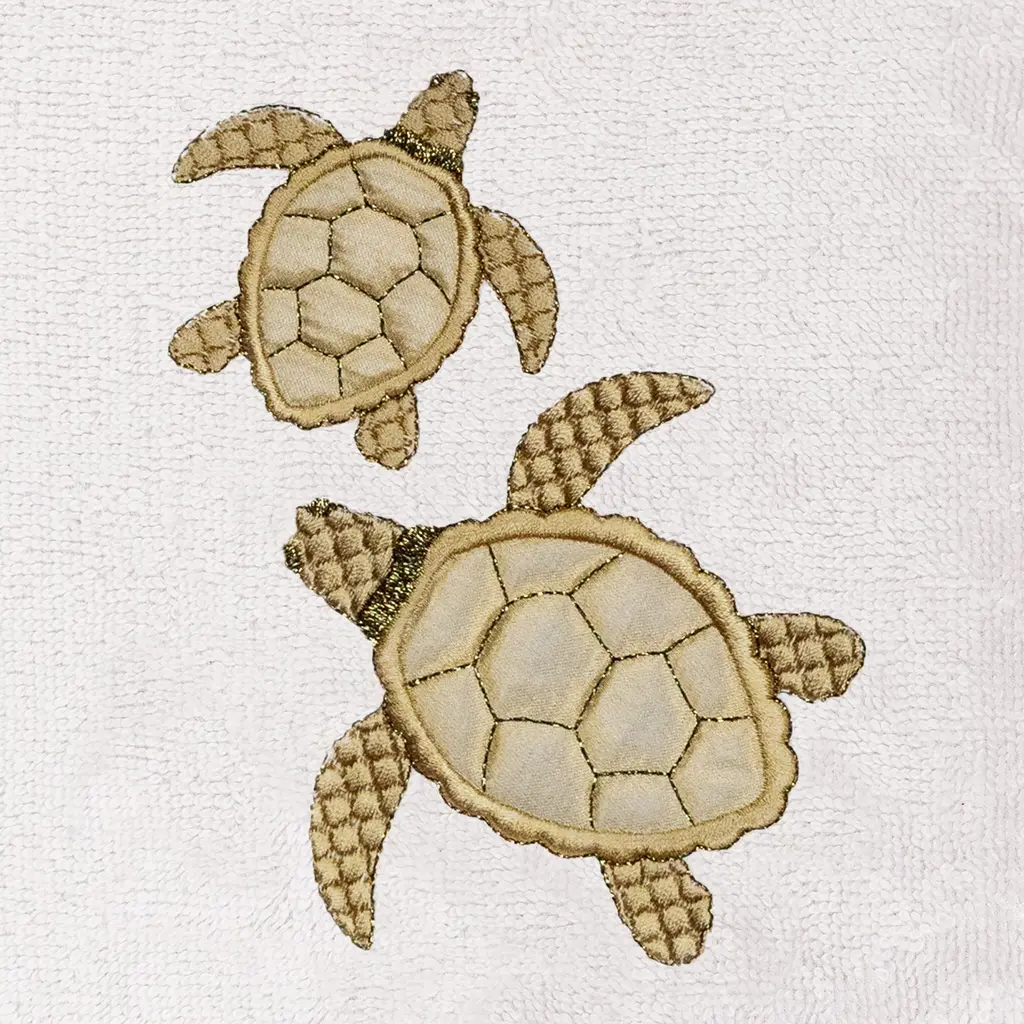 Your decorations are not complete without light hearted embroidered towels by Authentic Hotel and Spa for the comfort of your family and guests. The Tortuga towels feature sparkling applique turtles and are trimmed with a matching metallic cord. Cloud soft and super absorbent, these luxurious, durable towels keep their plush appearance after washing. This collection is available in 8 elegant colors: White, Beige, Blush, Aqua, Silver, Cocoa, Charcoal and Marine. The Tortuga Towel Collection brings a seaside spirit and richness to your home decor and makes a great gift. Note: Due to variations in computer screen resolutions, slight color differences may exist between images provided and actual product.Embroidered Turtle design100% Premium Turkish CottonSuperbly absorbent and quick dryingAvailable in 8 elegant colorsMachine wash cold, No bleach, line dry or dry cleanSet includes 1 bath towel (27" x 54") / 1 hand towel (16" x 30") / 1 fingertip towel (11" x 18")Made in TurkeyProudly Embellished in USA