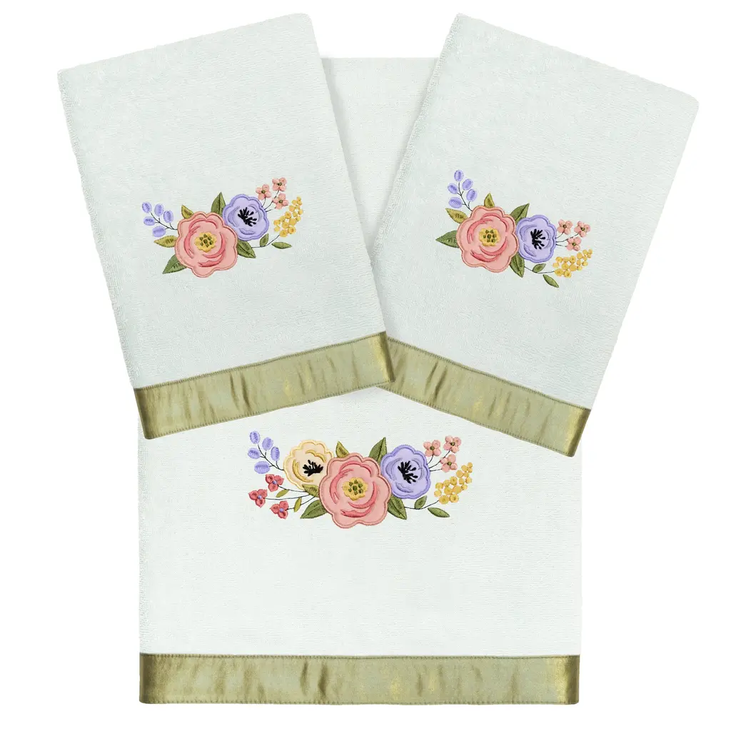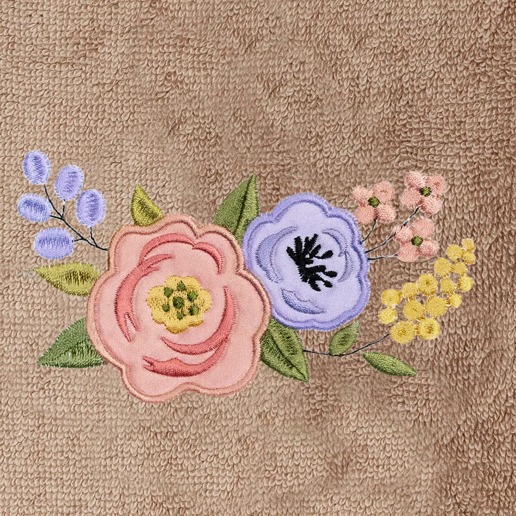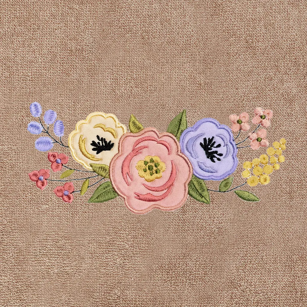 Create a mood of fresh charm in your bath with the Verano Embellished Towel Collection by Authentic Hotel and Spa. These towels feature an applique embroidered bouquet of vibrant flowers and are trimmed by a lustrous border. Cloud soft and super absorbent, these luxurious, durable towels keep their plush appearance after washing. This collection is available in 8 elegant colors: White, Beige, Blush, Aqua, Silver, Cocoa, Charcoal and Marine. The Verano Towel Collection brings a bright spirit and richness to your home decor and makes a great gift! Note: Due to variations in computer screen resolutions, slight color differences may exist between images provided and actual product.Embroidered Bouquet design100% Premium Turkish CottonSuperbly absorbent and quick dryingAvailable in 8 elegant colorsMachine wash cold, No bleach, line dry or dry cleanSet includes 1 bath towel (27" x 54") / 2 hand towels (16" x 30")Made in TurkeyProudly Embellished in USA
