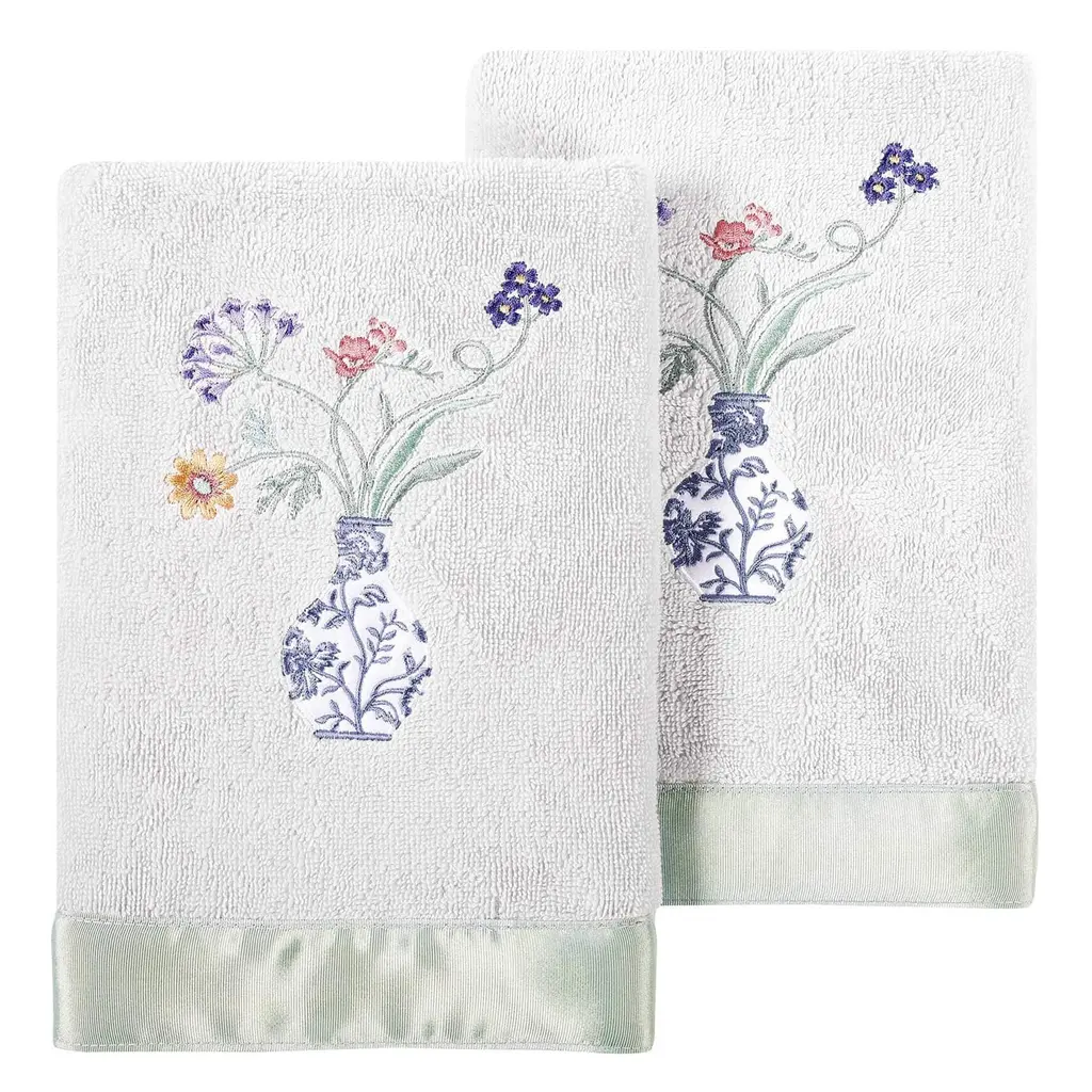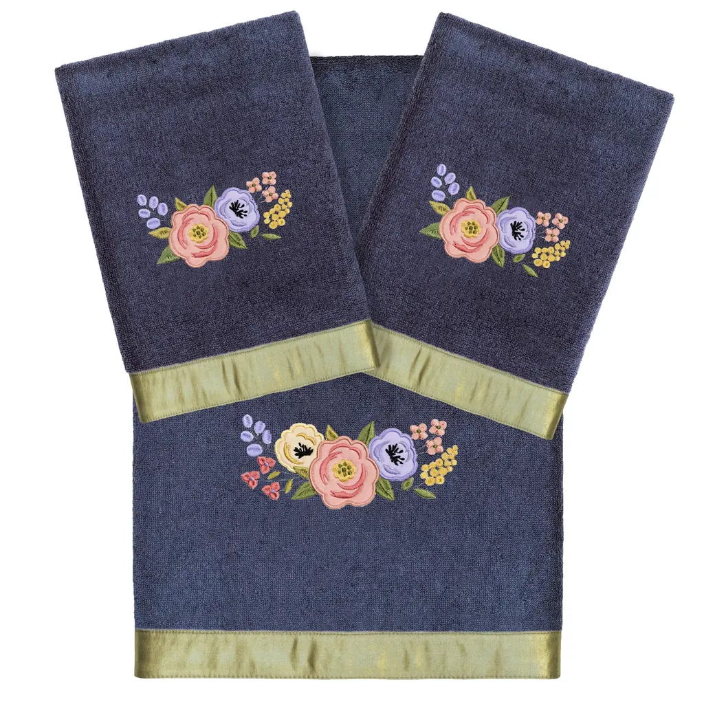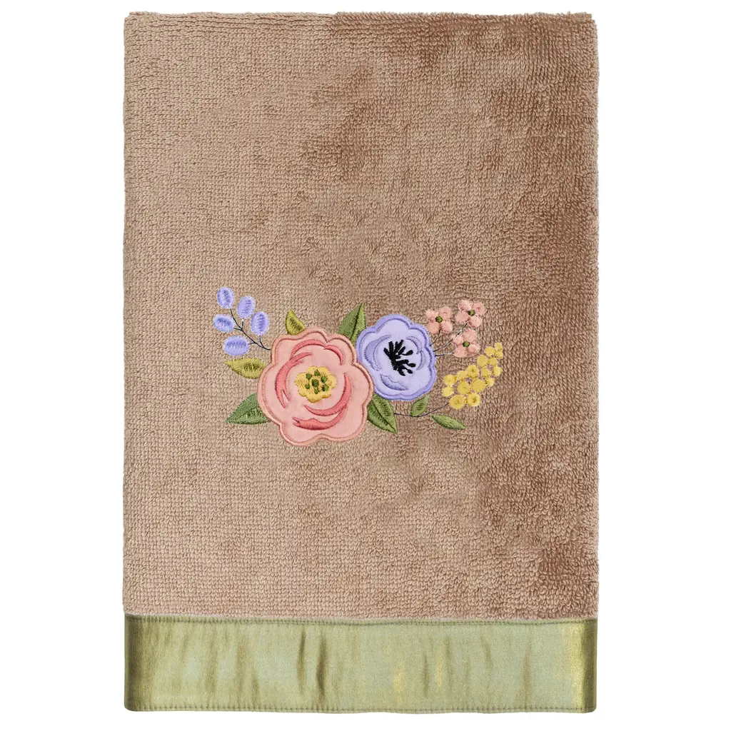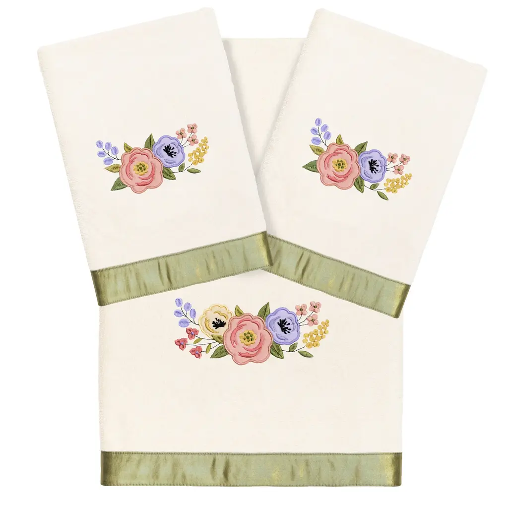 Create a mood of fresh charm in your bath with the Verano Embellished Towel Collection by Authentic Hotel and Spa. These towels feature an applique embroidered bouquet of vibrant flowers and are trimmed by a lustrous border. Cloud soft and super absorbent, these luxurious, durable towels keep their plush appearance after washing. This collection is available in 8 elegant colors: White, Beige, Blush, Aqua, Silver, Cocoa, Charcoal and Marine. The Verano Towel Collection brings a bright spirit and richness to your home decor and makes a great gift! Note: Due to variations in computer screen resolutions, slight color differences may exist between images provided and actual product.Embroidered Bouquet design100% Premium Turkish CottonSuperbly absorbent and quick dryingAvailable in 8 elegant colorsMachine wash cold, No bleach, line dry or dry cleanSet includes 1 bath towel (27" x 54") / 2 hand towels (16" x 30")Made in TurkeyProudly Embellished in USA
