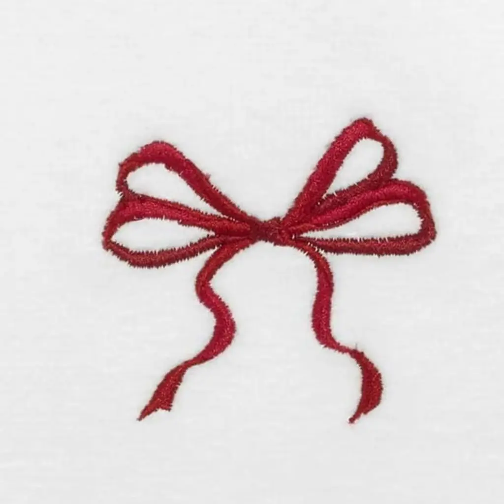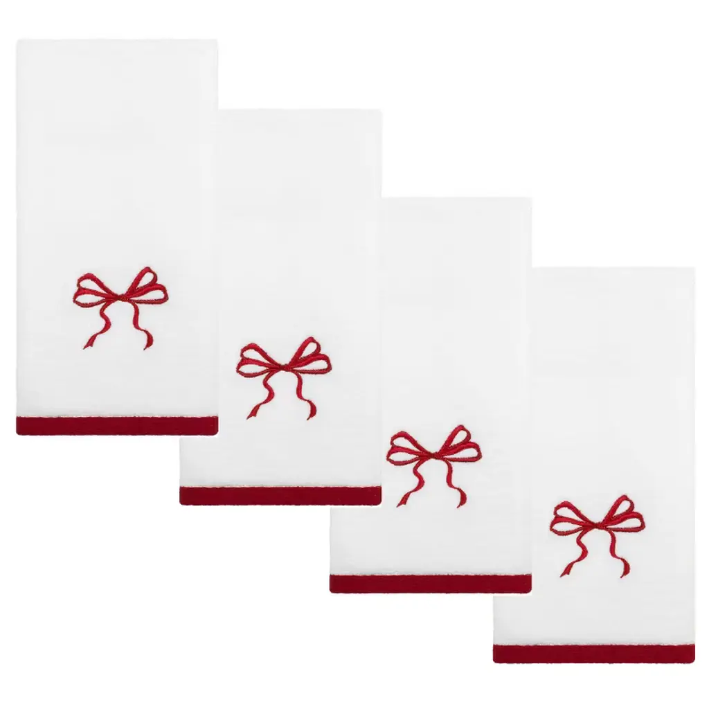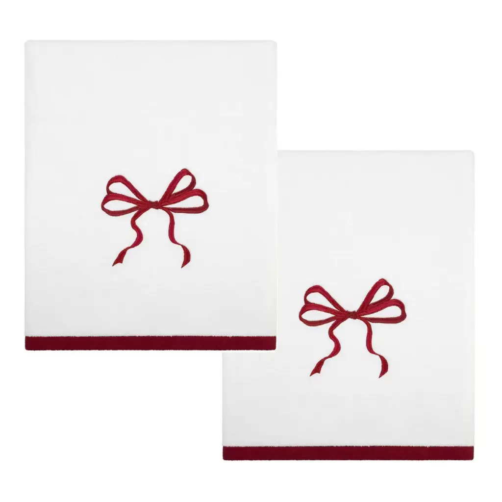 The Avanti Christmas Bows Decorative Embroidered Fingertip Towel 2-Pack features a red ribbon with double bows in the center on a white velour ground. The 100% cotton 11" x 18" towels are finished with a coordinating red woven polyester border. Bath, hand towels and other accessories also available.