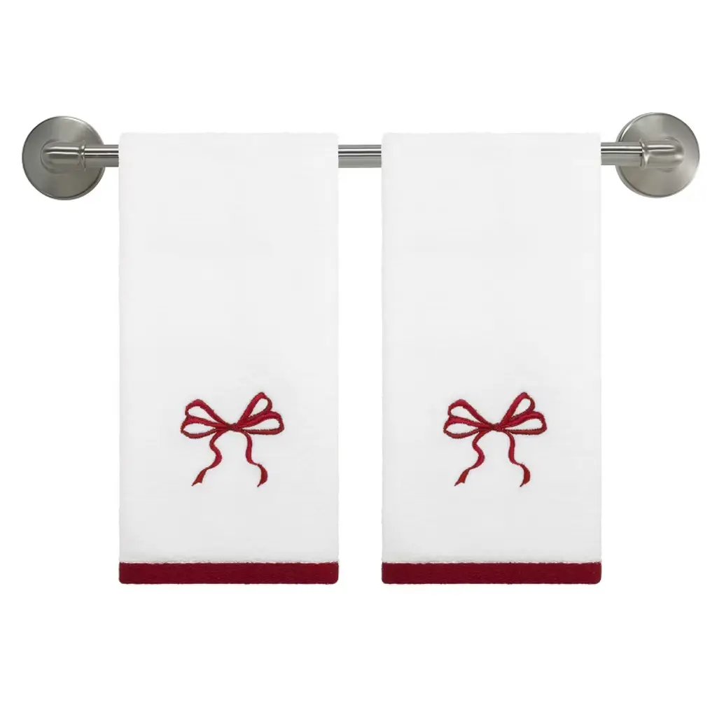 The Avanti Christmas Bows Decorative Embroidered Fingertip Towel 4-Pack features a red ribbon with double bows in the center on a white velour ground. The 100% cotton 11" x 18" towels are finished with a coordinating red woven polyester border. Bath, hand towels and other accessories also available.
