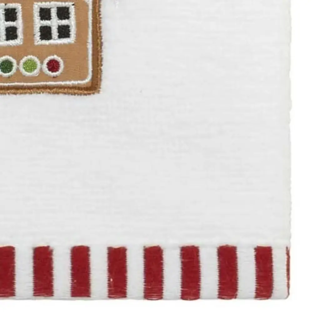 The Avanti Gingerbread Man Decorative Embroidered Fingertip Towel 2-pack features a well-decorated gingerbread house on a white velour ground. The 11" x 18" 100% cotton towels are finished with a white and red vertical striped polyester border. Bath, hand towels, accessories also available.
