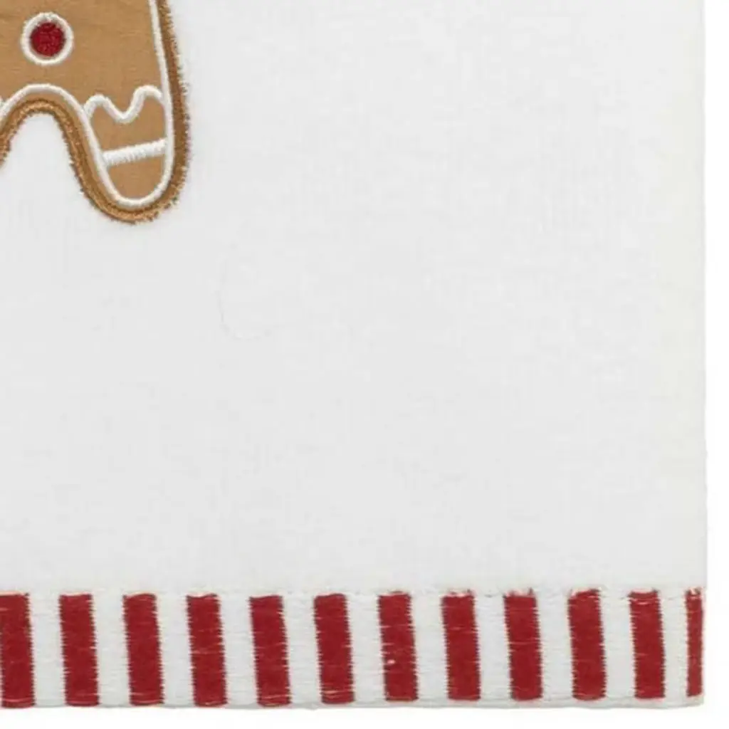 The Avanti Gingerbread Man Decorative Embroidered Hand Towel 2-pack features a gingerbread man with colorful buttons on a white velour ground. The 16" x 28" 100% cotton towels are finished with a white and red vertical striped polyester border. Bath, fingertip towels, accessories also available.