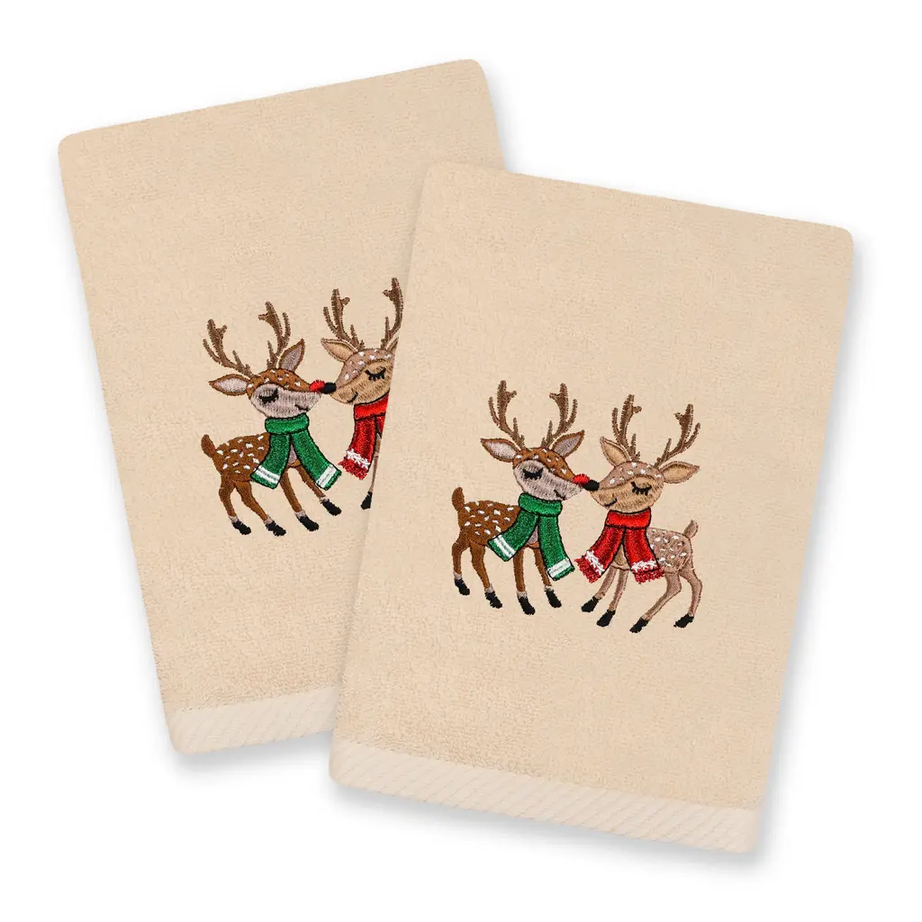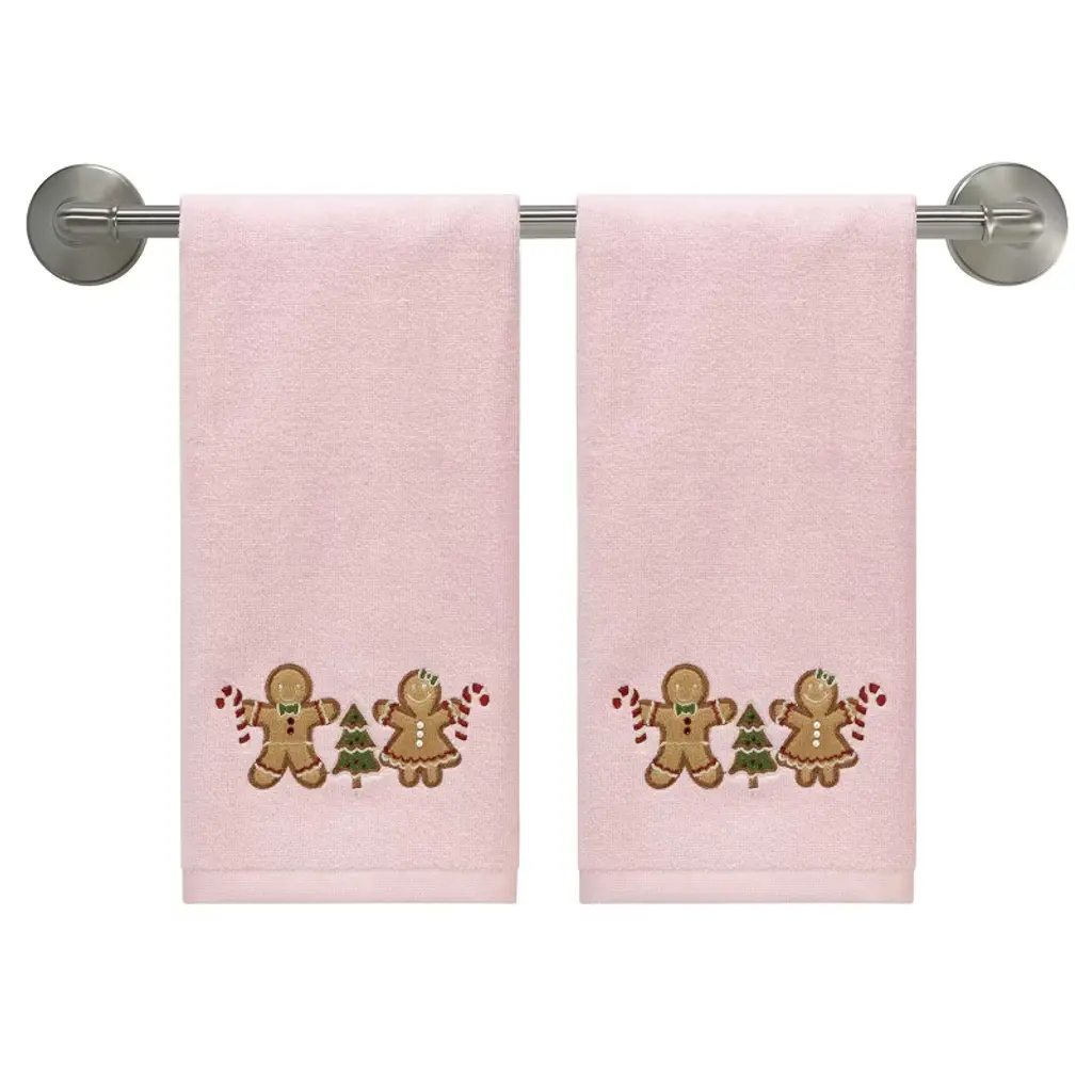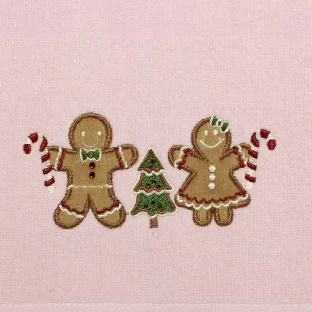 The Avanti Gingerbread People Decorative Embroidered Hand Towel 2-Pack features the happy gingerbread couple holding candy canes with a Christmas tree in the middle. The buttons are faux crystals and faux pearls for added dimension and bling. The towels are 16" x 28" 100% cotton pink velour.