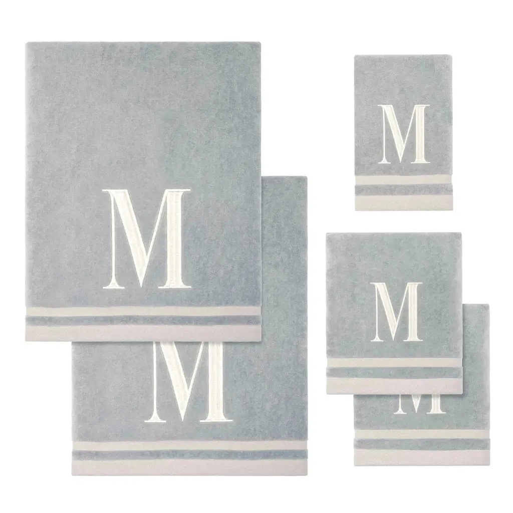 The Avanti "M" 5-Piece Grey and Ivory Monogram Towel Set features an embroidered ivory capital block letter "M" on a light grey velour towel with 2 coordinating ivory woven polyester stripes. 100% cotton towel set includes two 27" x 52" bath, two 16" x 28" hand and one 11" x 18" fingertip.