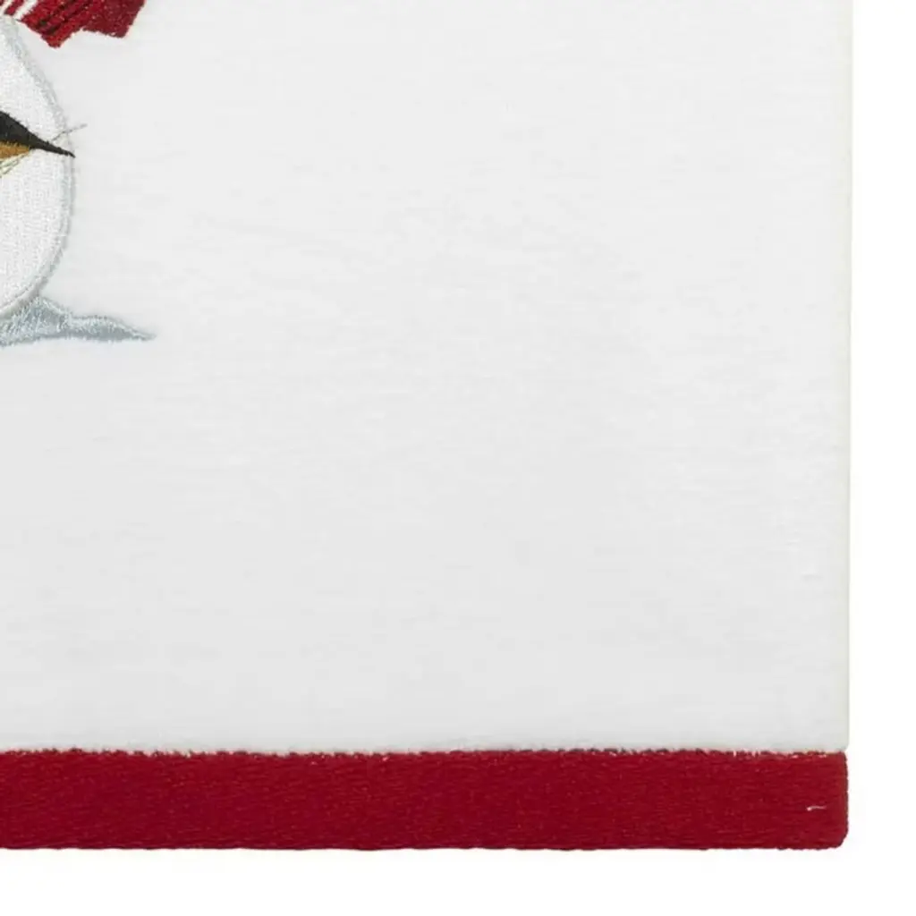 The Avanti Holiday Cheer Decorative Embroidered Bath Towel 2-Pack features a smiling snowman with a red, black and white striped hat and scarf and snowflakes with colorful birds at his base. The 100% cotton 27" x 50" velour towels are finished with a red polyester border. Other pieces available.