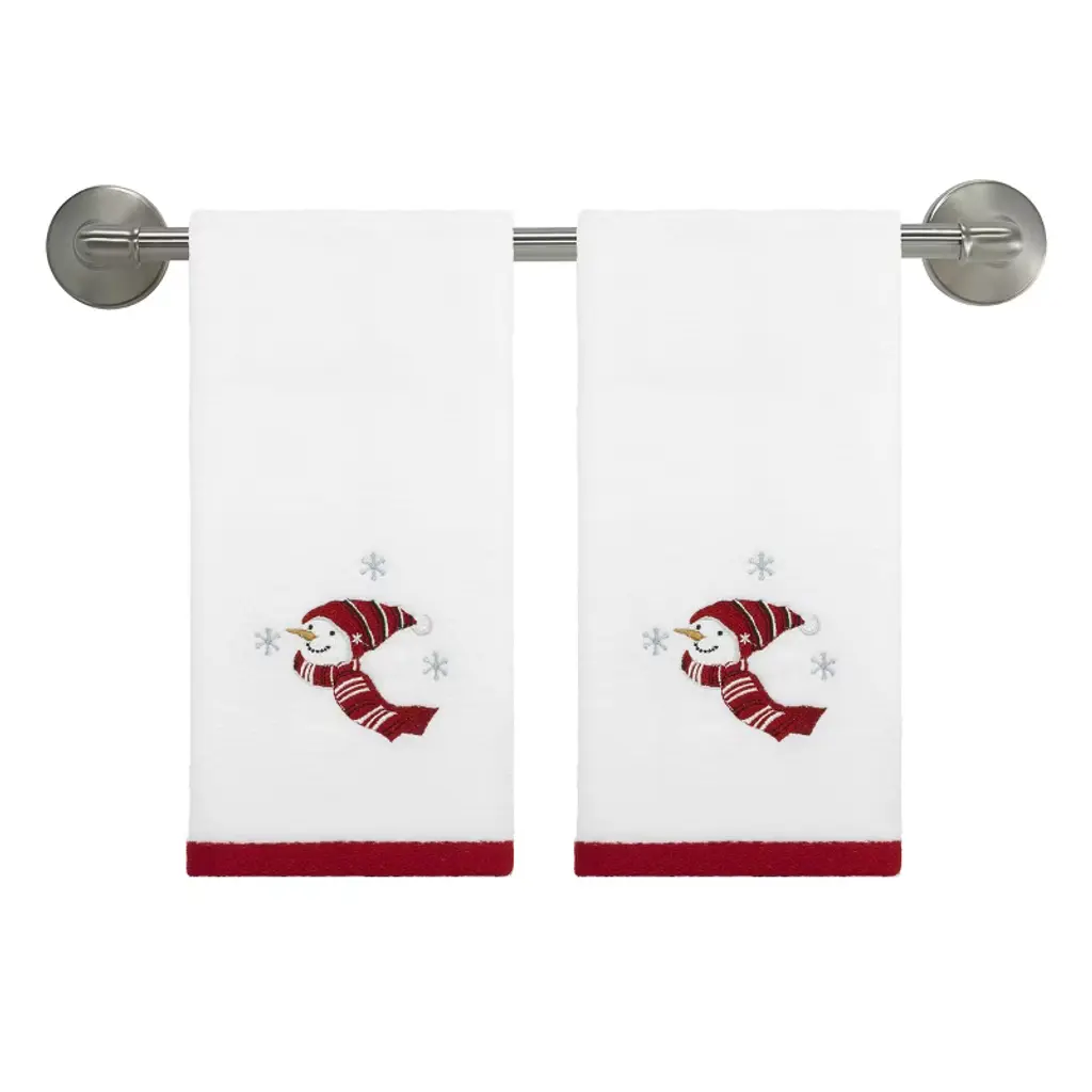 The Avanti Holiday Cheer Decorative Embroidered Fingertip Towel 4-Pack features a smiling snowman's head with a red, black and white striped hat and scarf surrounded by snowflakes. The 100% cotton 11" x 18" velour towels are finished with a red polyester border. Other pieces available.