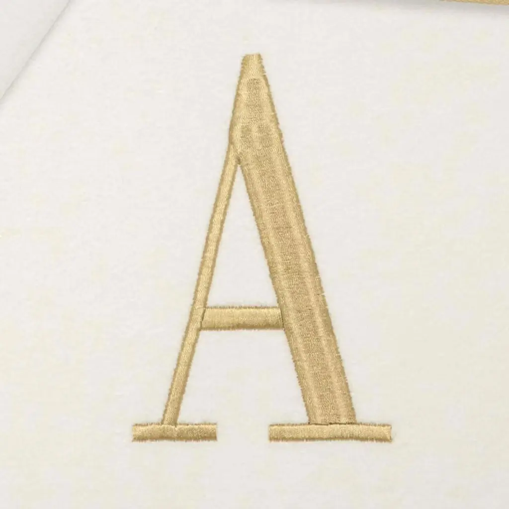 The Avanti "A" 3-Piece Ivory and Gold Monogram Towel Set features an embroidered gold capital block letter "A" on an ivory velour towel with 2 coordinating gold woven polyester stripes. 100% cotton towel set includes one each of bath (27" x 52"), hand (16" x 28") and fingertip (11" x 18".