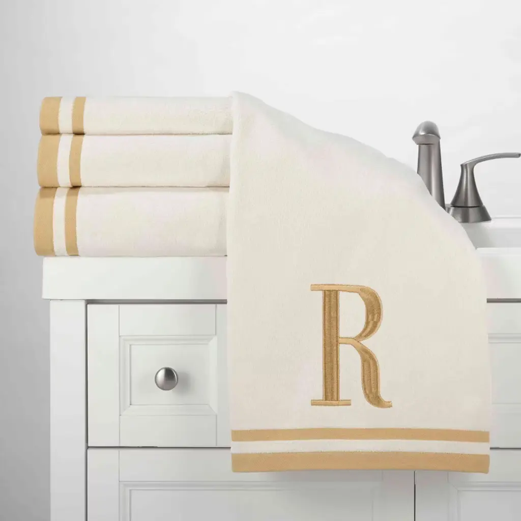 The Avanti "R" 3-Piece Ivory and Gold Monogram Towel Set features an embroidered gold capital block letter "R" on an ivory velour towel with 2 coordinating gold woven polyester stripes. 100% cotton towel set includes one each of bath (27" x 52"), hand (16" x 28") and fingertip (11" x 18".